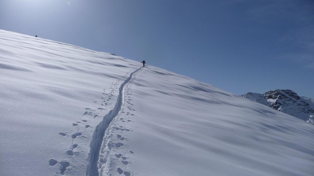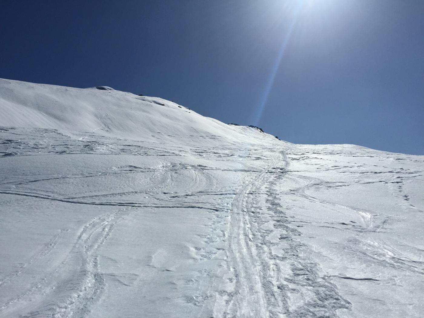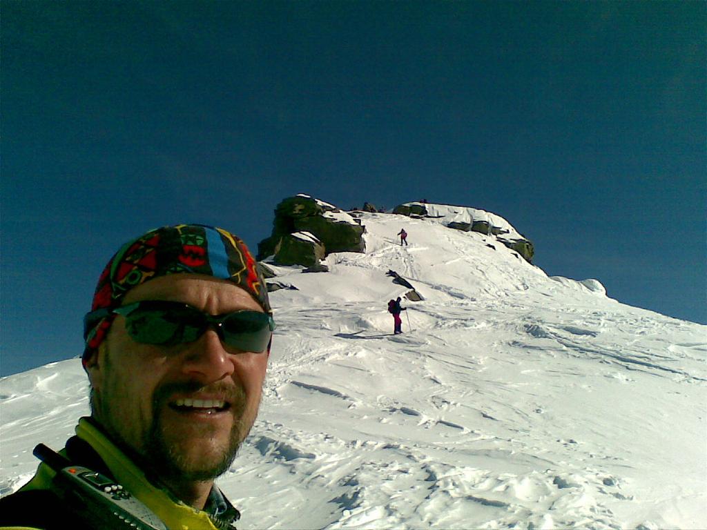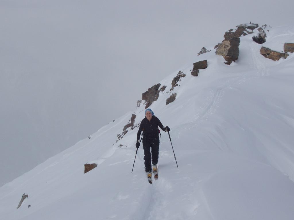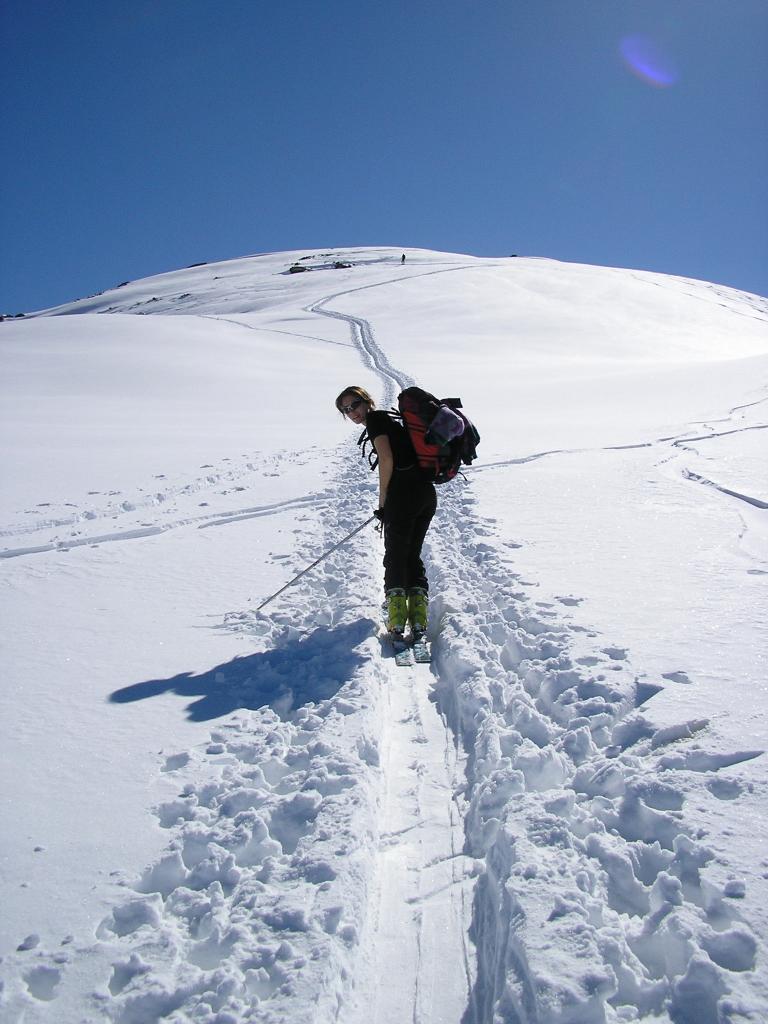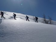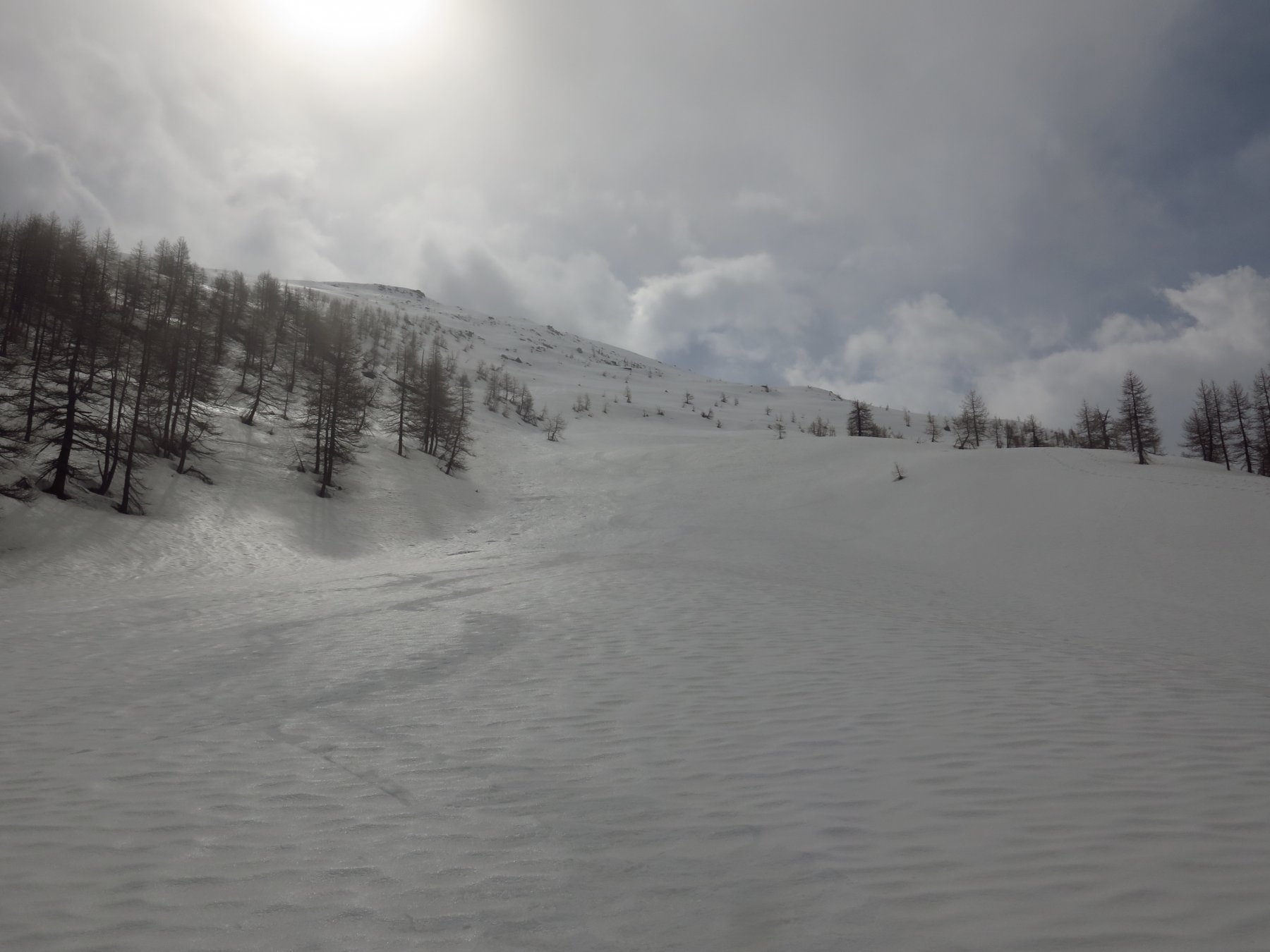Qui svoltare a dx e continuare a salire per bei terreni verso SE, fino sotto la verticale della vetta. Per più ripidi pendii e qualche roccetta in breve alla sommità.