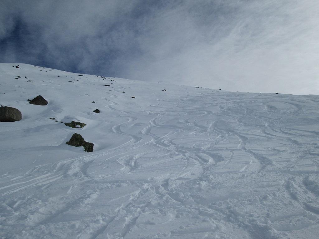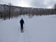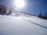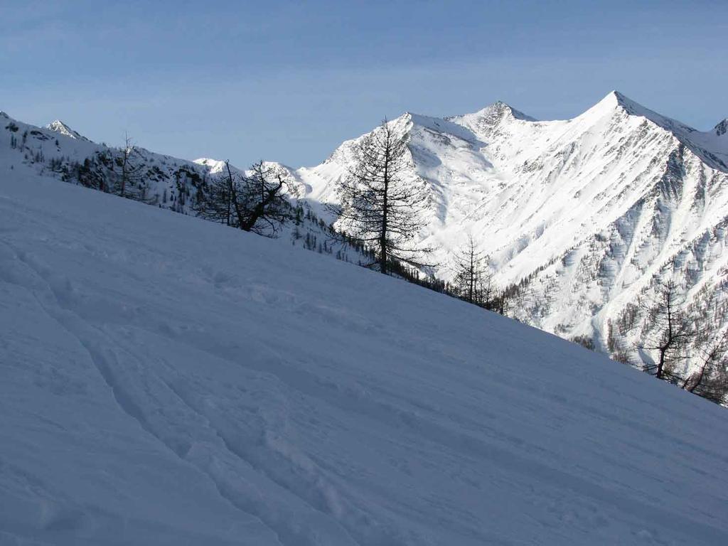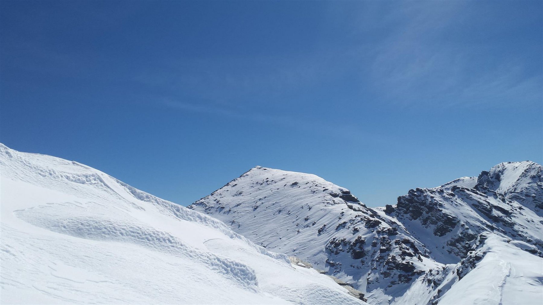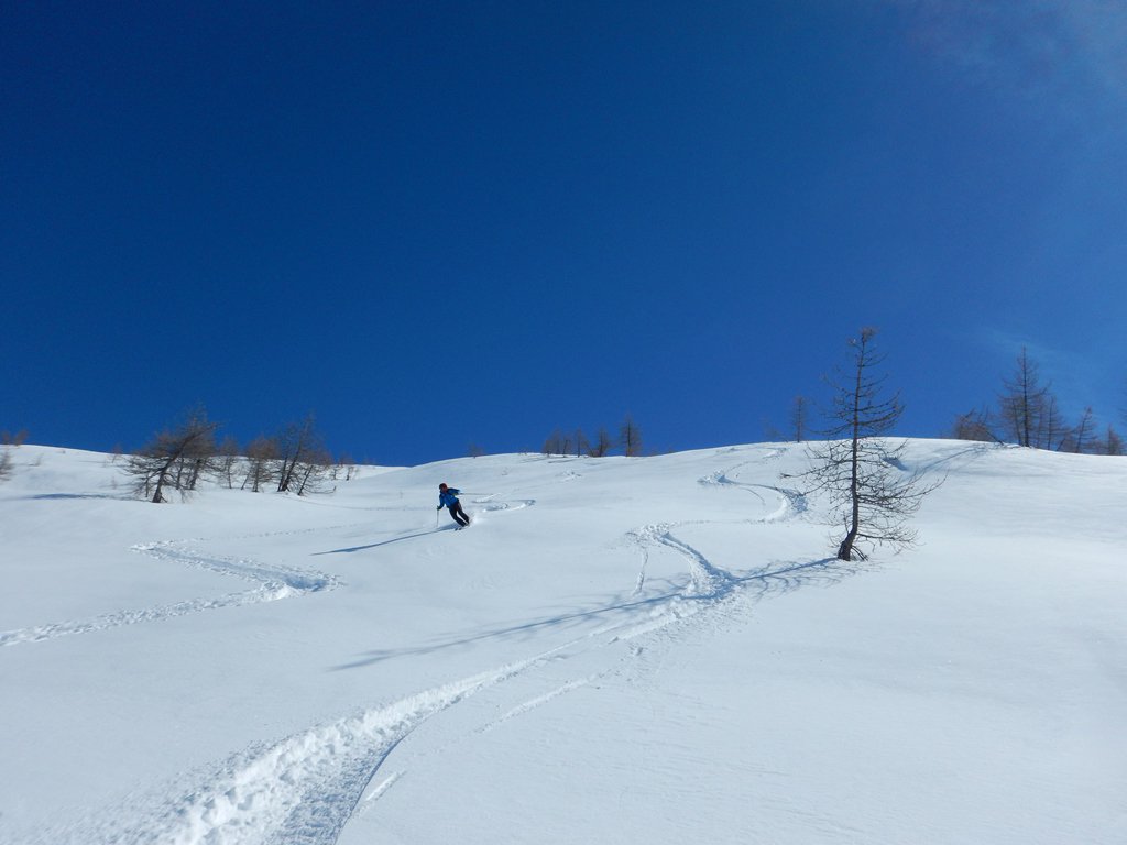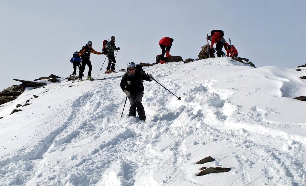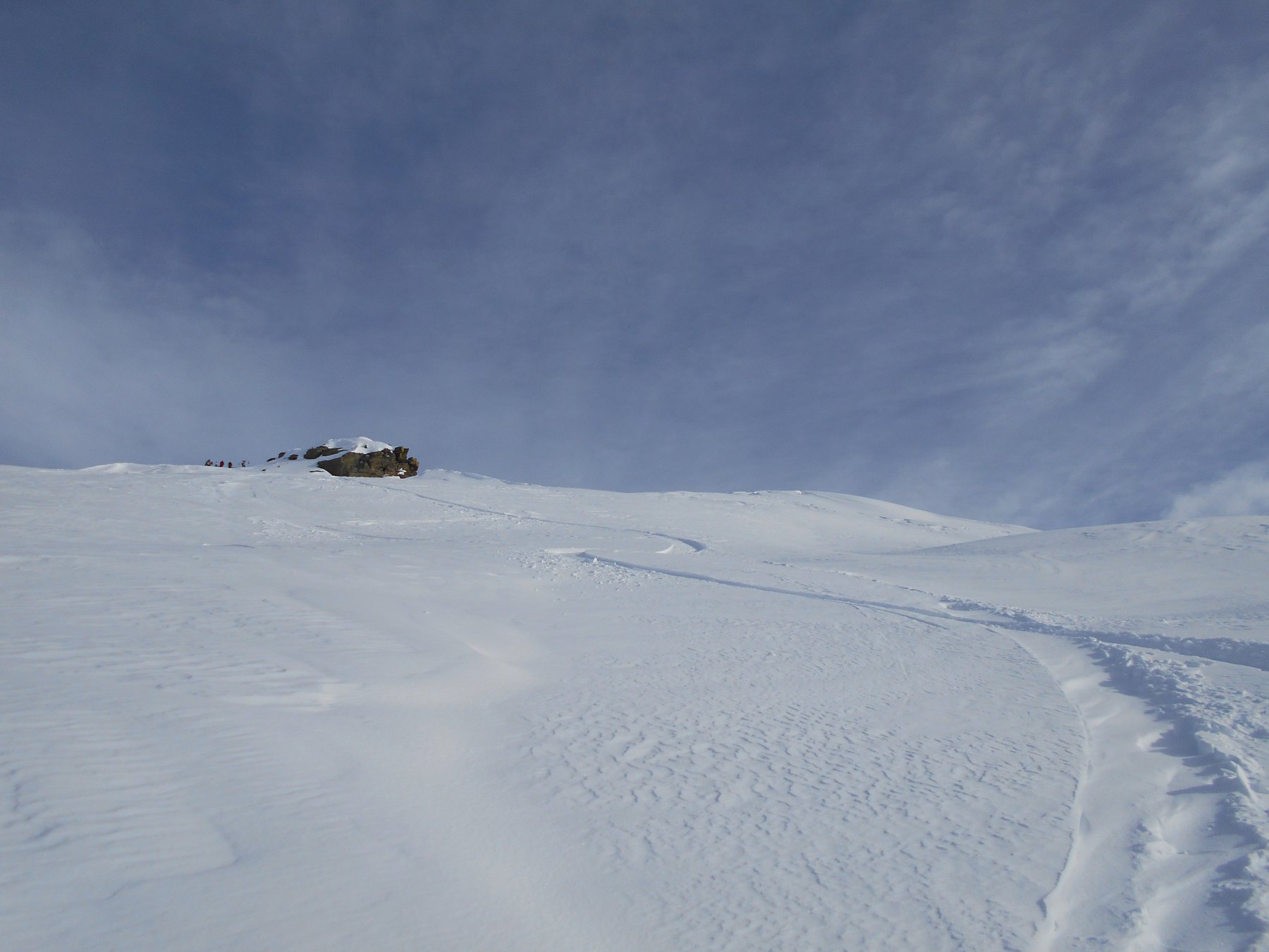 Qui svoltare a dx e continuare a salire per bei terreni verso SE, fino sotto la verticale della vetta. Per più ripidi pendii e qualche roccetta in breve alla sommità.