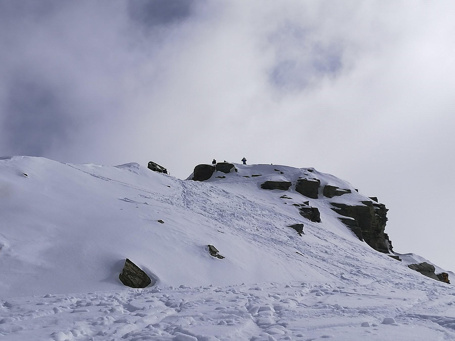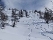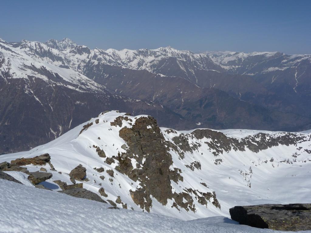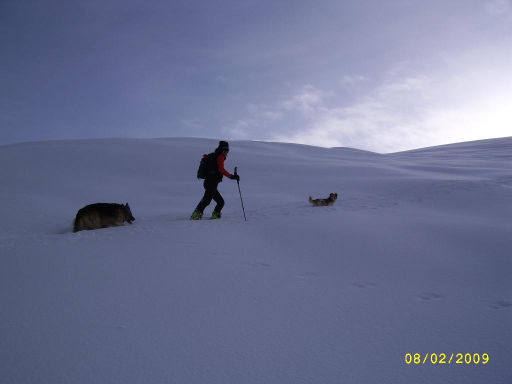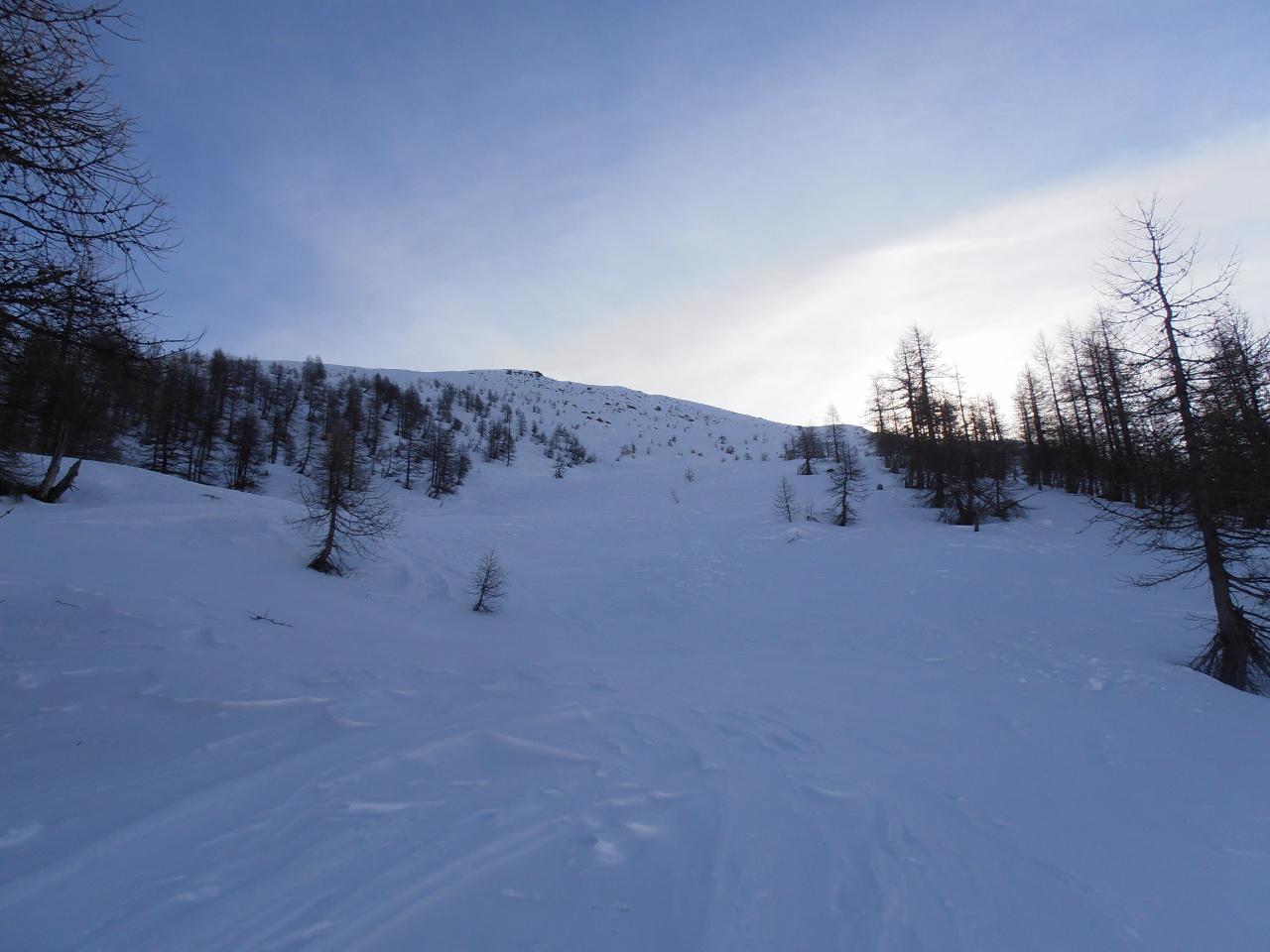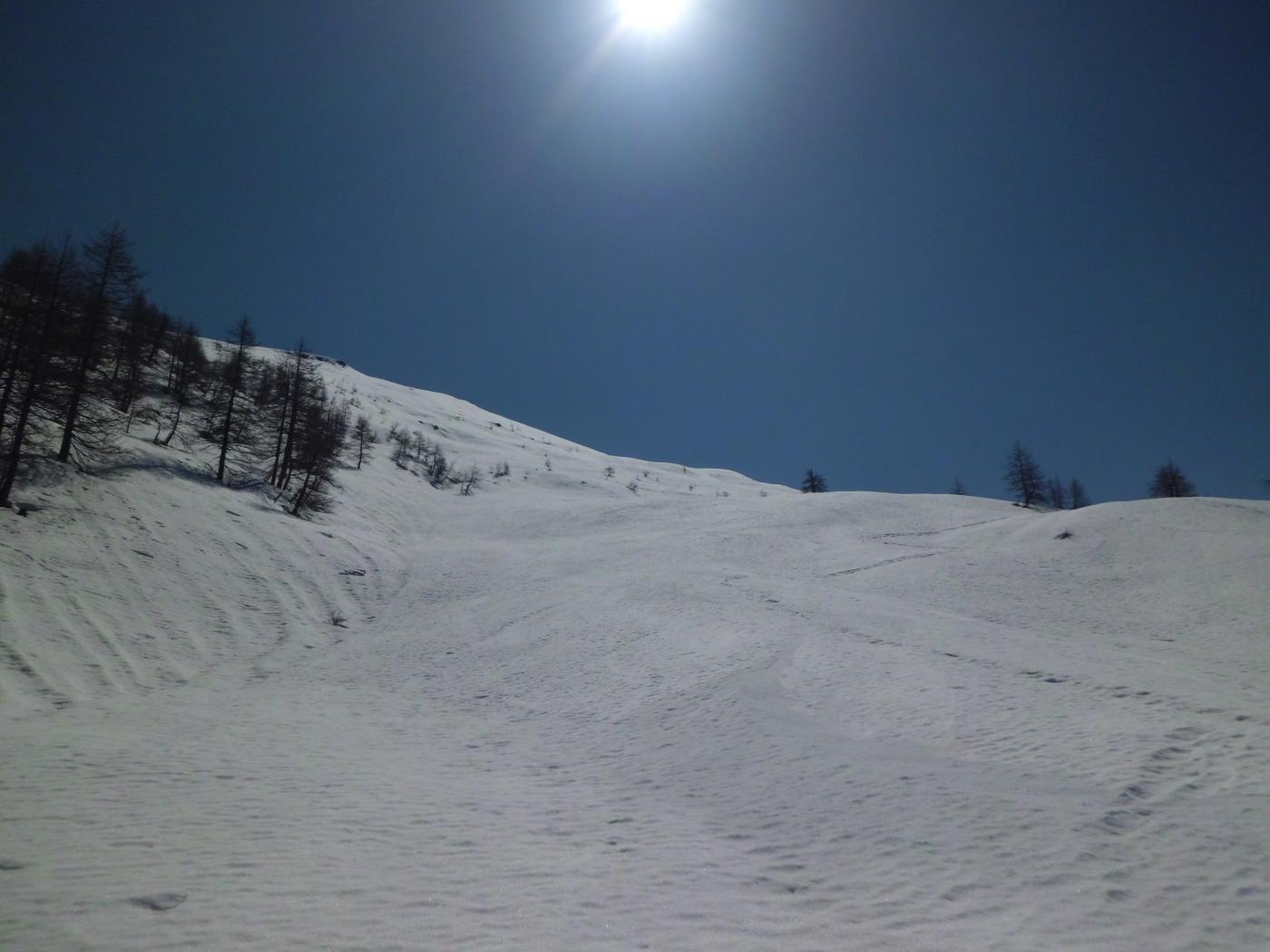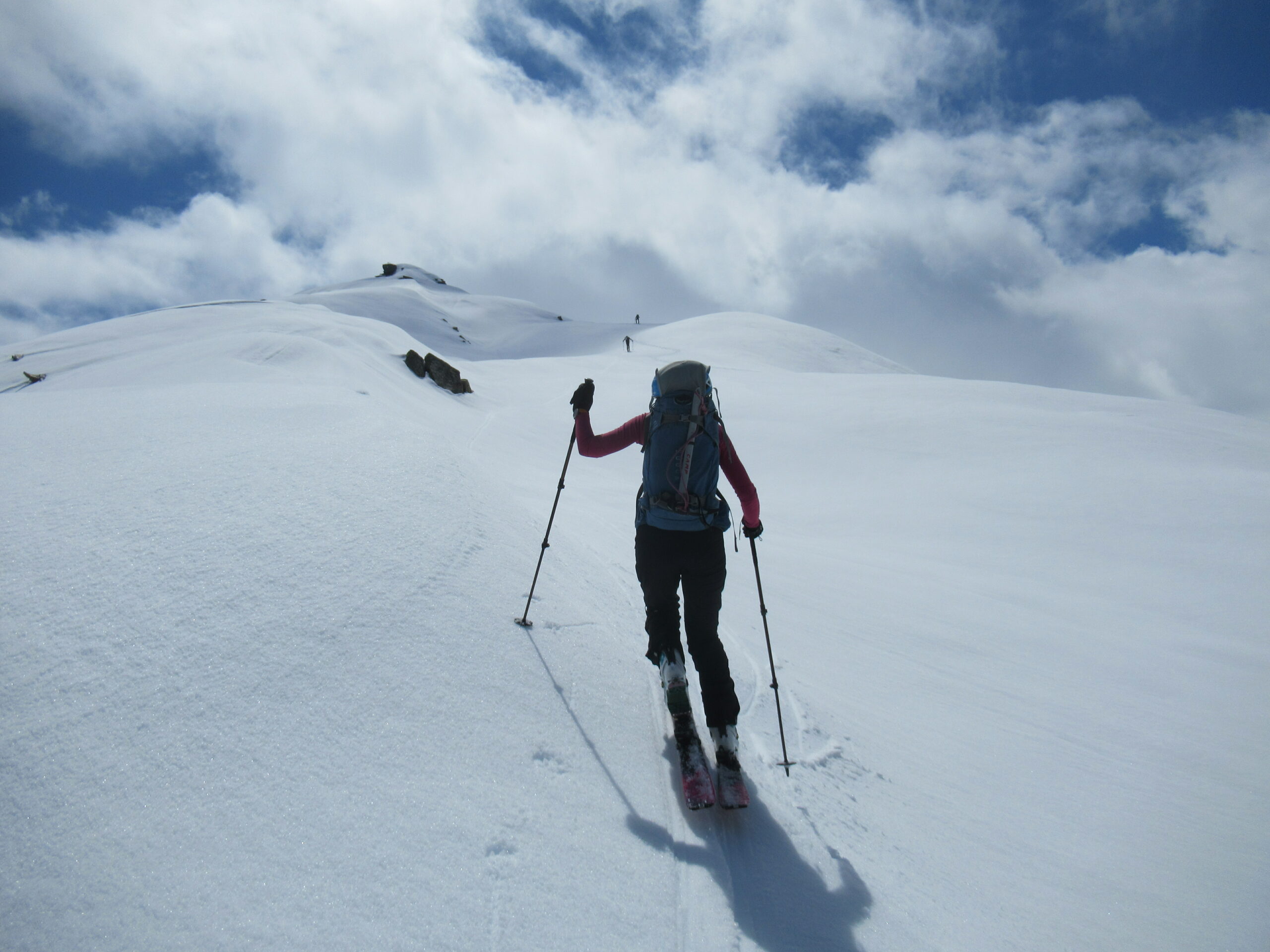 Qui svoltare a dx e continuare a salire per bei terreni verso SE, fino sotto la verticale della vetta. Per più ripidi pendii e qualche roccetta in breve alla sommità.