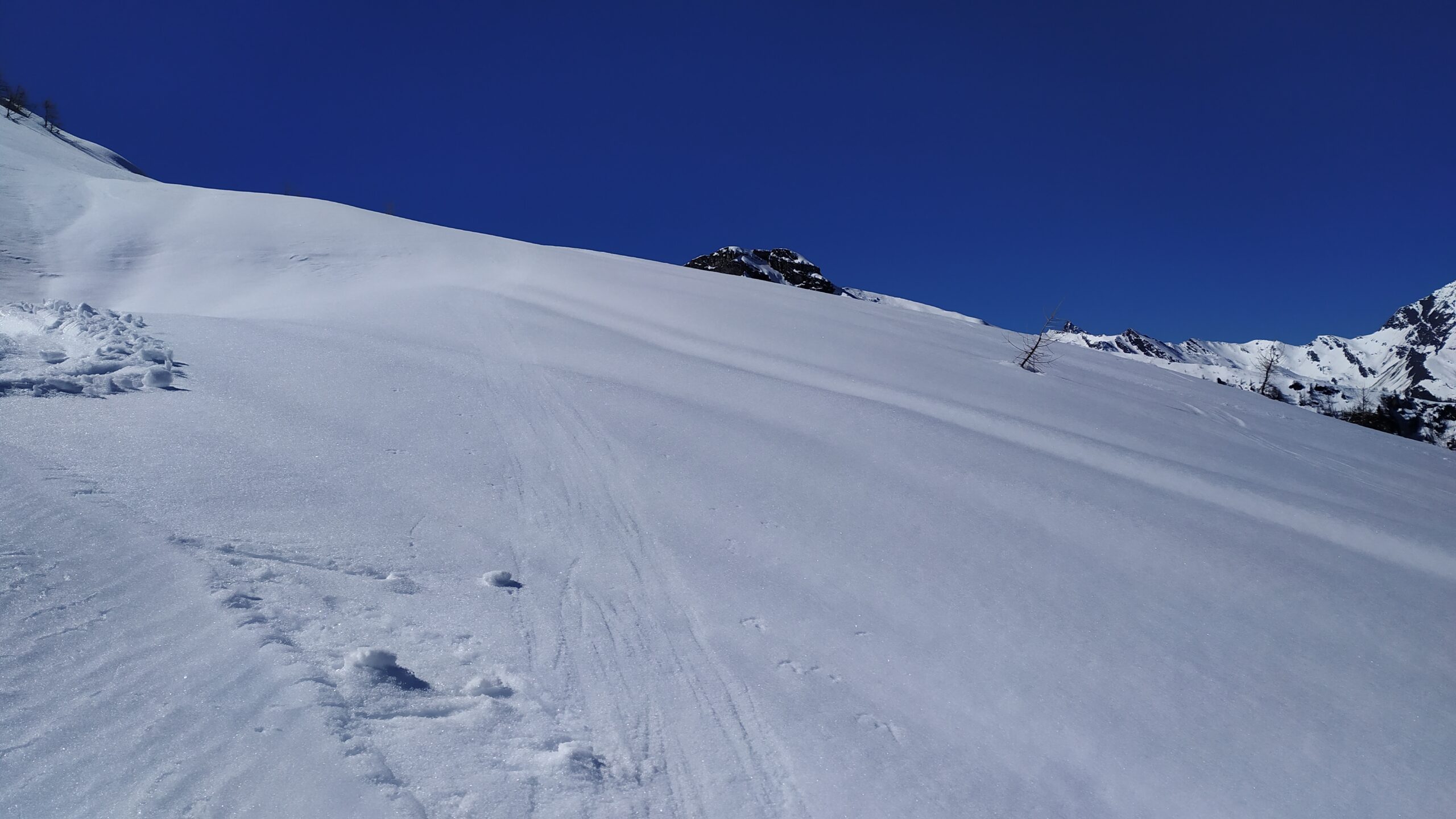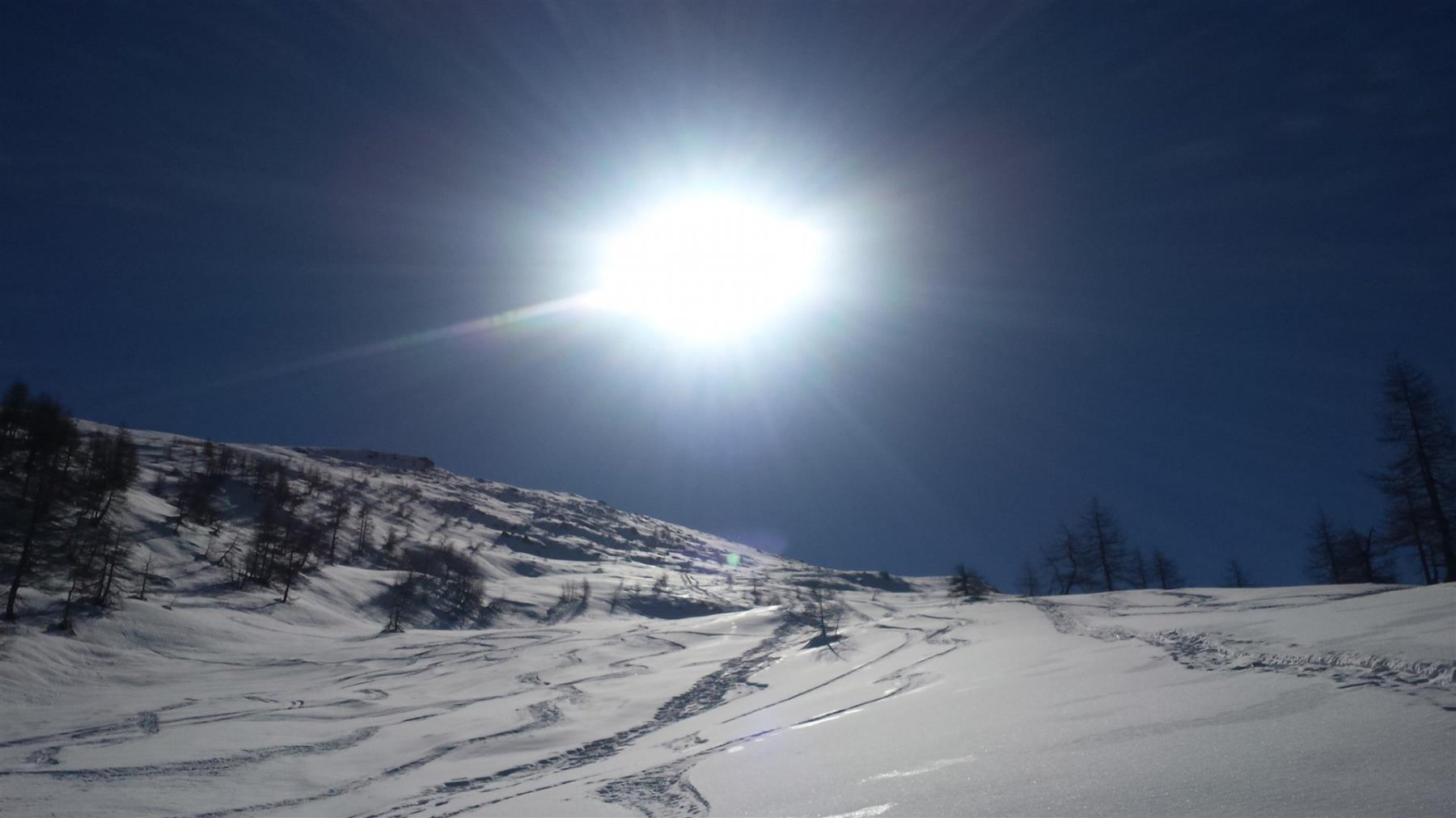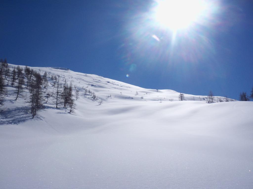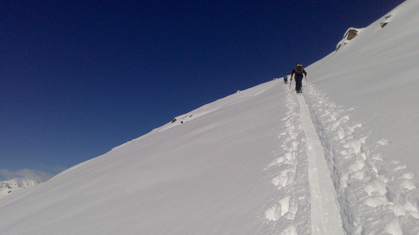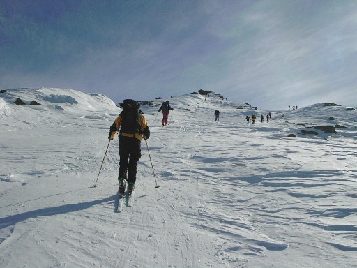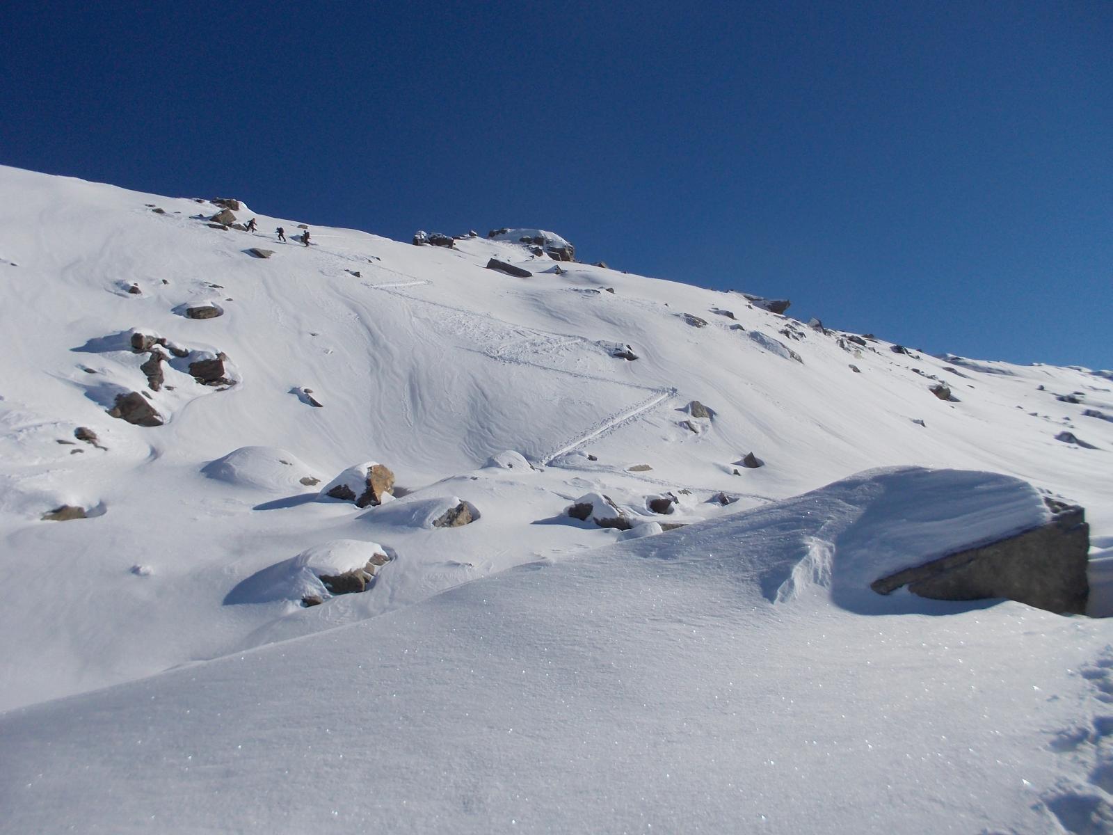 Qui svoltare a dx e continuare a salire per bei terreni verso SE, fino sotto la verticale della vetta. Per più ripidi pendii e qualche roccetta in breve alla sommità.