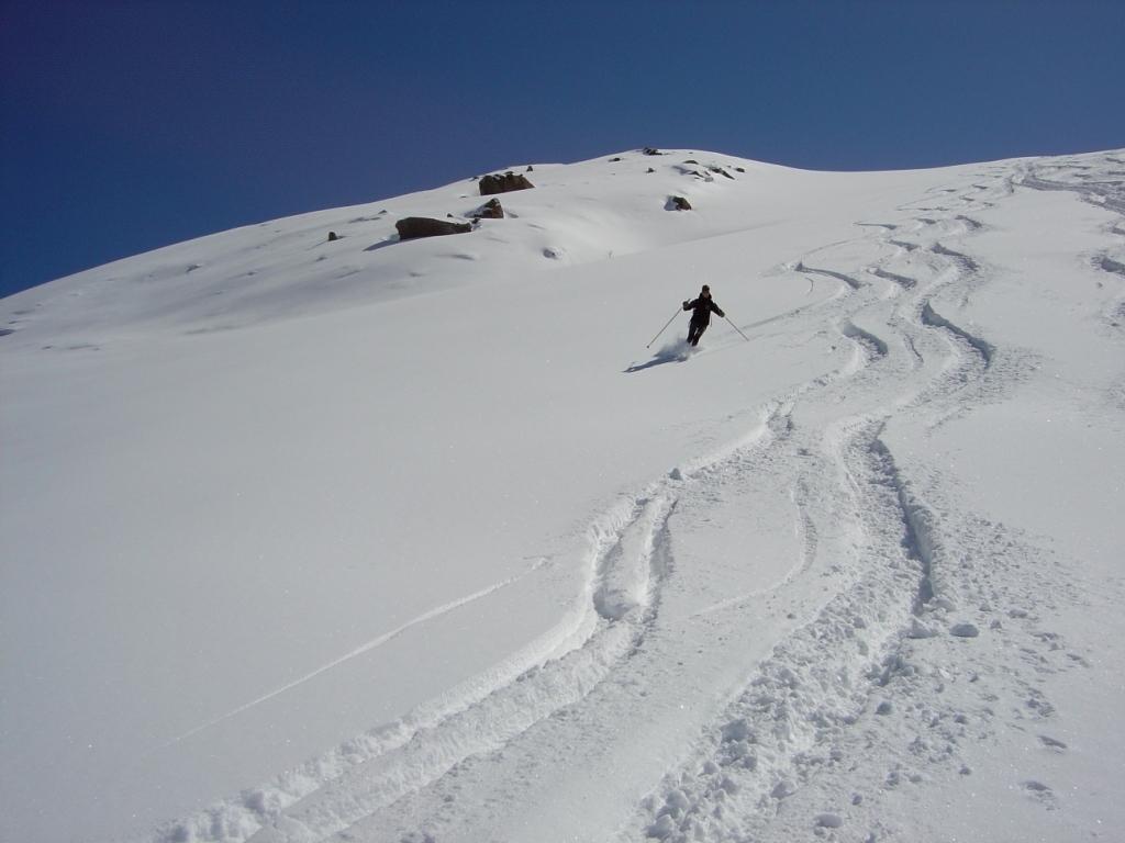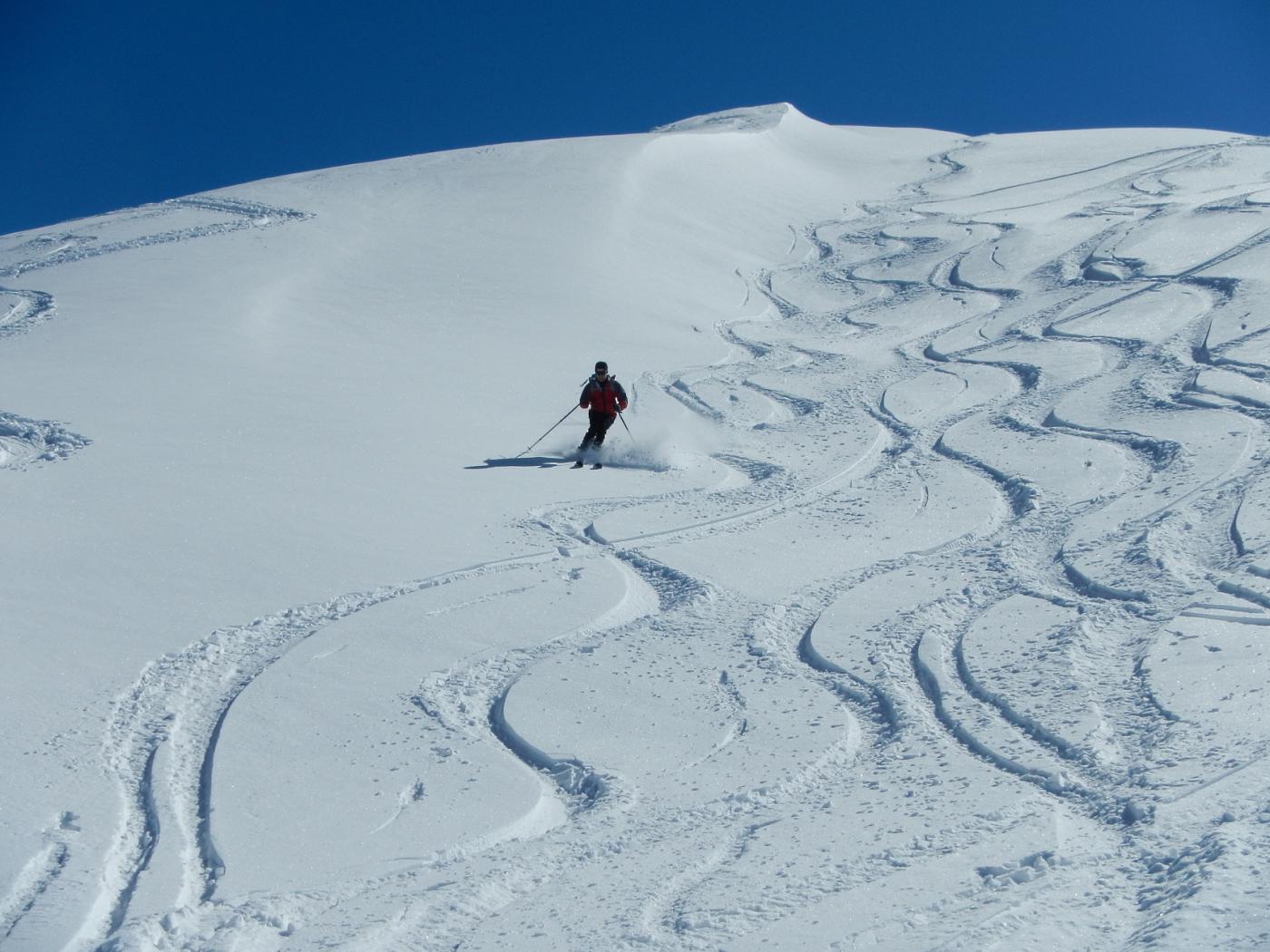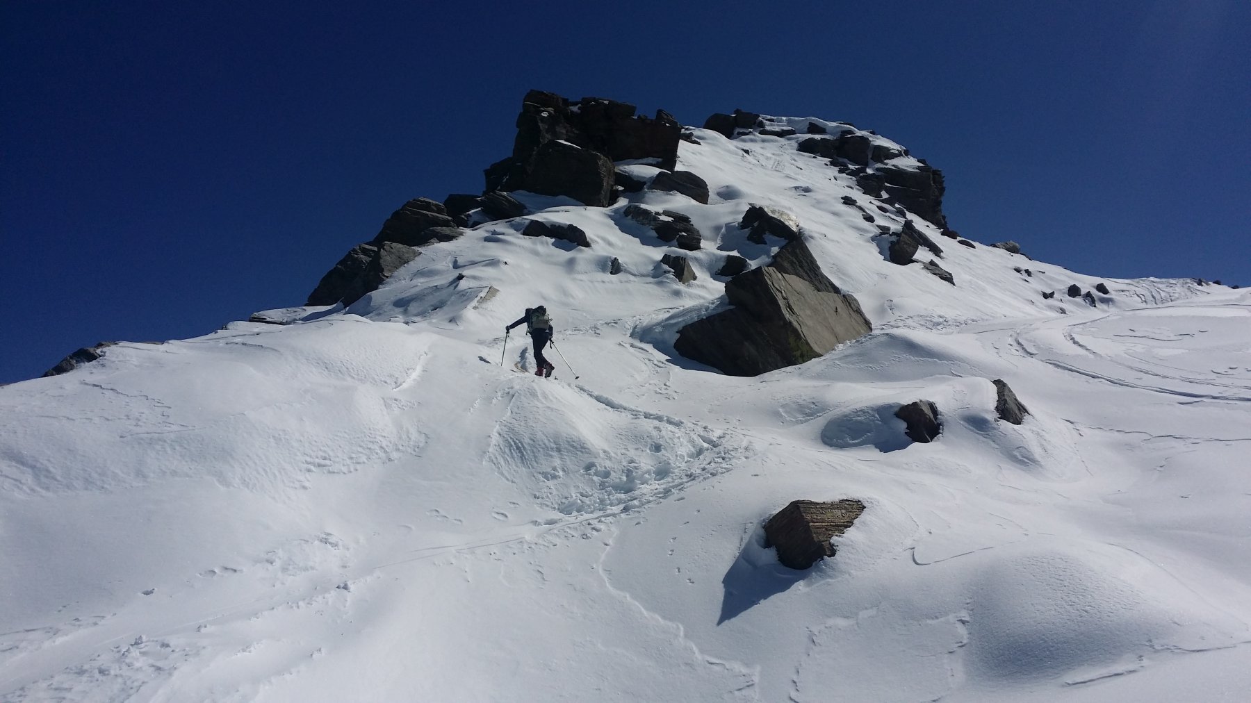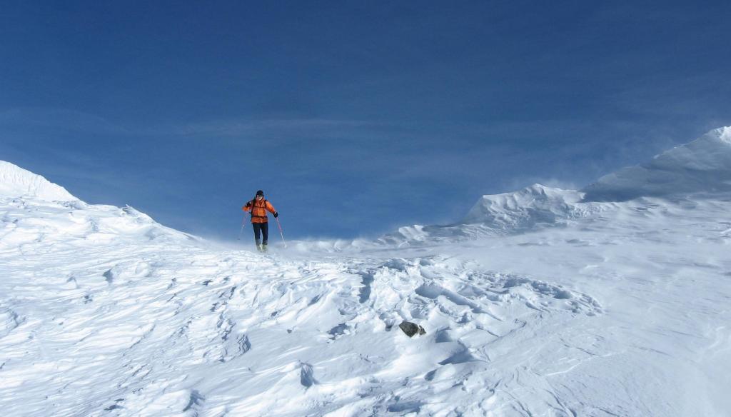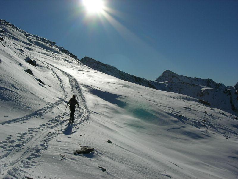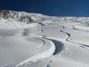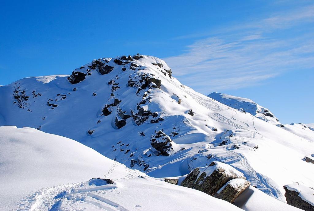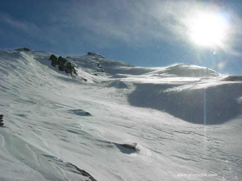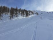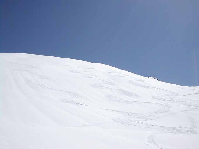 Qui svoltare a dx e continuare a salire per bei terreni verso SE, fino sotto la verticale della vetta. Per più ripidi pendii e qualche roccetta in breve alla sommità.