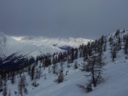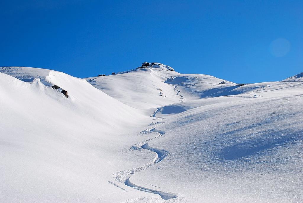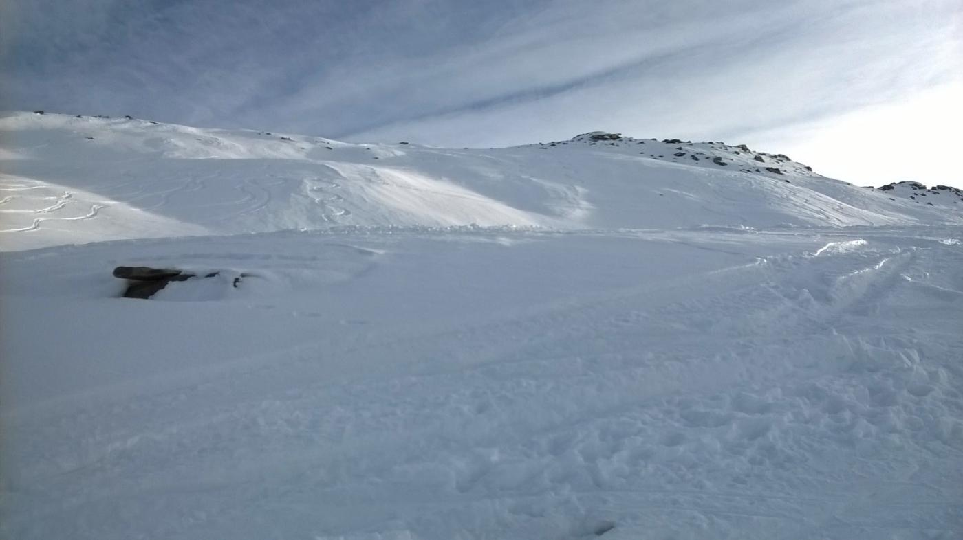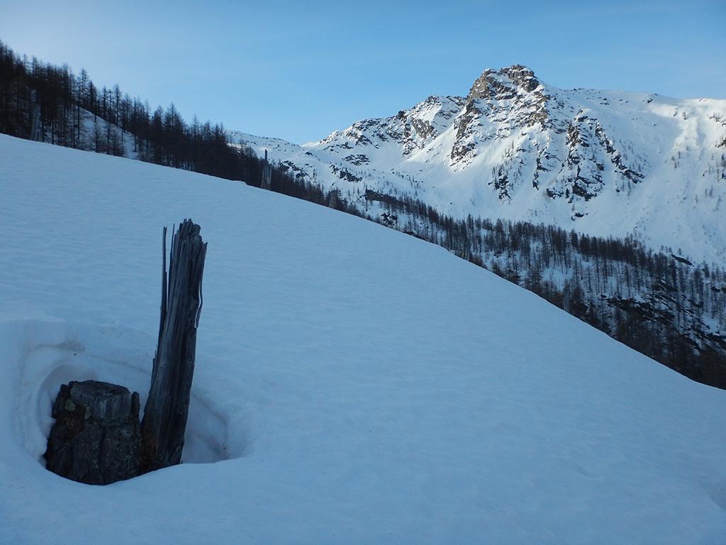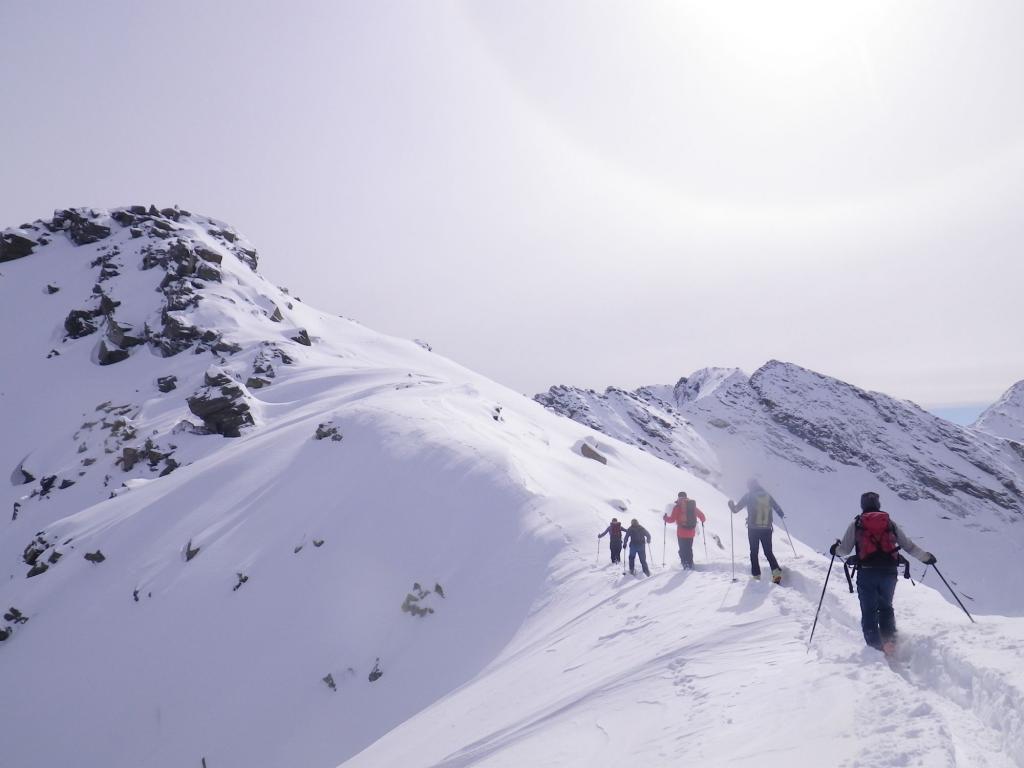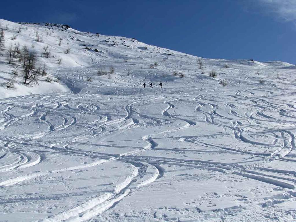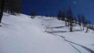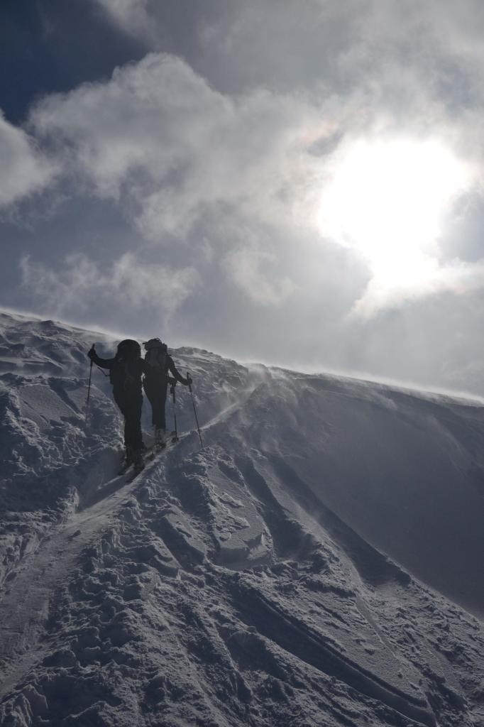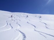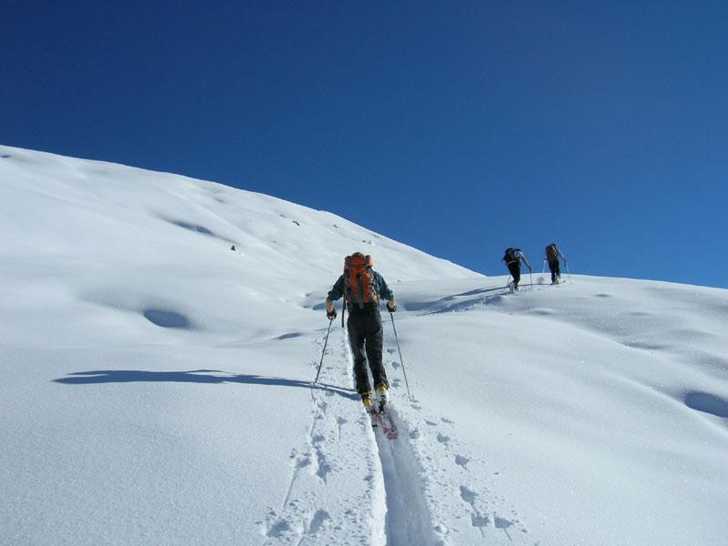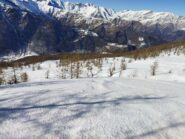 Qui svoltare a dx e continuare a salire per bei terreni verso SE, fino sotto la verticale della vetta. Per più ripidi pendii e qualche roccetta in breve alla sommità.