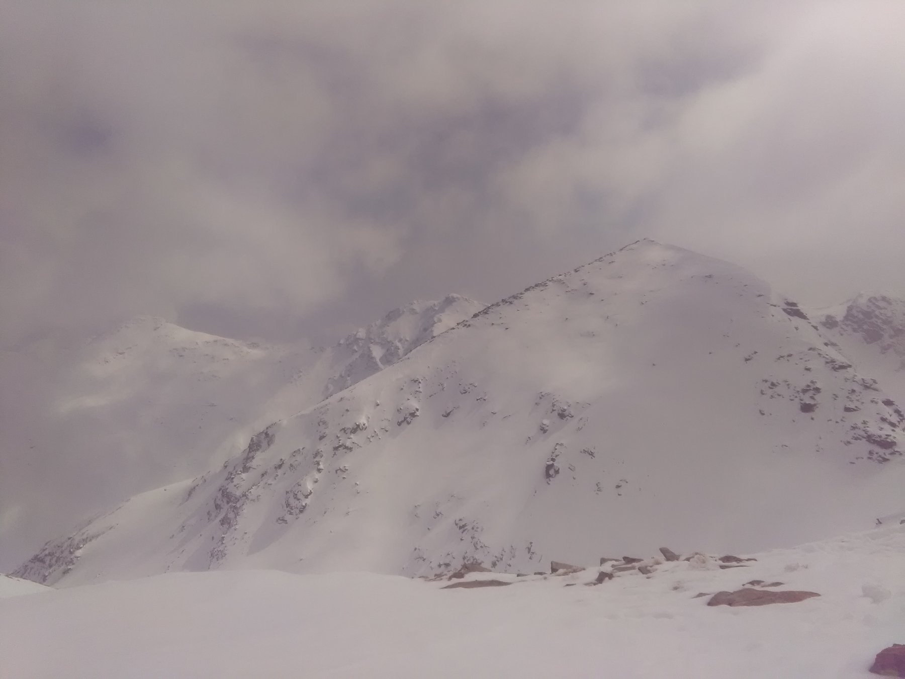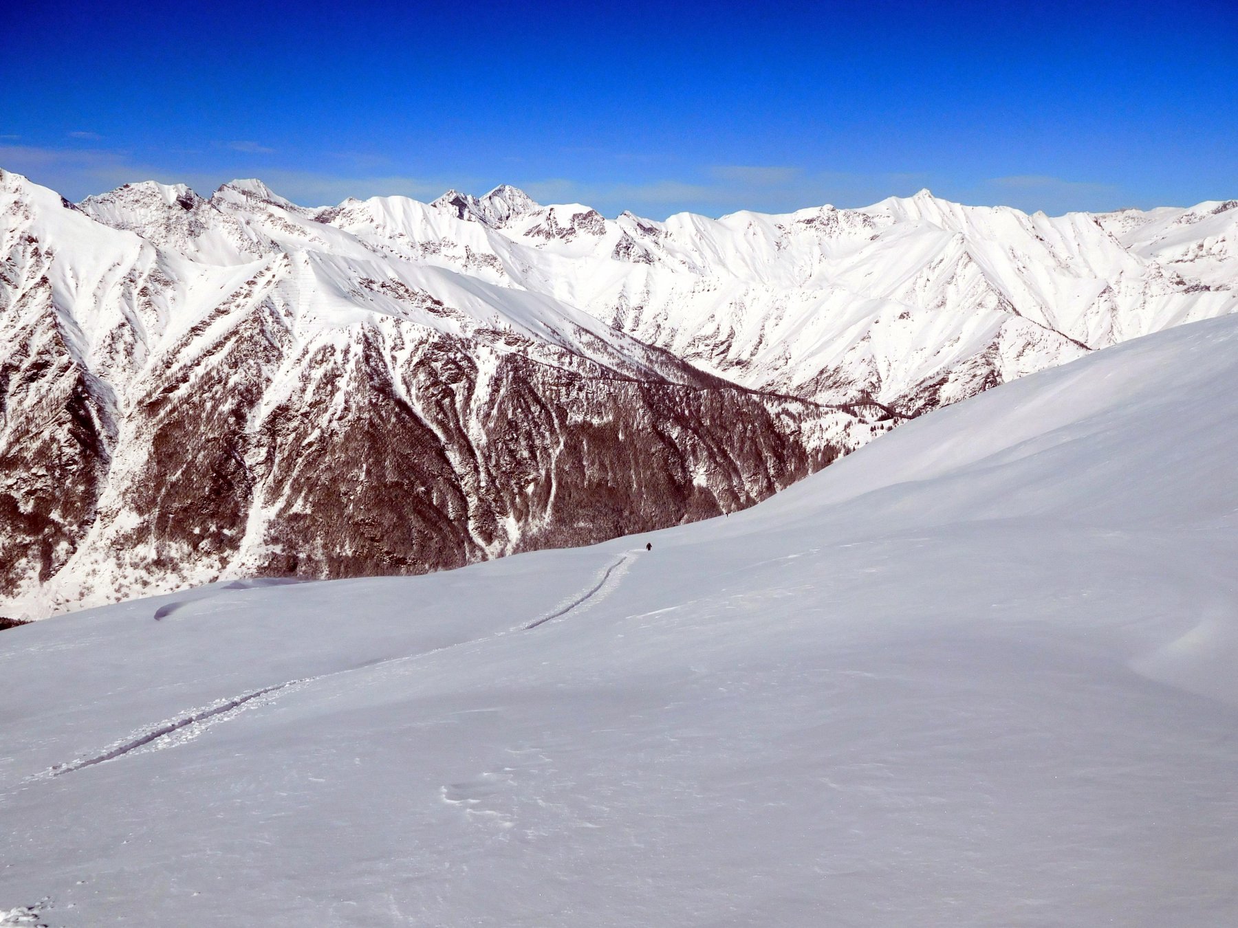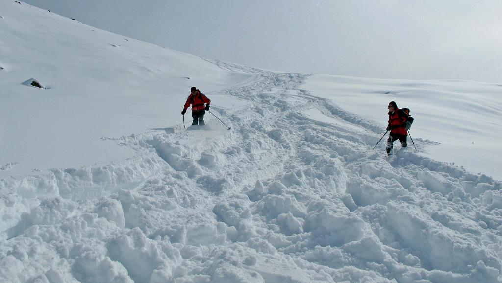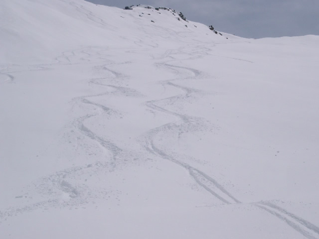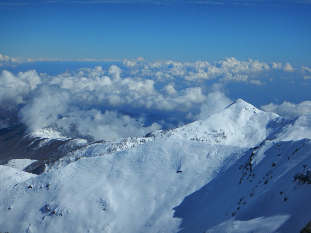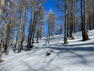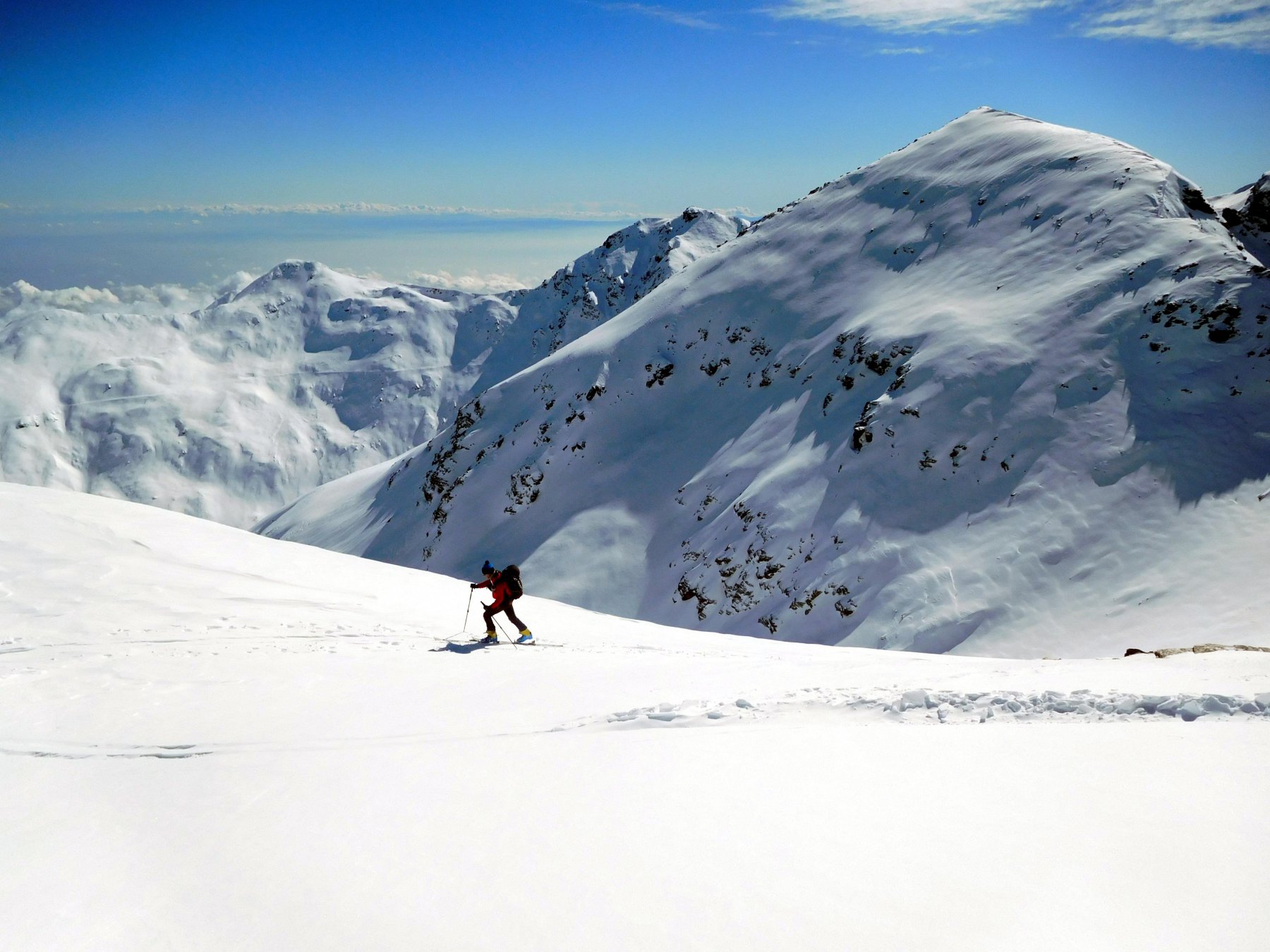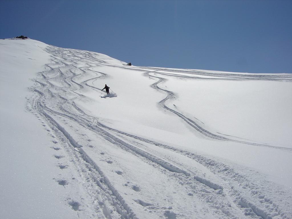 Qui svoltare a dx e continuare a salire per bei terreni verso SE, fino sotto la verticale della vetta. Per più ripidi pendii e qualche roccetta in breve alla sommità.