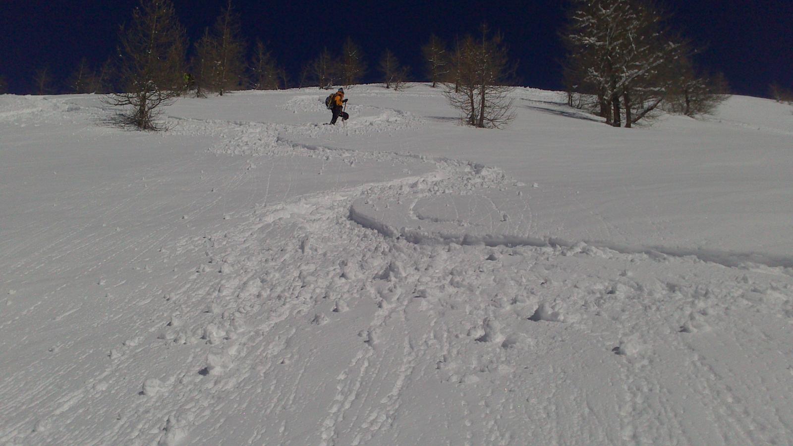 Partiti direttamente da Ghigo salendo i boschi del vecchio “bosco nero” (direttamente partenza davanti a casa con gli sci!!) in direzione di Punta Founset. Giunti al pendio supra il lago di Envie abbiamo constatato che lo strato di bella farina poggiato sulla crosta sottostante era gia’ stato pettinato da un po’ di aria e tendeva a non rimanere al suo posto.. girato le punte degli sci e con un lungo traverso, a tratti delicato, ci siamo collegati all’autostrada per Cima delle Liste, imballata di gente.. per fortuna siamo scesi prima noi pero’ 🙂