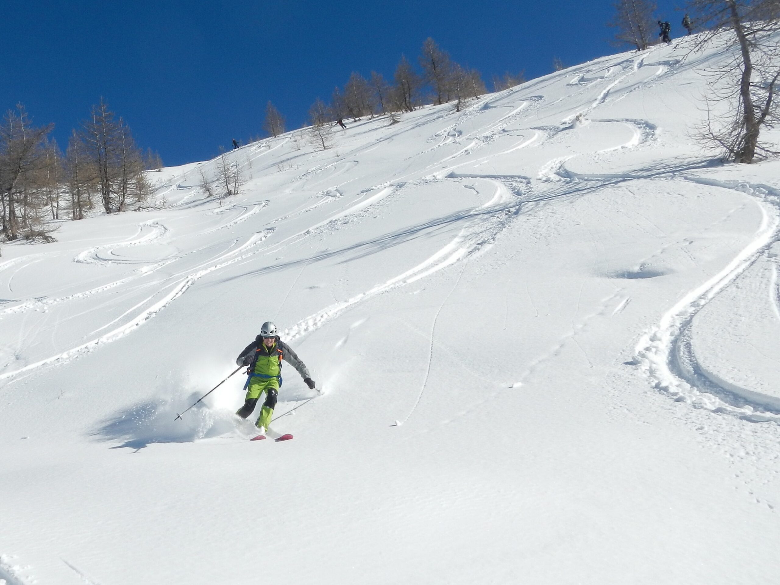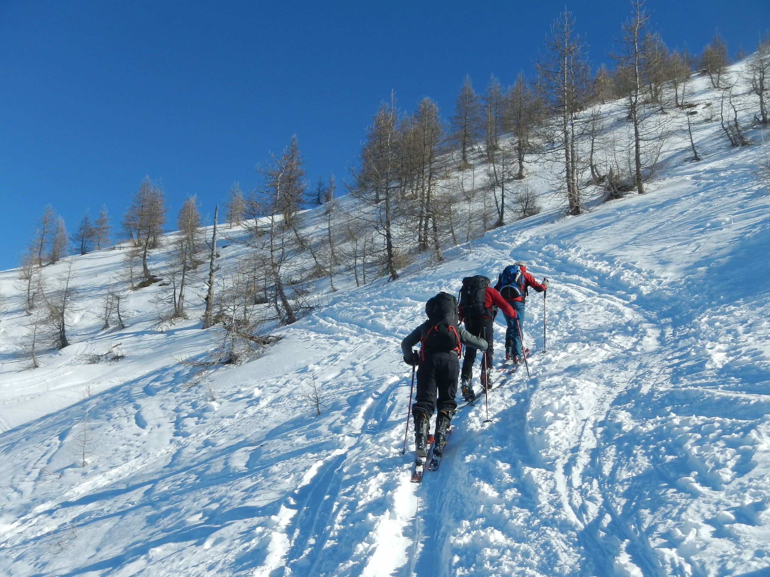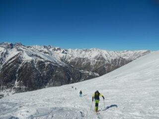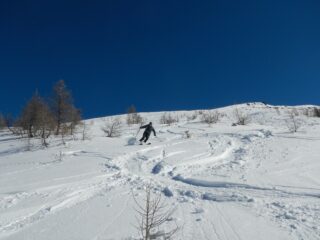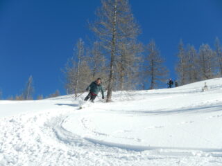 Itinerario ormai molto segnato dai numerosi passaggi ma la neve è ancora ben sciabile, in particolare sui pendii esposti a nord est.