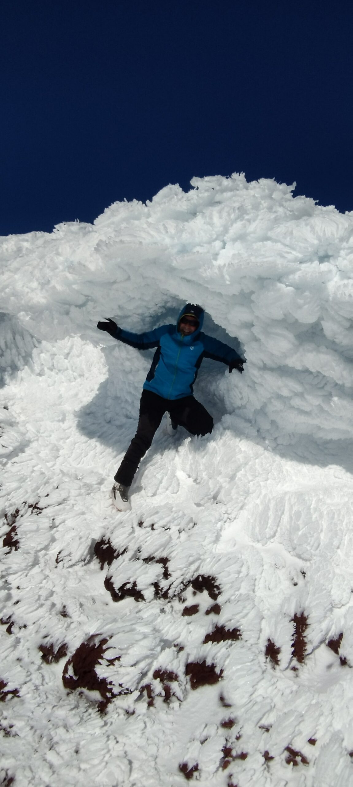 Raggiunta la cumba (cima in Cileno) paesaggio lunare, buchi e grotte create dal vento e stalagmiti di ghiaccio orizzontali.