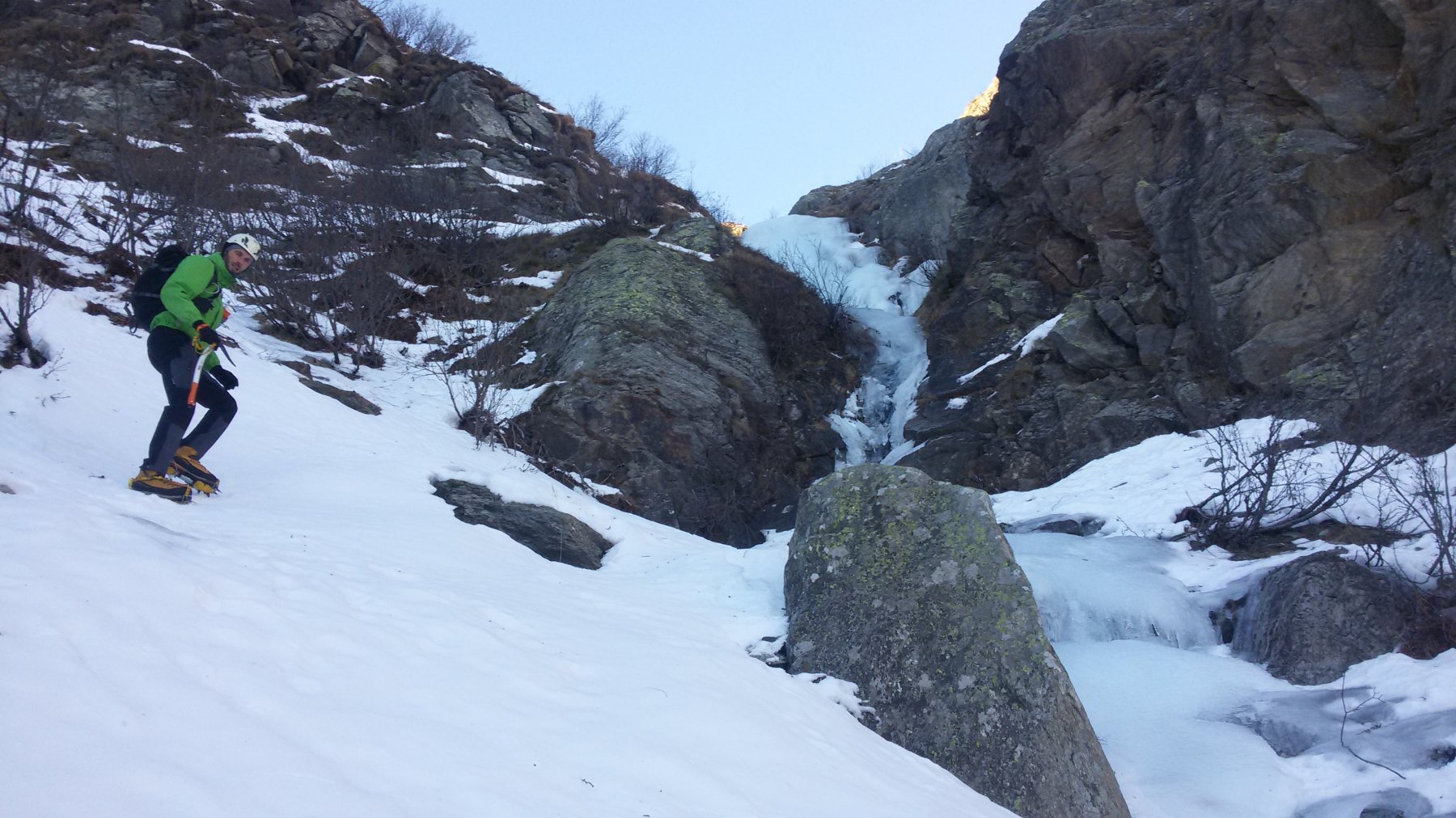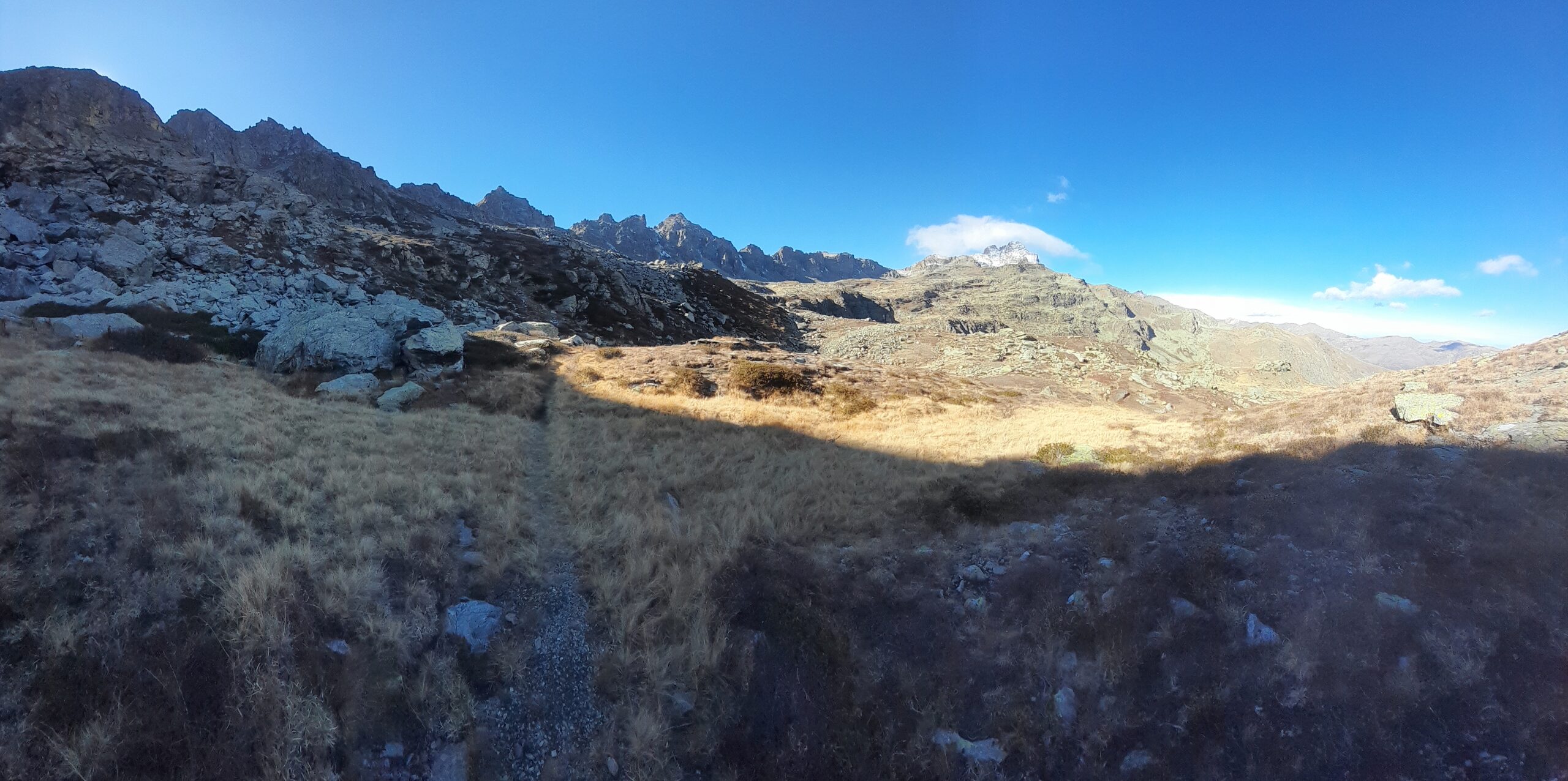 Giunti nei pressi di un’alpeggio, la strada finisce, si attraversa allora il rio e risale un valloncello laterale, dall’altro lato del vallone, imboccando una traccia di sentiero che si diparte dai pressi di una baita ristrutturata.