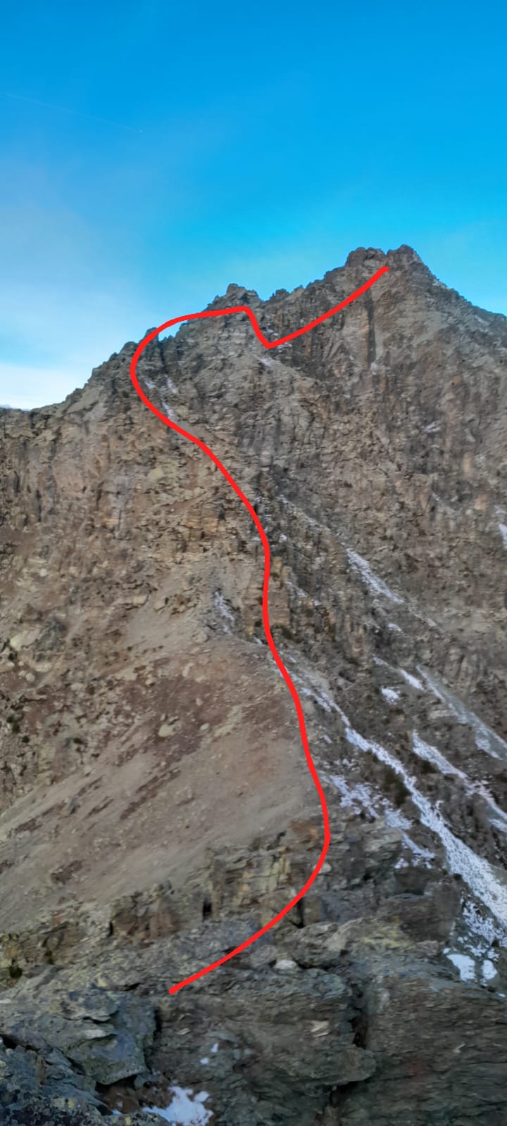 Da cima delle Guglie proseguire verso il colletto sottostante seguendo la cresta e da qui, senza percorso obbligato, rimanere sul filo di cresta aggirando eventualmente i diversi torrioni che caratterizzano il percorso; verso la metà dell’itinerario è presente un ometto sulla sinistra che permette di aggirare un torrione avente una discesa non immediata. Si prosegue sino a incrociare l’uscita del canale NE delle Lobbie e da lì proseguire sino in Vetta.