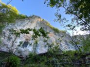 Tornare indietro 10 mt e prendere il sentierino a destra che entra nel bosco in discesa. Seguire la traccia segnata con cordini fucsia fino al prato. Proseguire nel prato fino ad un castagno. Prendere il sentiero a destra in discesa e procedere in saliscendi fino alla falesia che si trova sulla destra. 10 min.