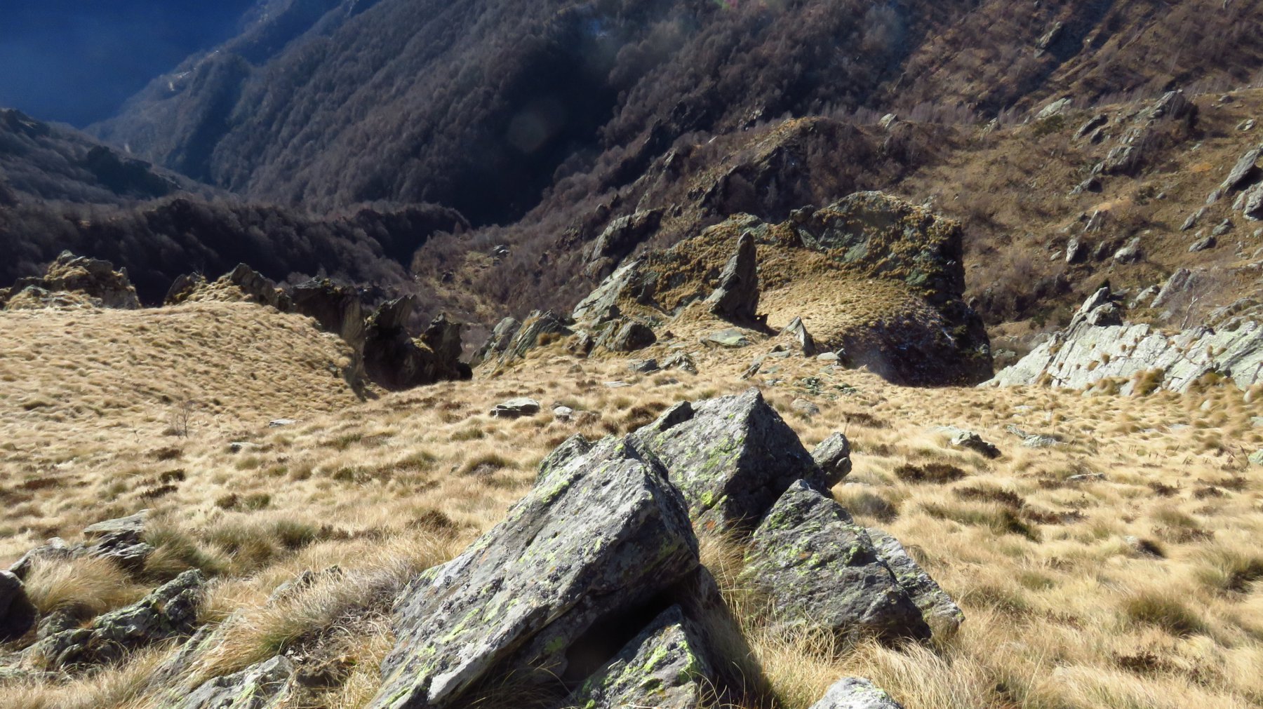 Ritornati alla selletta, si scende il pendio canale erboso verso sud ed al limite della vegetazione arbustiva, piegare a destra e scendere fra i cespugli fino a dei grossi faggi, piegare ancora leggermente a destra e con una breve discesa si raggiunge la baita di quota 1497; dalla baita su pendii un po più aperti, su vaga traccia si scende ad attraversare il Rio Lazie ed a ricongiungersi al sentiero fatto in salita all’Alpe Lazie. Da Lazie ritorno su sentiero di salita.