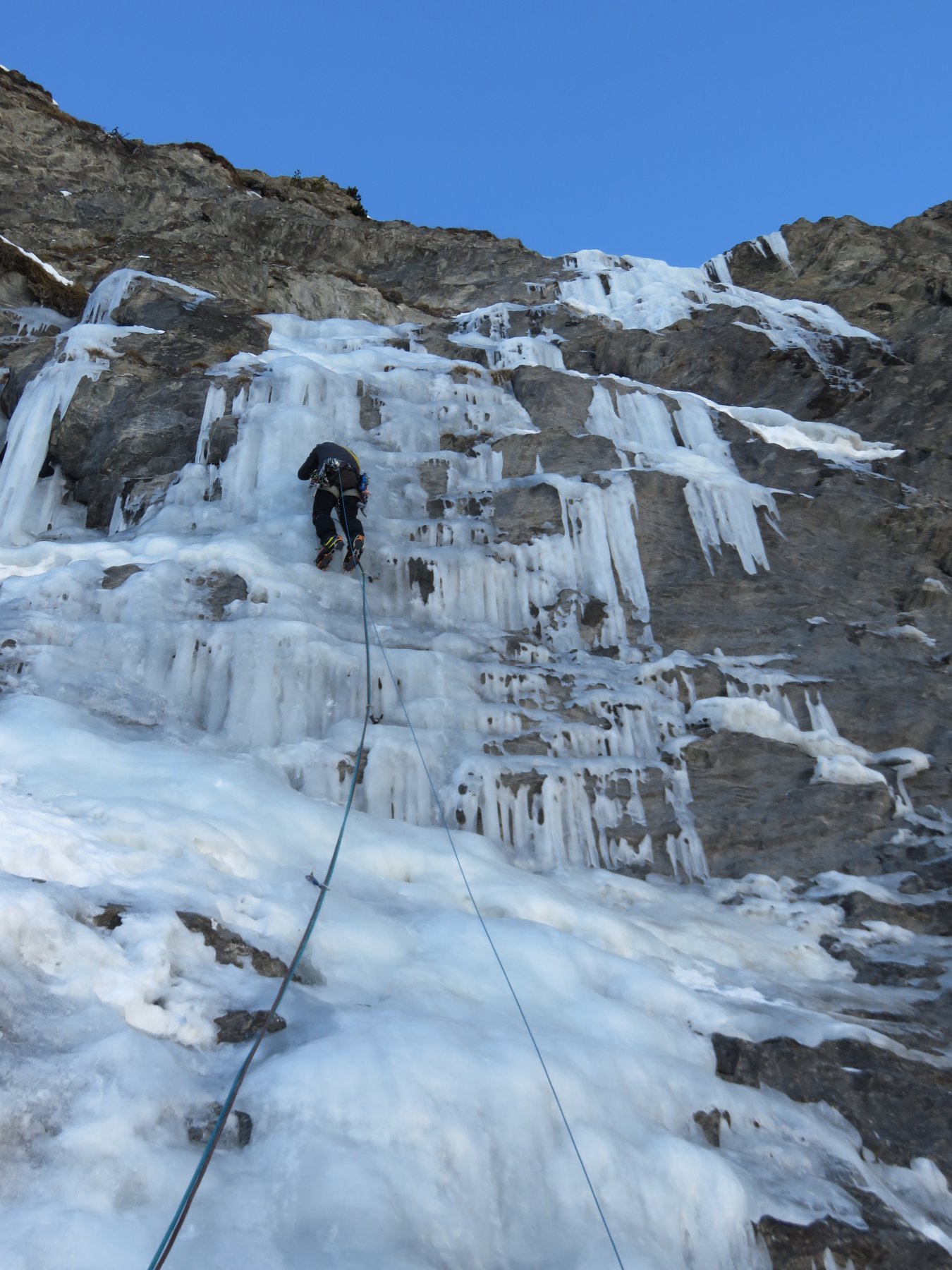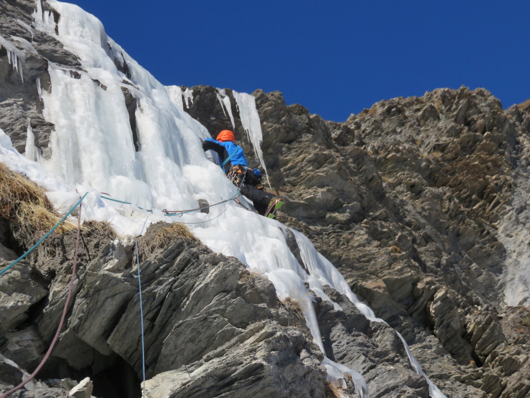 L2: ribaltarsi su terrazzino e traversare verso destra su roccia e zolle poi su ghiaccio, muro a 80°/85° sosta su ghiaccio alla sommità della cascata 50m.