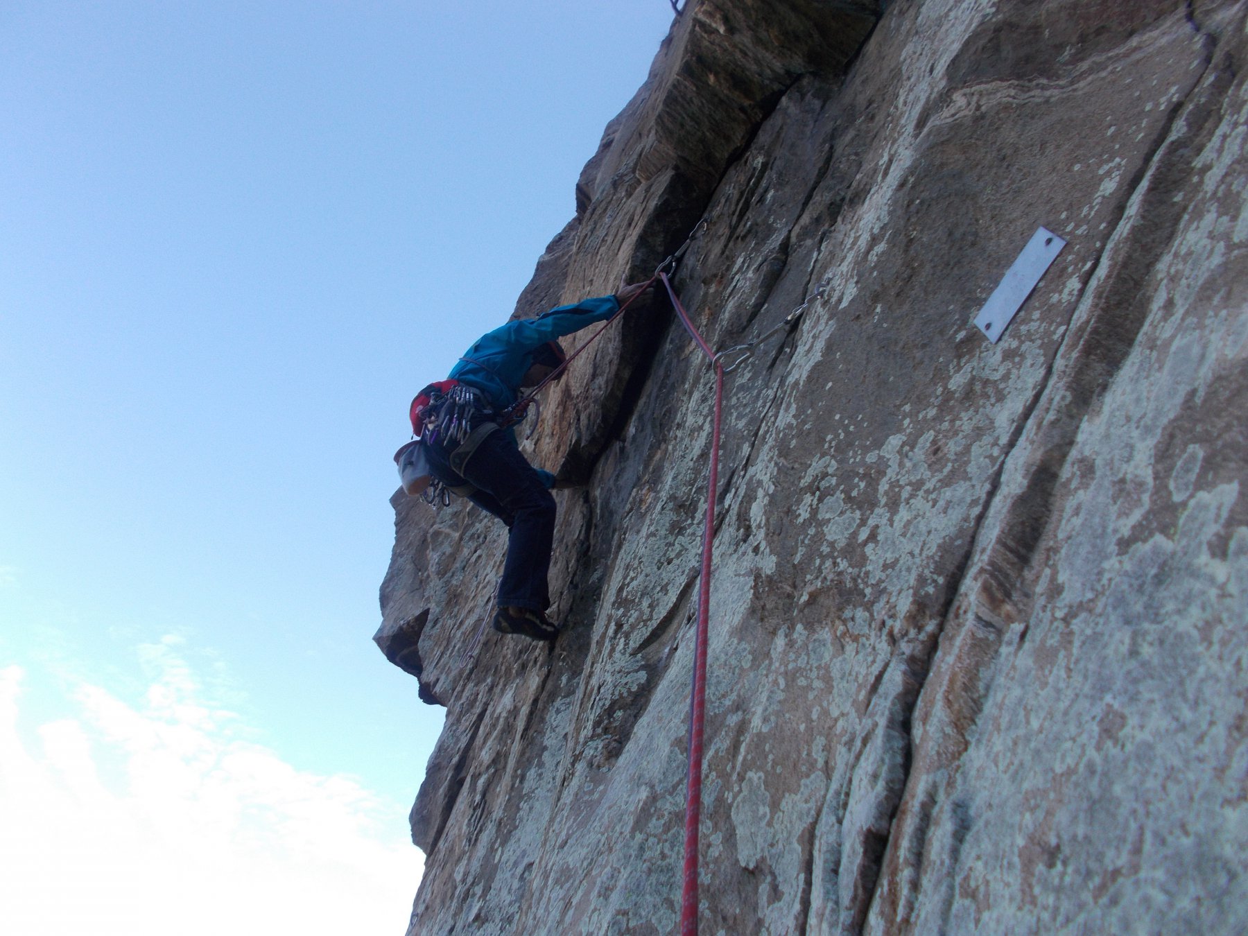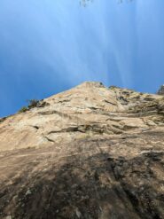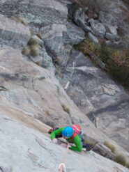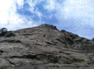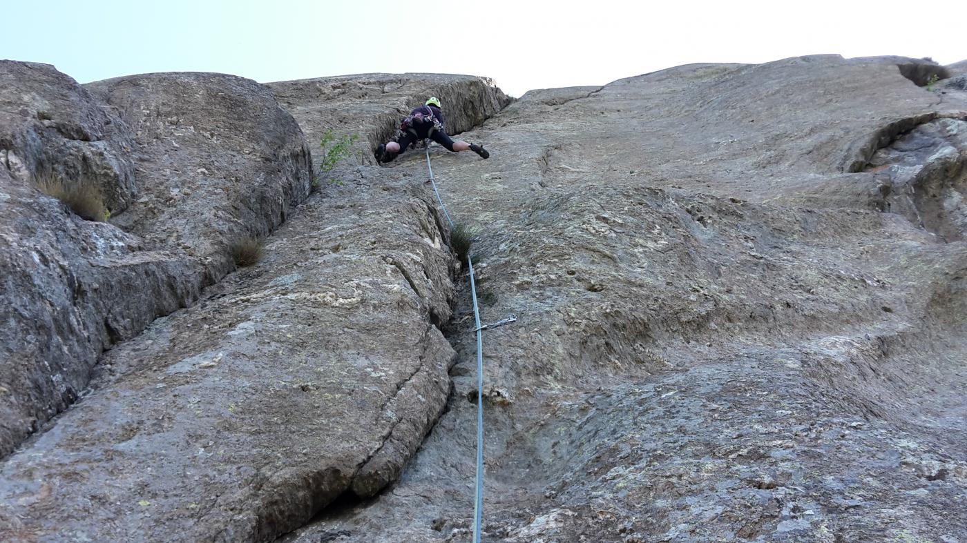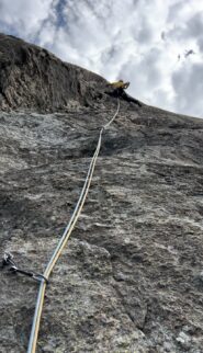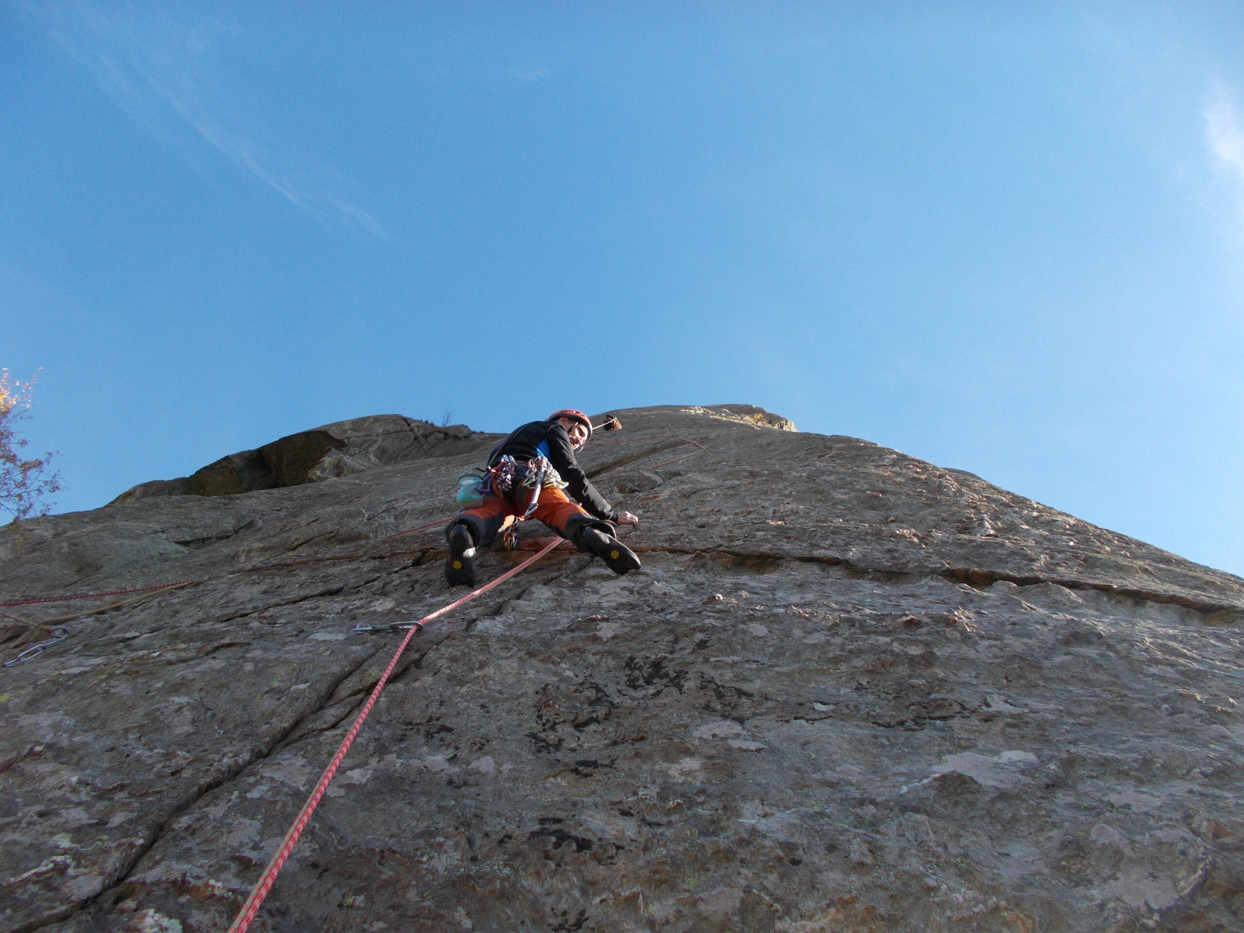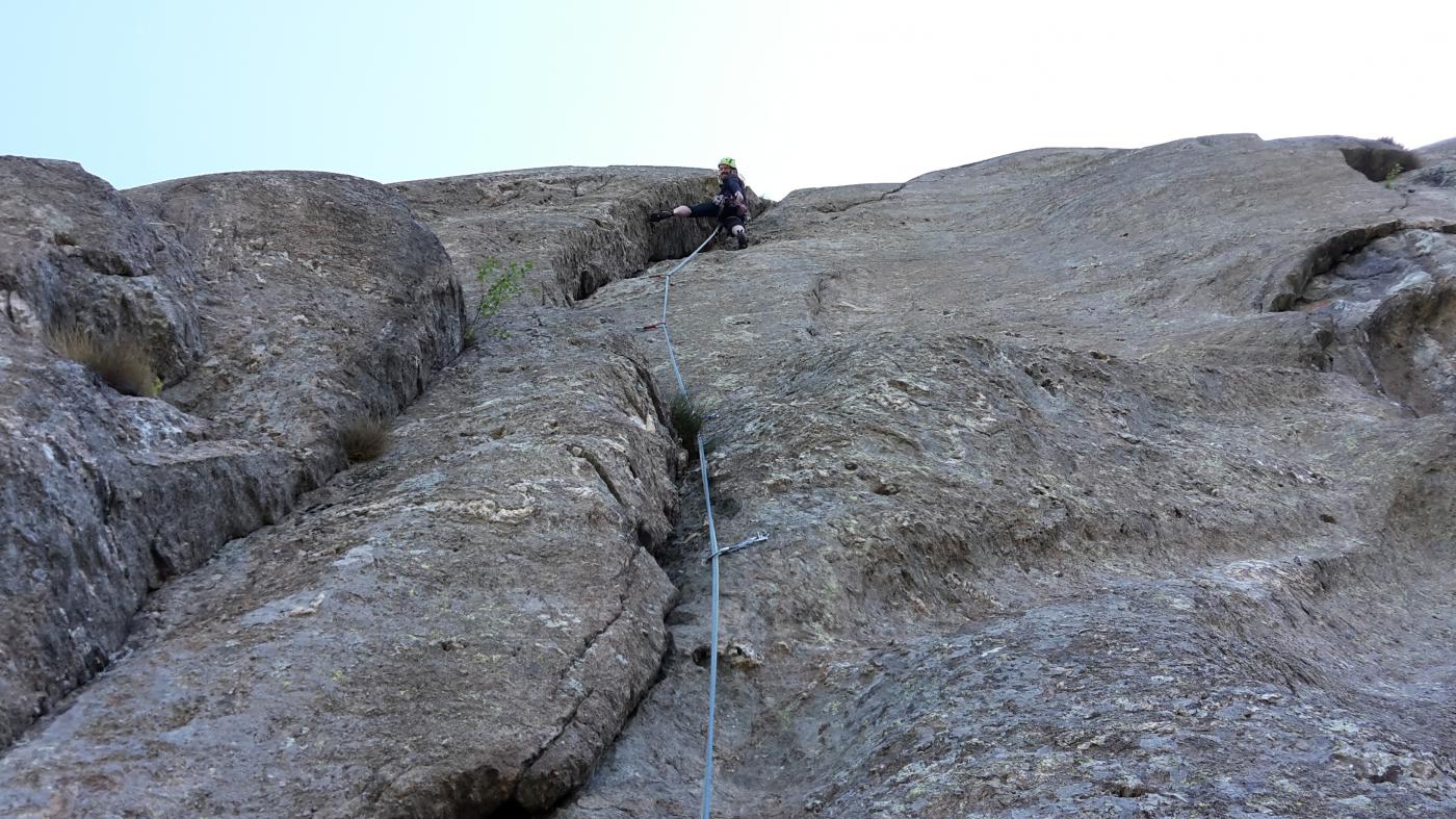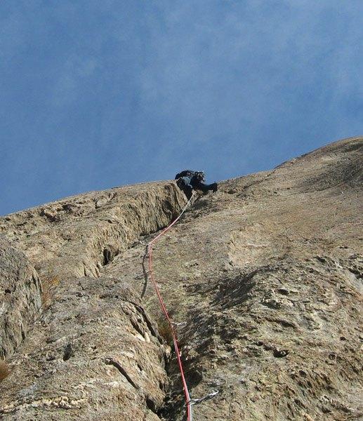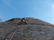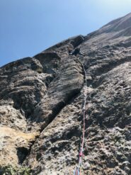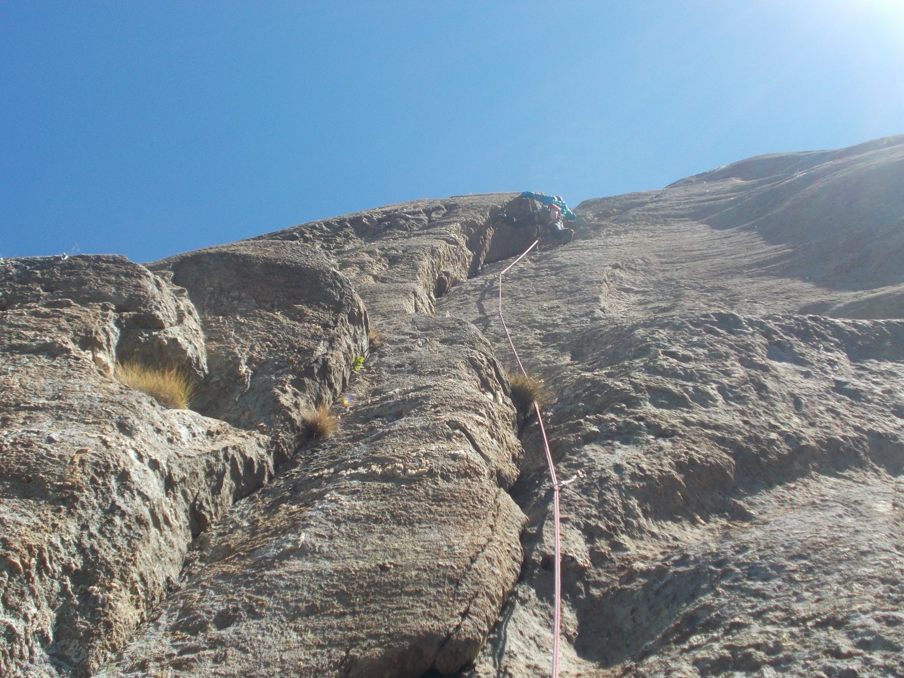 L3 – 6a – In obliquo verso destra sfruttando i tratti più facili e lavorati della placca fino a doppiare il vago spigolo che permette di infilarsi in un simil diedro su buone prese. Uscire verso destra seguendo sempre il facile fino a raggiungere la sosta vicina a quella di “Control… e vai tranquillo”, su un piccolo terrazzo.
