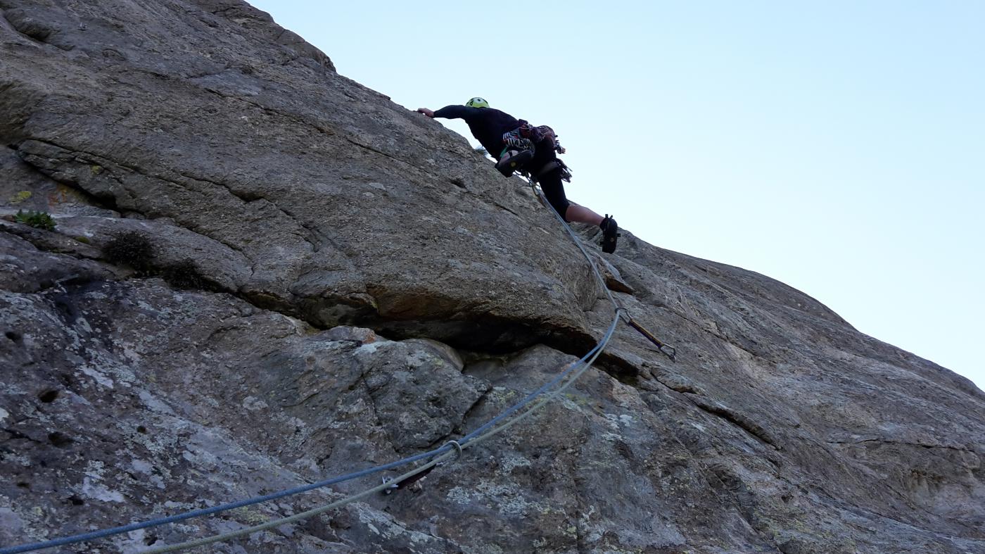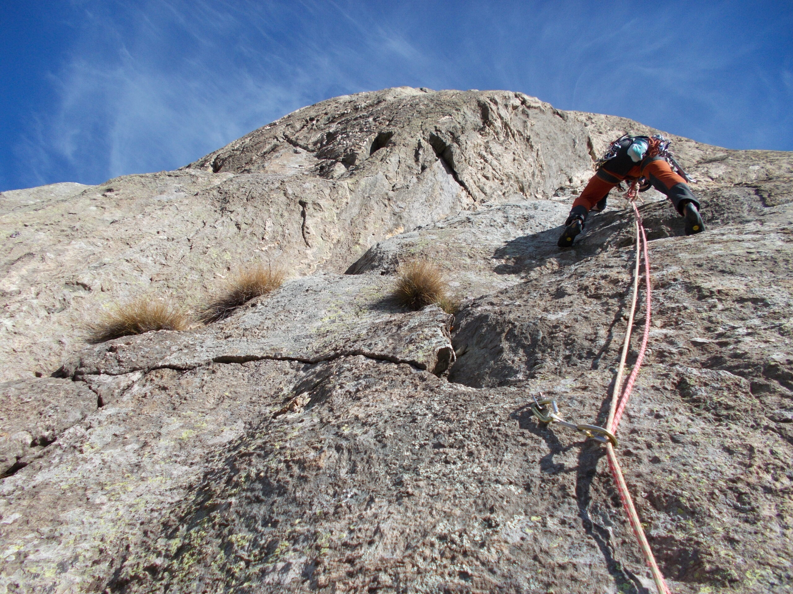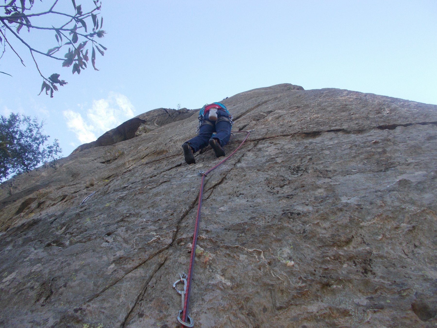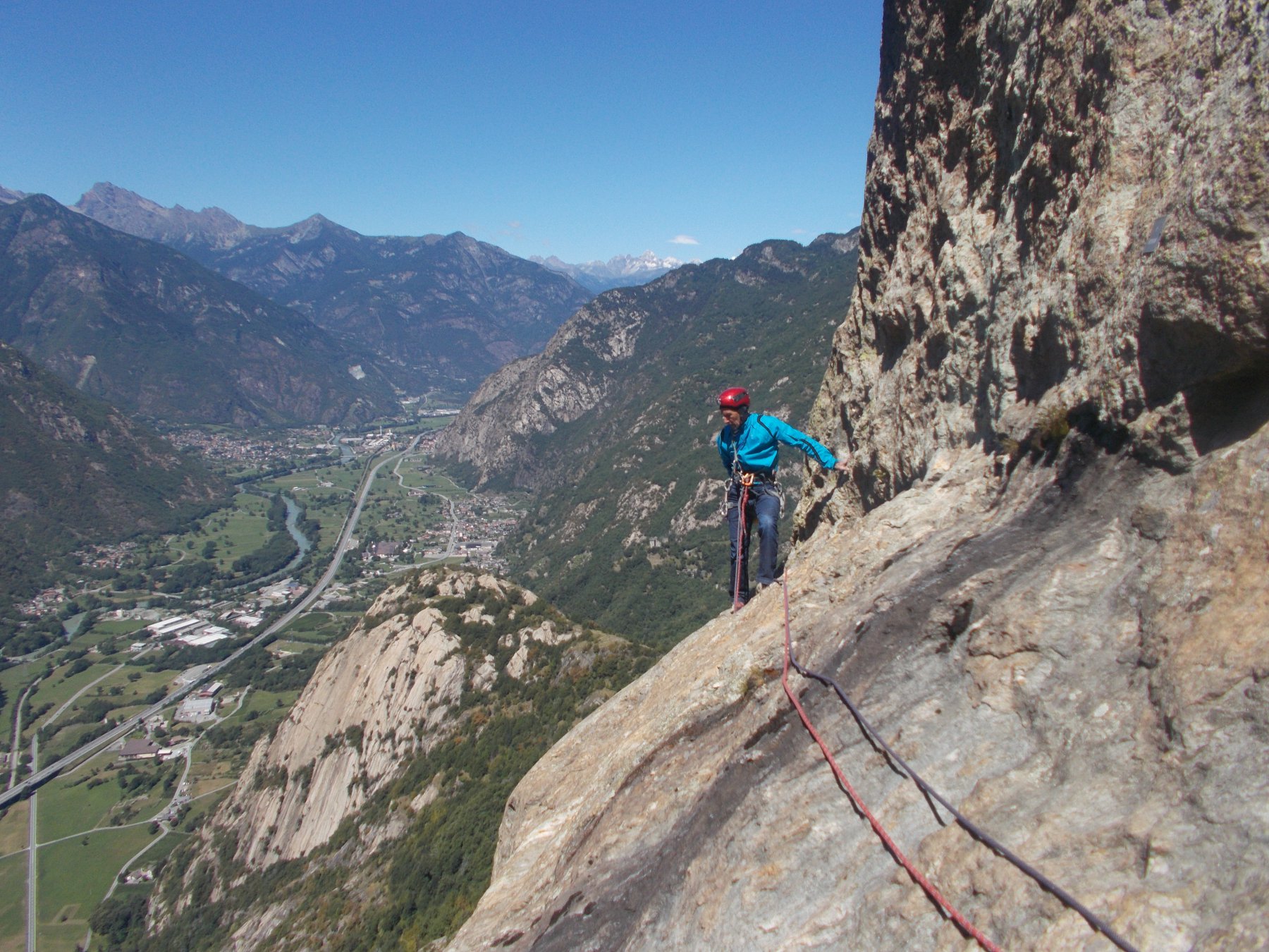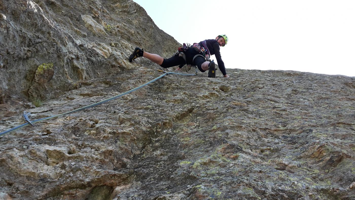 L3 – 6a – In obliquo verso destra sfruttando i tratti più facili e lavorati della placca fino a doppiare il vago spigolo che permette di infilarsi in un simil diedro su buone prese. Uscire verso destra seguendo sempre il facile fino a raggiungere la sosta vicina a quella di “Control… e vai tranquillo”, su un piccolo terrazzo.