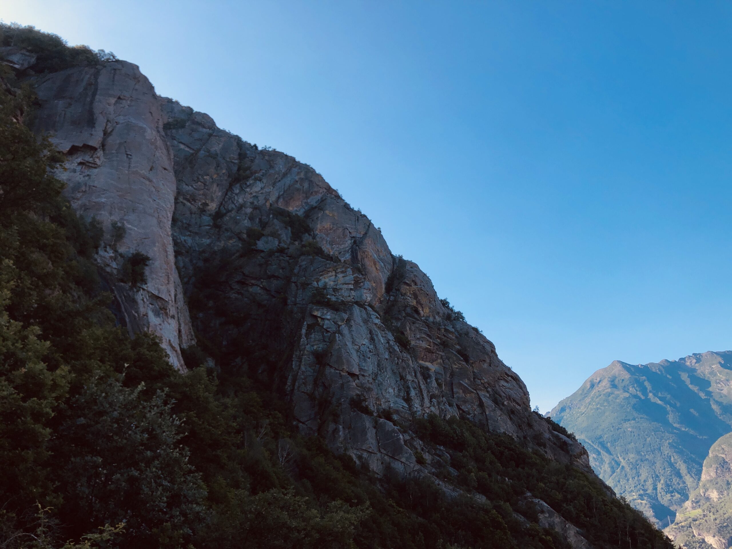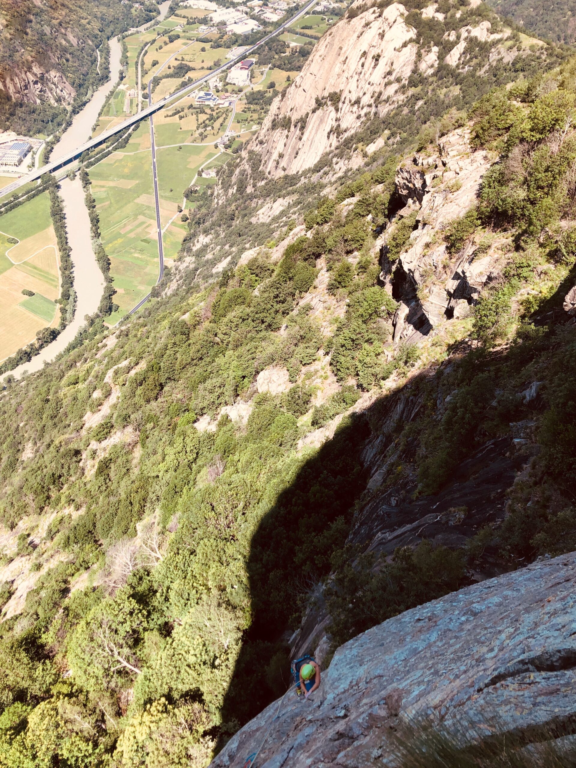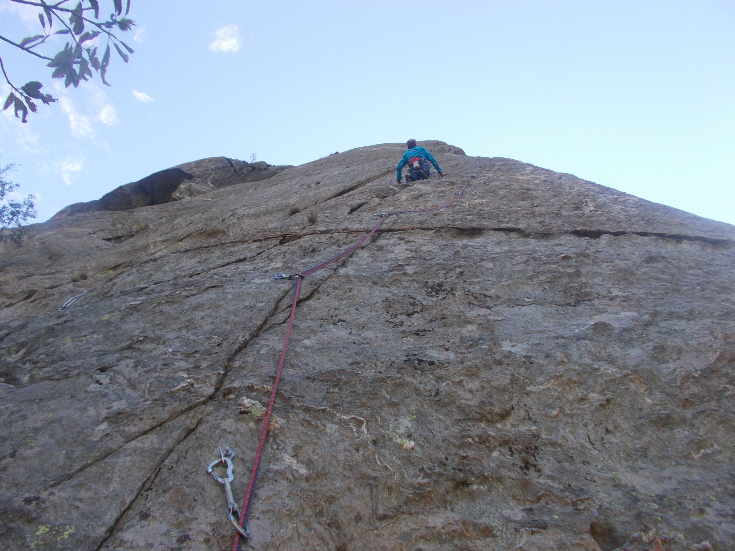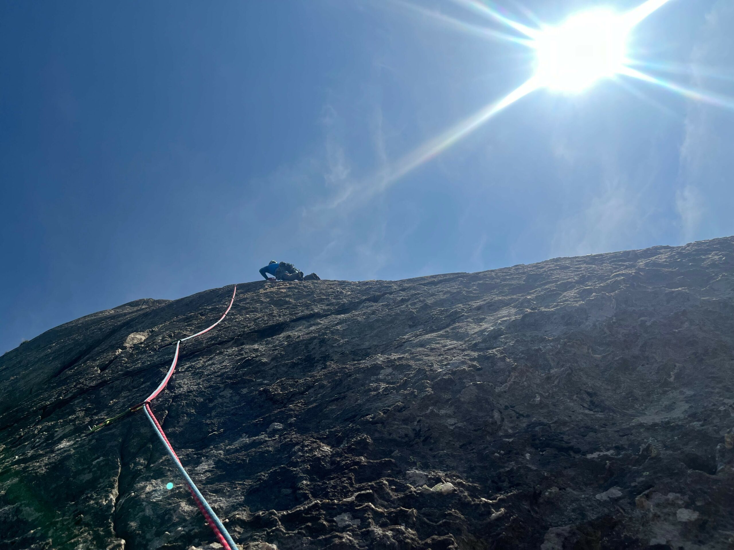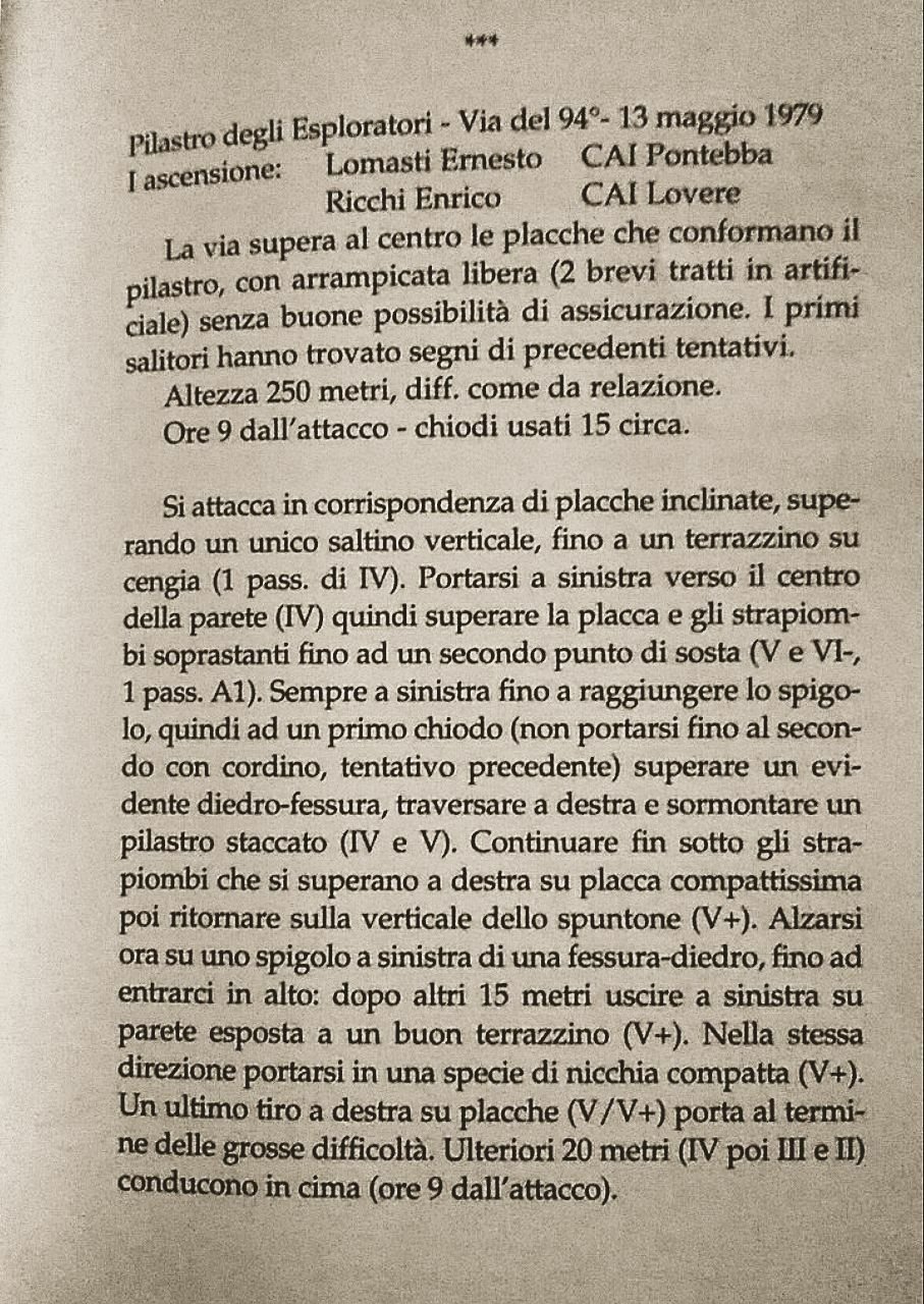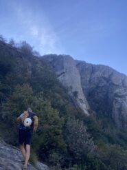 L3 – 6a – In obliquo verso destra sfruttando i tratti più facili e lavorati della placca fino a doppiare il vago spigolo che permette di infilarsi in un simil diedro su buone prese. Uscire verso destra seguendo sempre il facile fino a raggiungere la sosta vicina a quella di “Control… e vai tranquillo”, su un piccolo terrazzo.