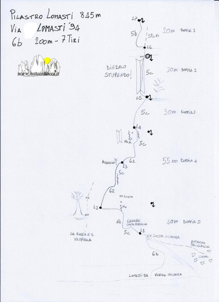 Poco sotto il parcheggio parte un sentiero che per un breve tratto scende leggermente, fino al ponte della vecchia strada militare che si inoltra nel bosco e raggiunge prima un santuario e poi Machaby. Si prosegue per la mulattiera e si arriva ad un altro gruppo di case (freccia indicante “base Pilastro Lomasti”); poco dopo, nei pressi di un tornante (ometto e freccia), si svolta a destra, abbandonando la comoda mulattiera e imboccando un sentiero che prosegue a mezzacosta fino alla base del pilastro di gneiss (circa 45 min dall'auto). Targhetta alla base.