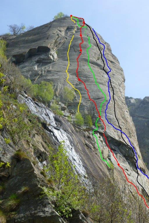 La via attacca a sinistra della rossa e il vampirla, targheta alla base. L’ obbligatorio lo danno 6a, ma a mio parere è di più, sul 6b, perchè non è azzerabile nessun passaggio, se non un passaggio sul tetto alla fine del 5° tiro.