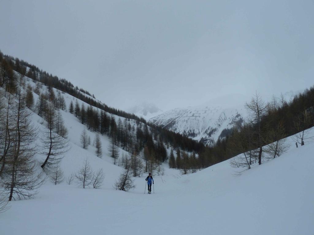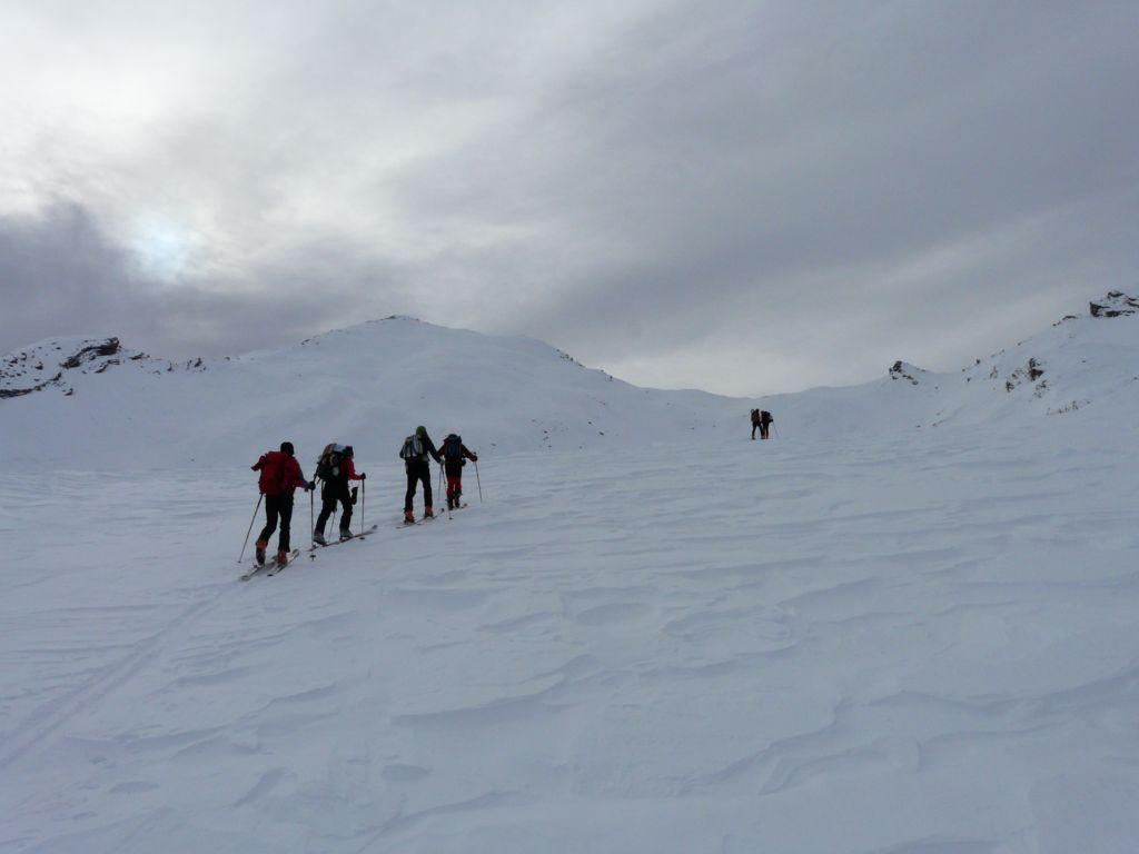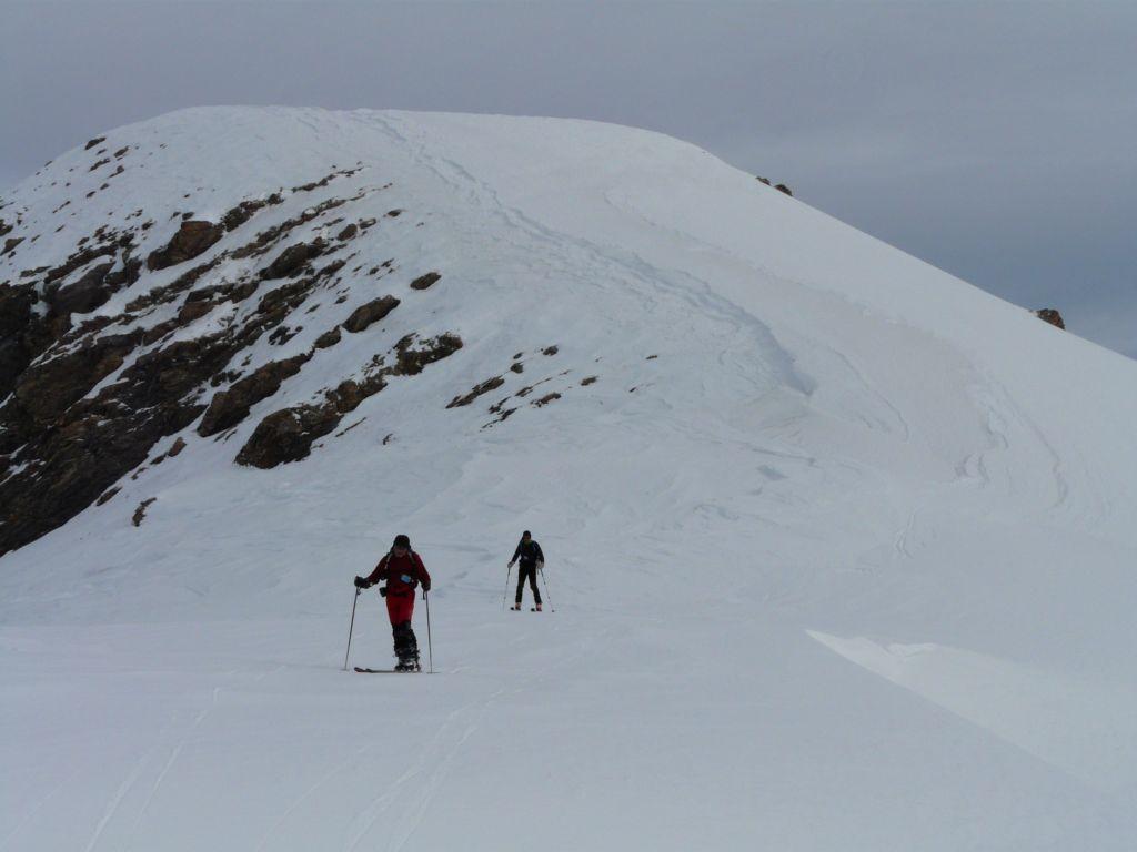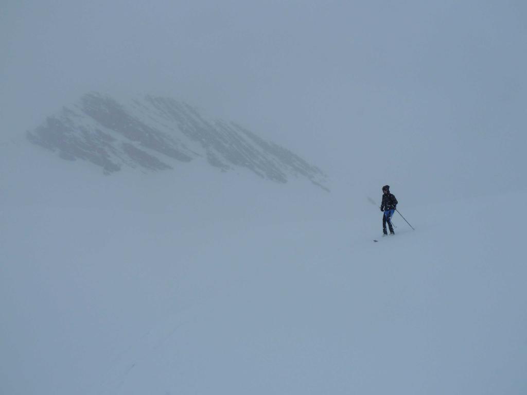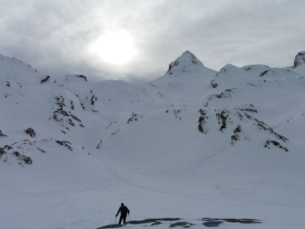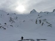 Lo si segue fino a giungere alla Cabanes de Corrouit (casetta in lamiera) di qui si svolta a sinistra risalendo alcuni valloncelli fino a quota 2400 m. Si svolta a destra e si sale l’evidente schiena innevata che porta alla cima molto evidente in centro all’ampio vallone di salita.