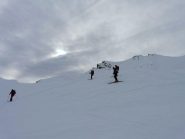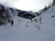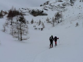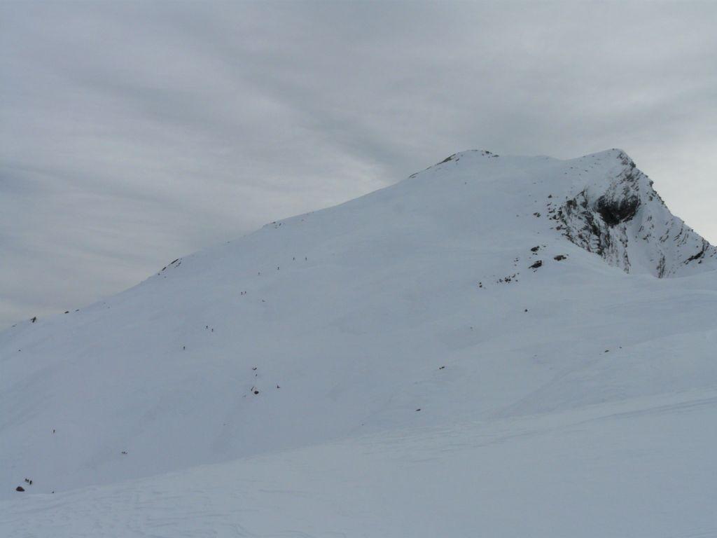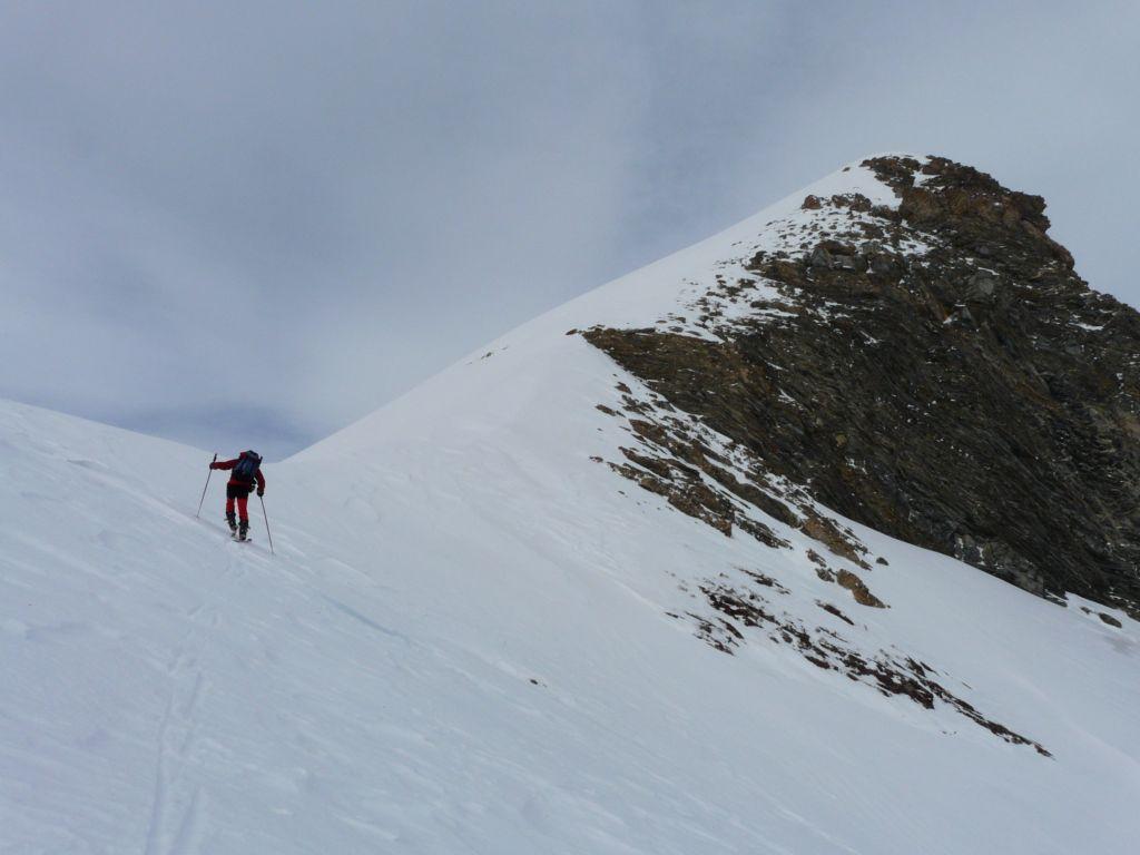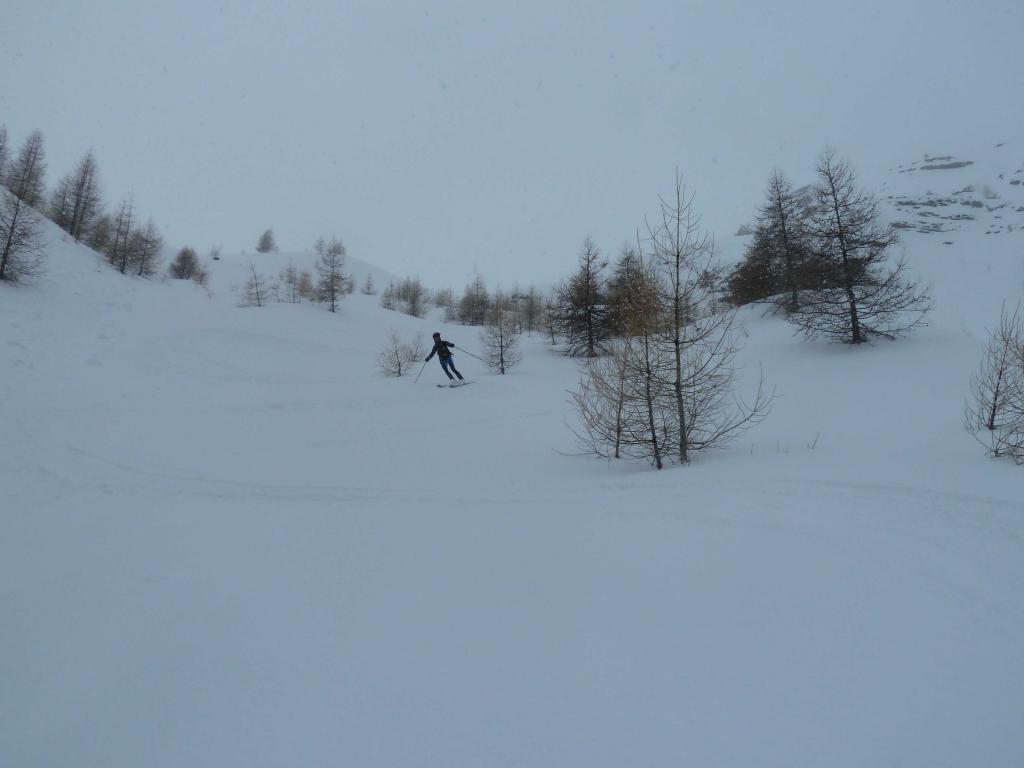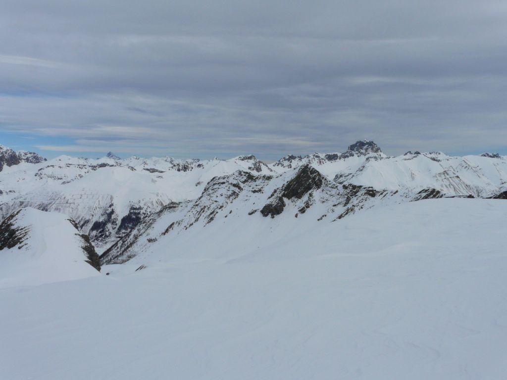 Lo si segue fino a giungere alla Cabanes de Corrouit (casetta in lamiera) di qui si svolta a sinistra risalendo alcuni valloncelli fino a quota 2400 m. Si svolta a destra e si sale l’evidente schiena innevata che porta alla cima molto evidente in centro all’ampio vallone di salita.