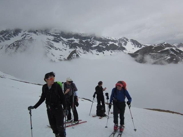 Discesa iniziata intorno alle 11.30. In 3 sono saliti con gli sci a spalle quindi scesi direttamente dalla punta (100-150 metri circa a 35-40°), noi invece abbiamo ripercorso la traccia di salita.