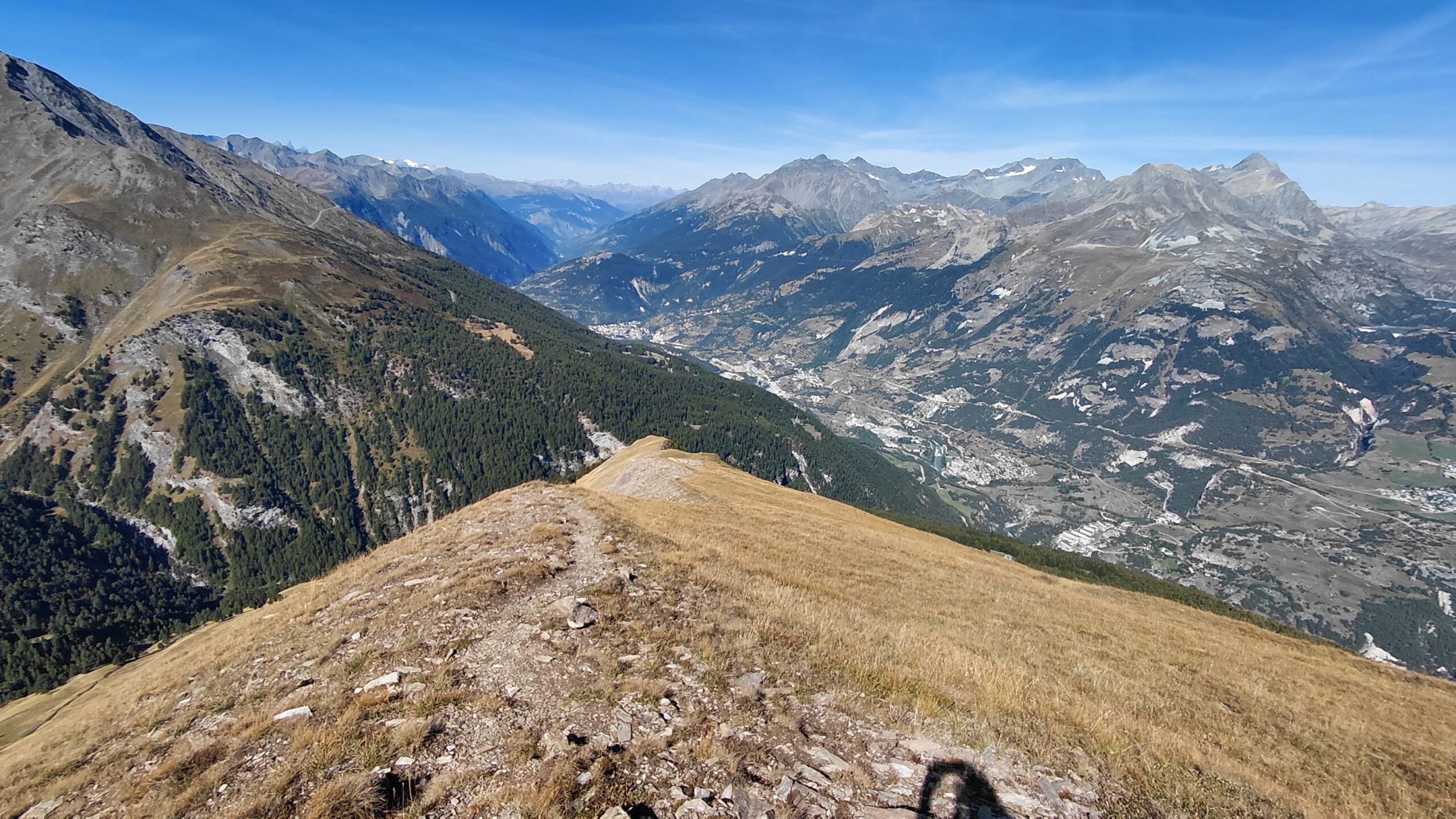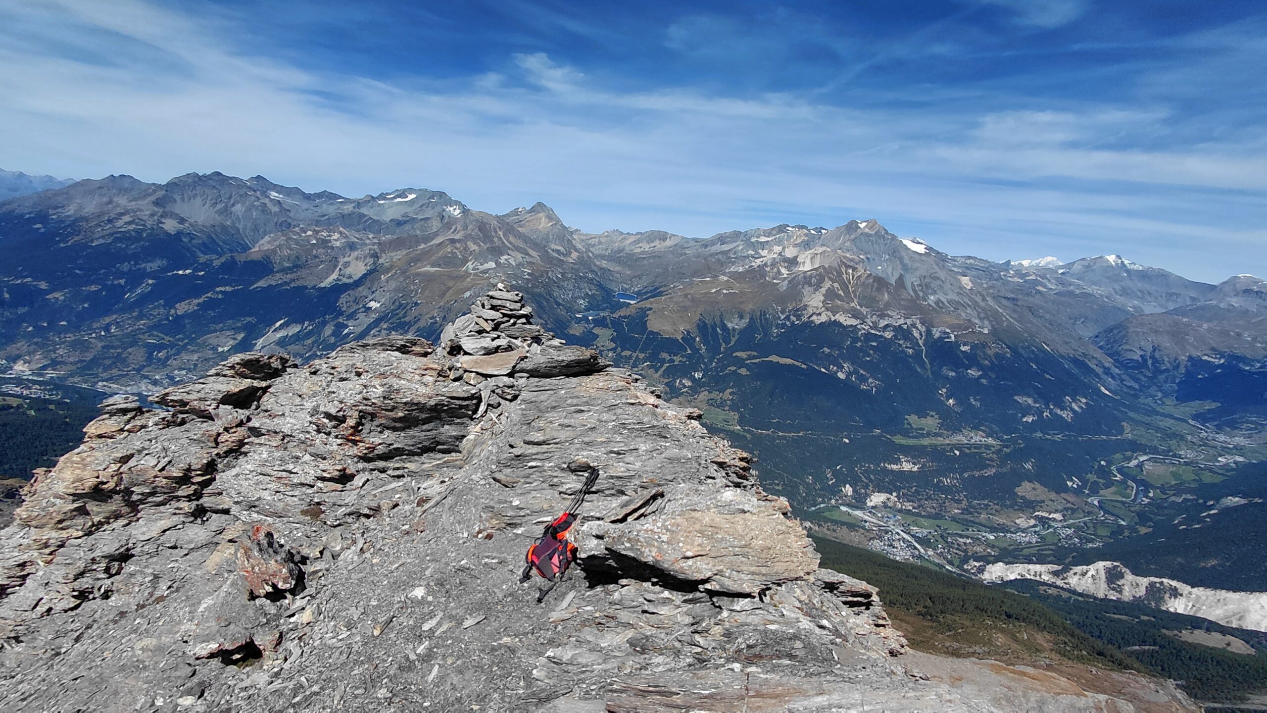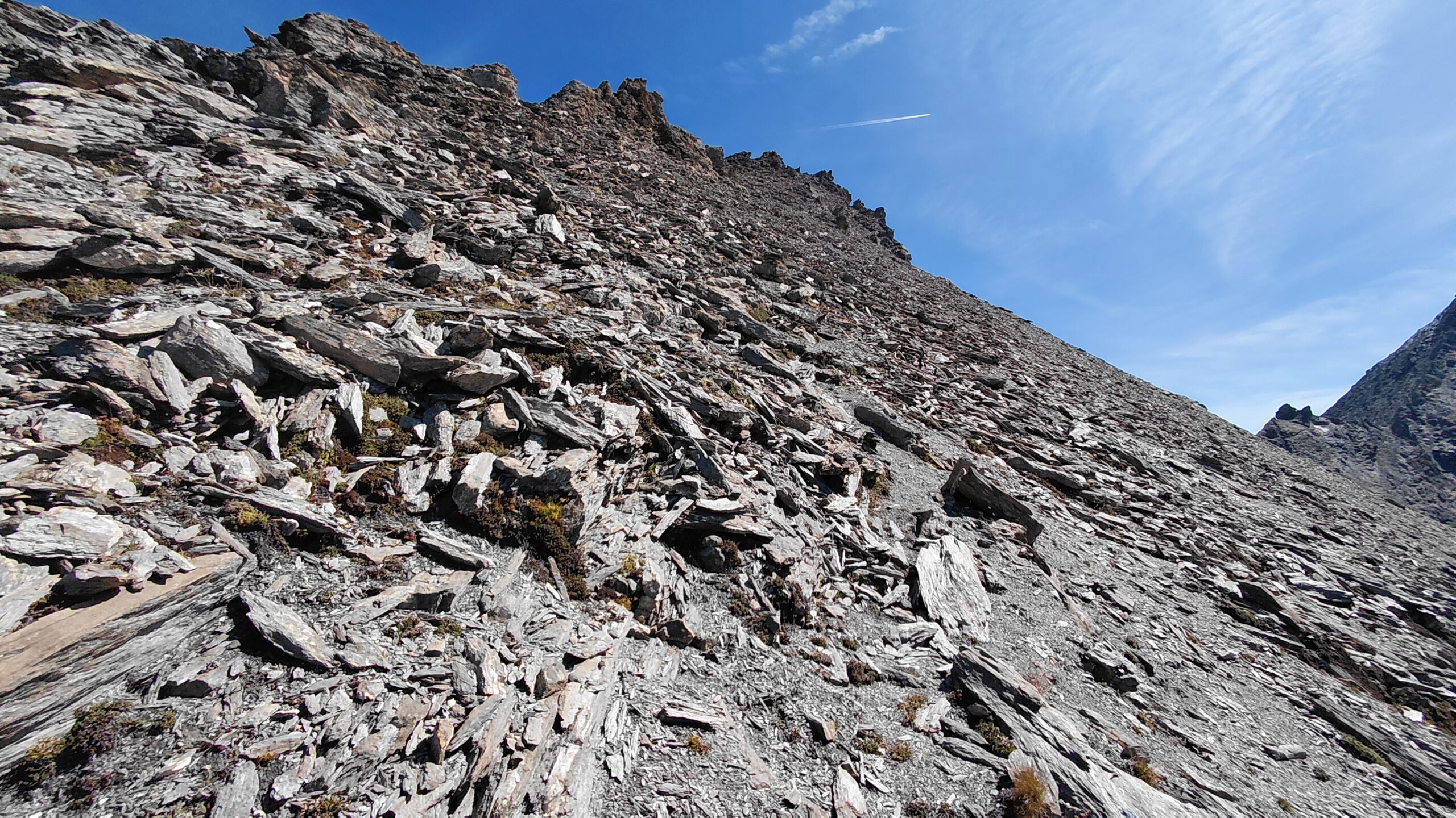 Da qui si segue poi la cresta fino alla vetta: il finale roccioso appare arduo ma si può superare senza problemi, per tracce e ometti nei ghiaioni scistosi sotto la cresta esposta a sud, poi, quando il pendio diventa troppo ripido, si piega a sinistra per raggiungere la vetta.