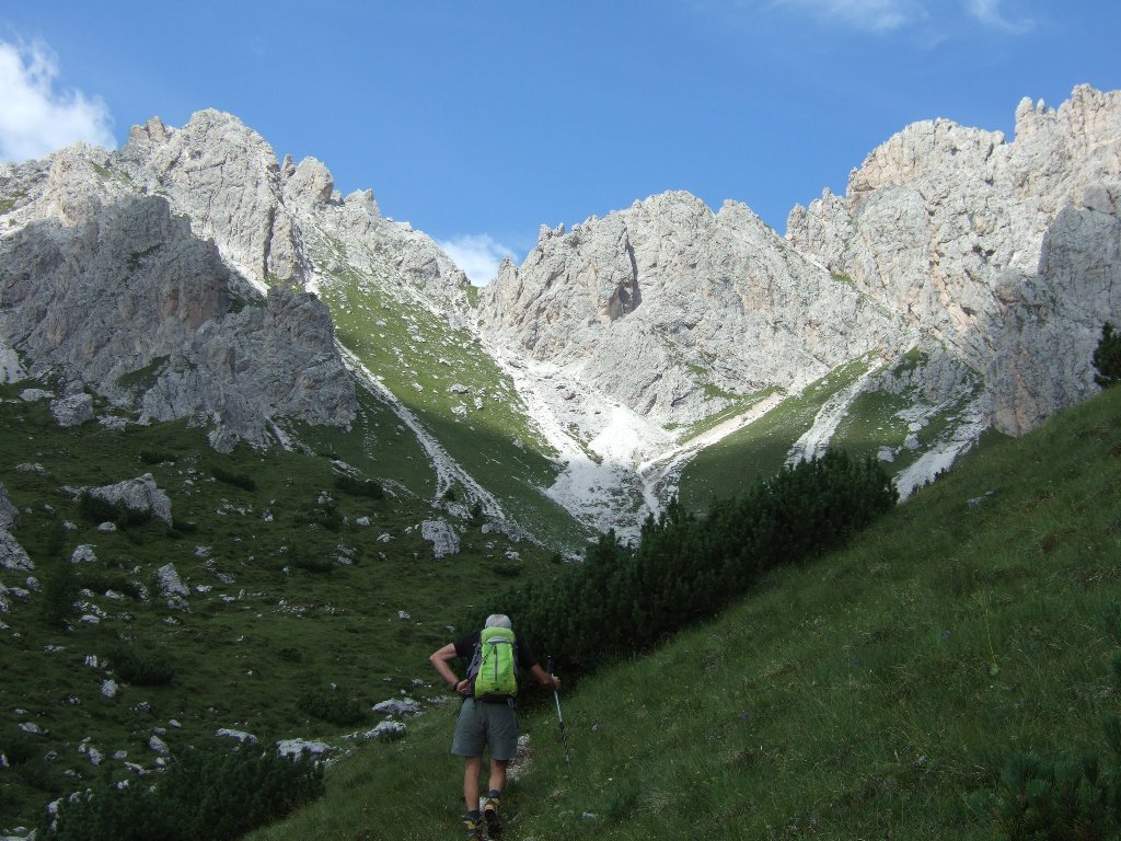Dalla località La Siega, comodo parcheggio, area picnic, si risale la ripida strada asfaltata per circa 30′ fino a raggiungere il bel rifugio Forcella Zovo (ristoro, camere). Il sentiero parte pochi metri dopo sulla sx e si inoltra nel bosco sopra la strada che scende in Val Visdende. Con pendenza più accentuata entra nella Val Vissada, attraversa il torrente e inizia a salire tra i vasti pascoli della valle racchiusi tra il MOnte San Daniele a sx e il Monte Schiaron a ds. In mezzo alla valle si nota il bivacco Vissada. Raggiunto un trivio, si sale alla cresta erbosa e lasciando a ds il sentiero per il MOnte Schiaron ci si porta verso la sella di Forcella Longerin mt 2044. Il sentiero che sale verso le Crode di Longerin è segnato ma non è molto evidente nell’erba, comunque basta puntare al pendio che scende ripido dalla Cima Sud e lo si rintraccia. Si sale ripidamente verso le pareti rocciose, si lascia a ds il sentiero per il Passo Palombino e si entra nello spettacolare anfiteatro delle Crode di Longerin, con numerose guglie e gugliette. Il sentiero si innalza sempre più ripido tra gli ultimi prati e le ghiaie fino a una forcelletta erbosa dove si porta decisamente a sx e per le ultime, ripide balze ghiaiose arriva alla cima Sud di Longerin mt 2523 (croce, libro di vetta).