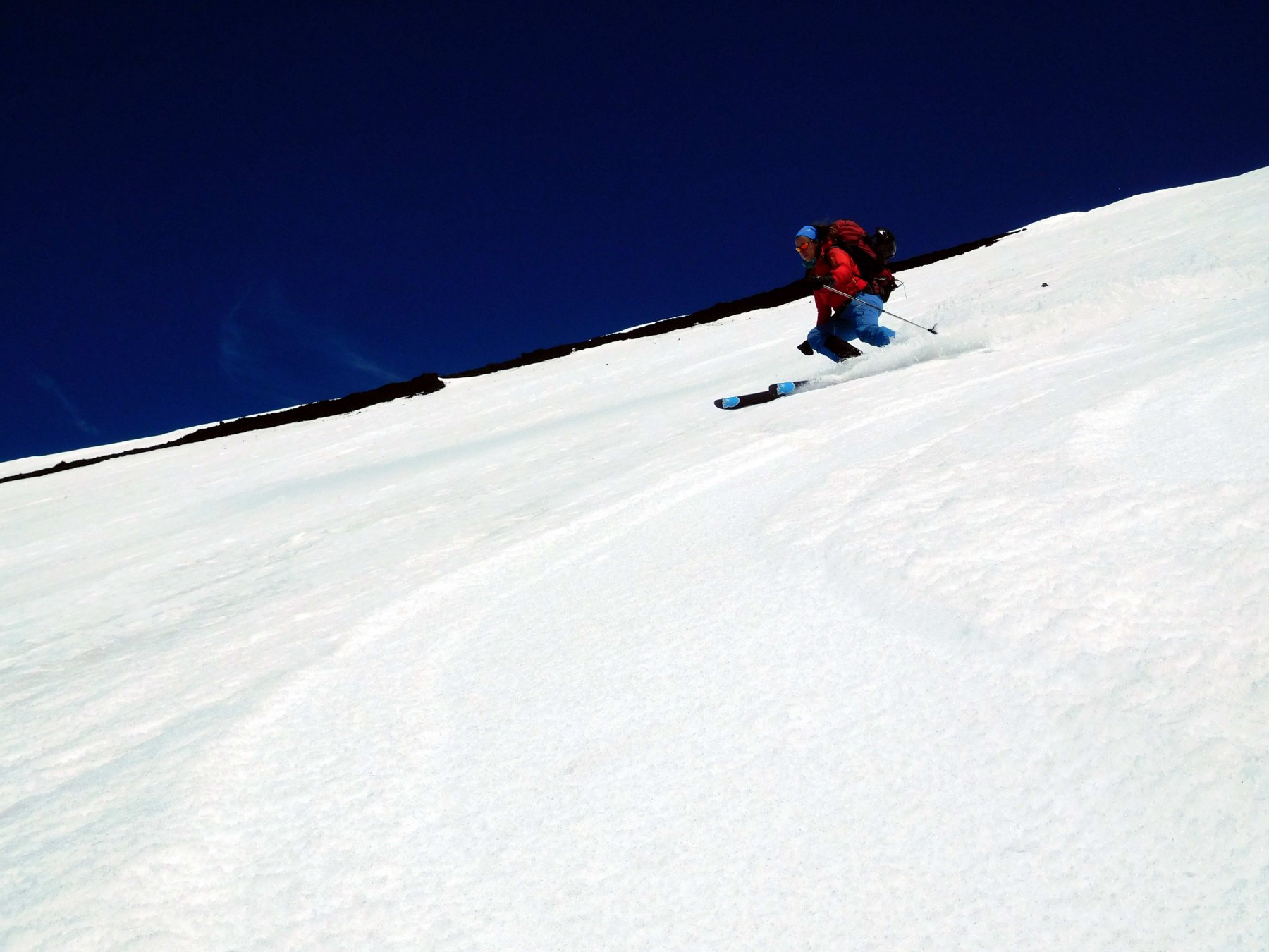 Breve portage poi abbiamo messo gli sci lungo le piste (impianti ormai chiusi). Più su ramponi, visto il vento in cresta nella parte alta saliamo il più ripido ma anche riparato versante sud. In cima calma di vento e panorama bellissimo. Per la discesa scendiamo il versante est con neve ben ammorbidita dal sole. Sciata sontuosa su velluto perfetto fino a pochi minuti dal park! Pernotto presso il piccolo,economico ed incantevole refugio Las Raices ad una decina di km dalla partenza della gita (consigliatissimo!!). Con Valter,Elena,Nico e Gian.