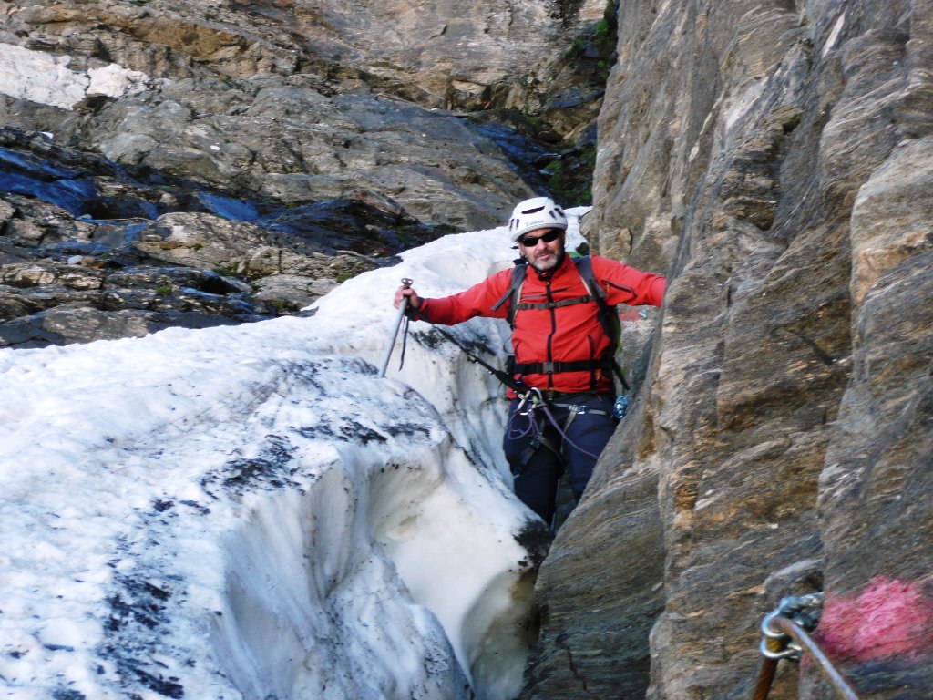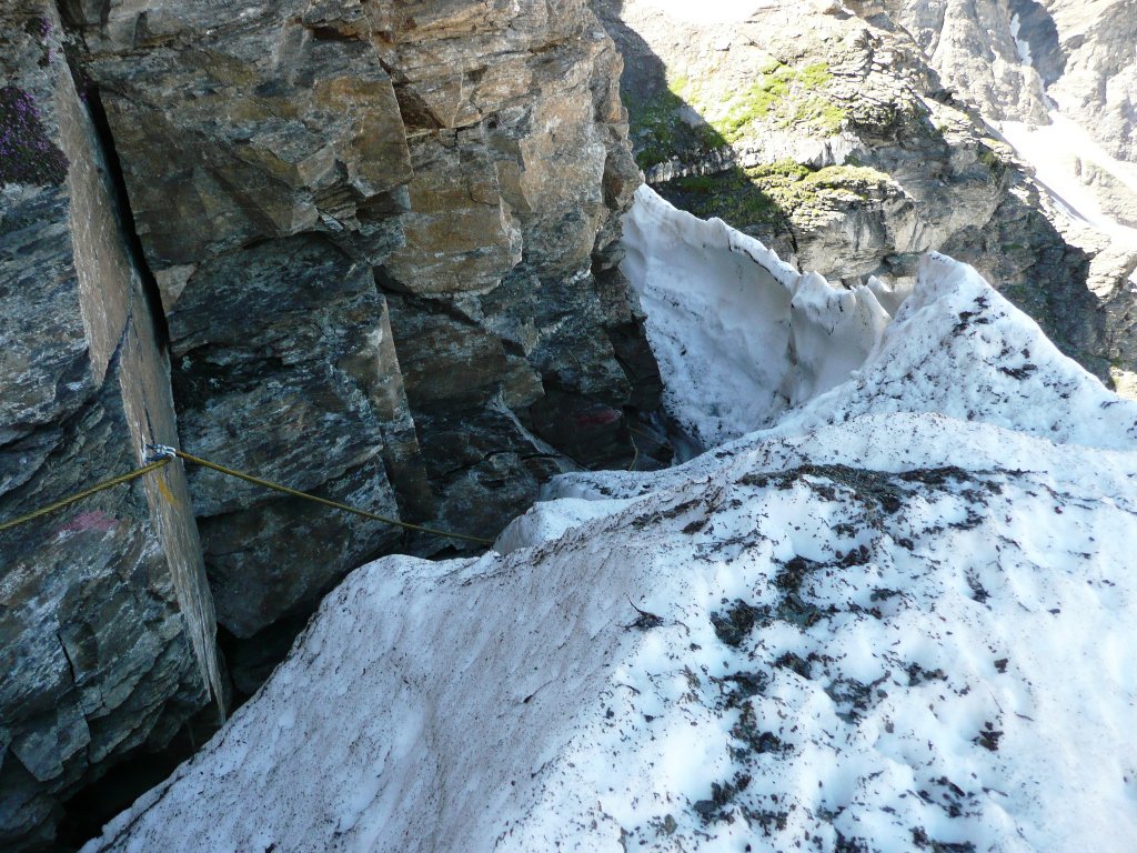 Ancora molta neve, serve attrezzatura alpinistica: picca, ramponi ed eventualmente corda e rinvii per conserva protetta. Alcuni tratti di cavo non sono fruibili in quanto sommersi dalla neve. Molti in assetto escursionistico oggi volevano salire ma sono stati respinti dalle condizioni. Noi siamo scesi dal passo della Losa giungendo per facile cresta dal passo della Vacca al ritorno dalla Grande Aiguille Rousse. Nessuna traccia di passaggio in alto: il colle è difeso da una cornice ben visibile anche da sotto, aggirabile con cautela su terreno detritico e marcio per accedere al sentiero attrezzato e bollato di rosso. In alcuni punti è stato necessario gradinare e aprire tratti di nevaio svalangato alla base della parete dove corrono i cavi e le saltuarie staffe metalliche, nulla di che ma una bella esperienza pepata per il mio socio che non era pratico del luogo … ma ora lo è! Con Marco (kima).