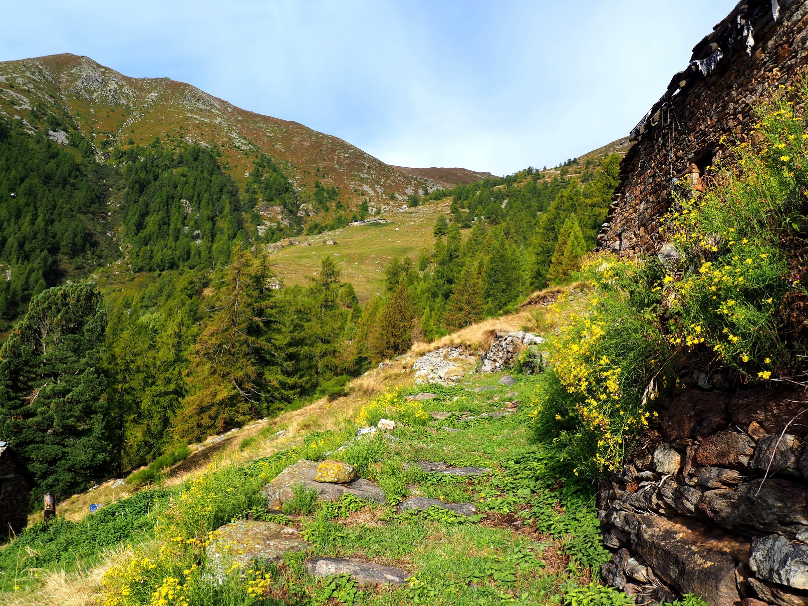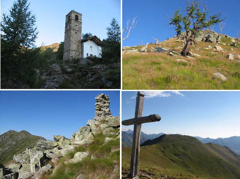 Si superano le case di Kiri e quindi con un tratto pianeggiante si arriva a Ceve 1665 m e poi a Chalasc 1739 m, dove si entra in un rado bosco di larici. Da qui in poi i segnavia vanno ricercati attentamente mentre il sentiero non sarà mai particolarmente marcato.
