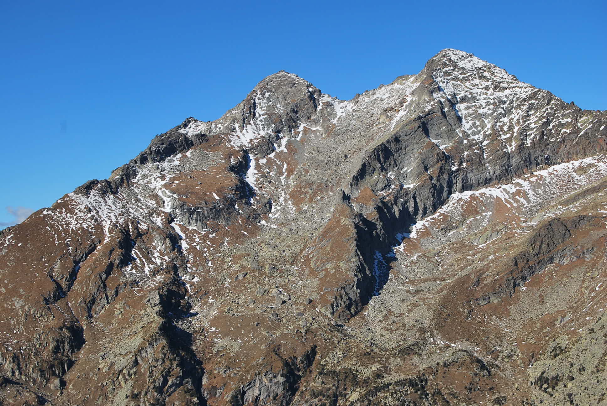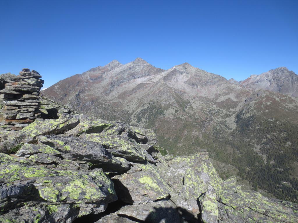 Ritorno per lo stesso percorso di salita, oppure passando prima dal Mont de Prial (che perciò va tenuto come seconda cima) e poi proseguendo per il lungo crinale prima verso nord poi verso est toccando le quote 2352 m, 2297 m e poi il Mont Las d’Arne 2259 m. Da questo per tracce si scende nel vallone di salita, raggiungendo la strada poderale a Brenghia 1800 e quindi ricollegandosi al sentiero già percorso in salita nei pressi della chiesa di Kiri.