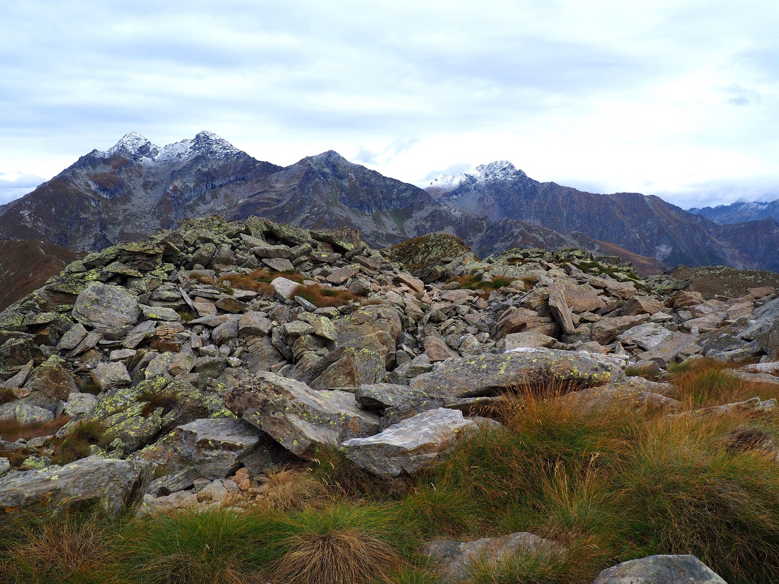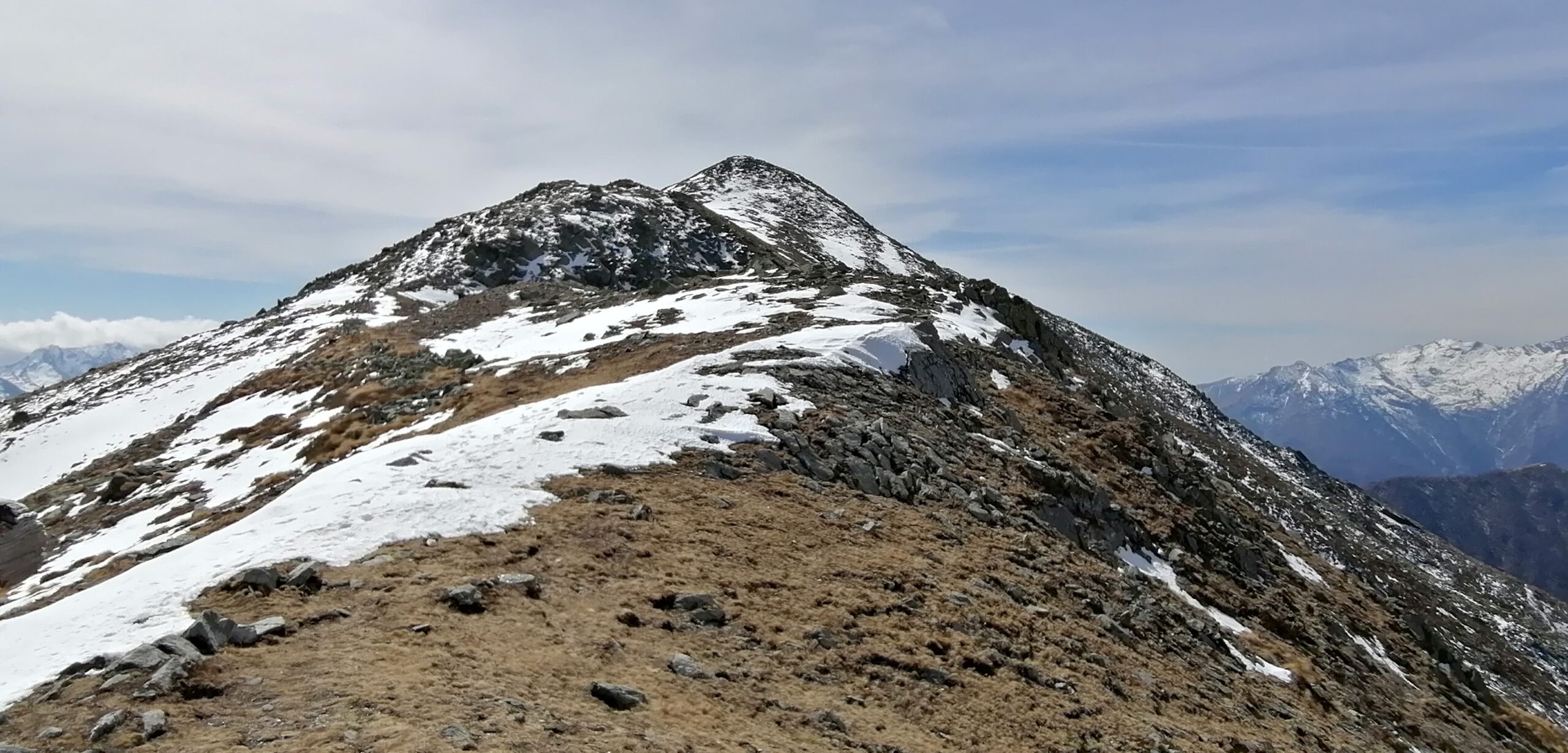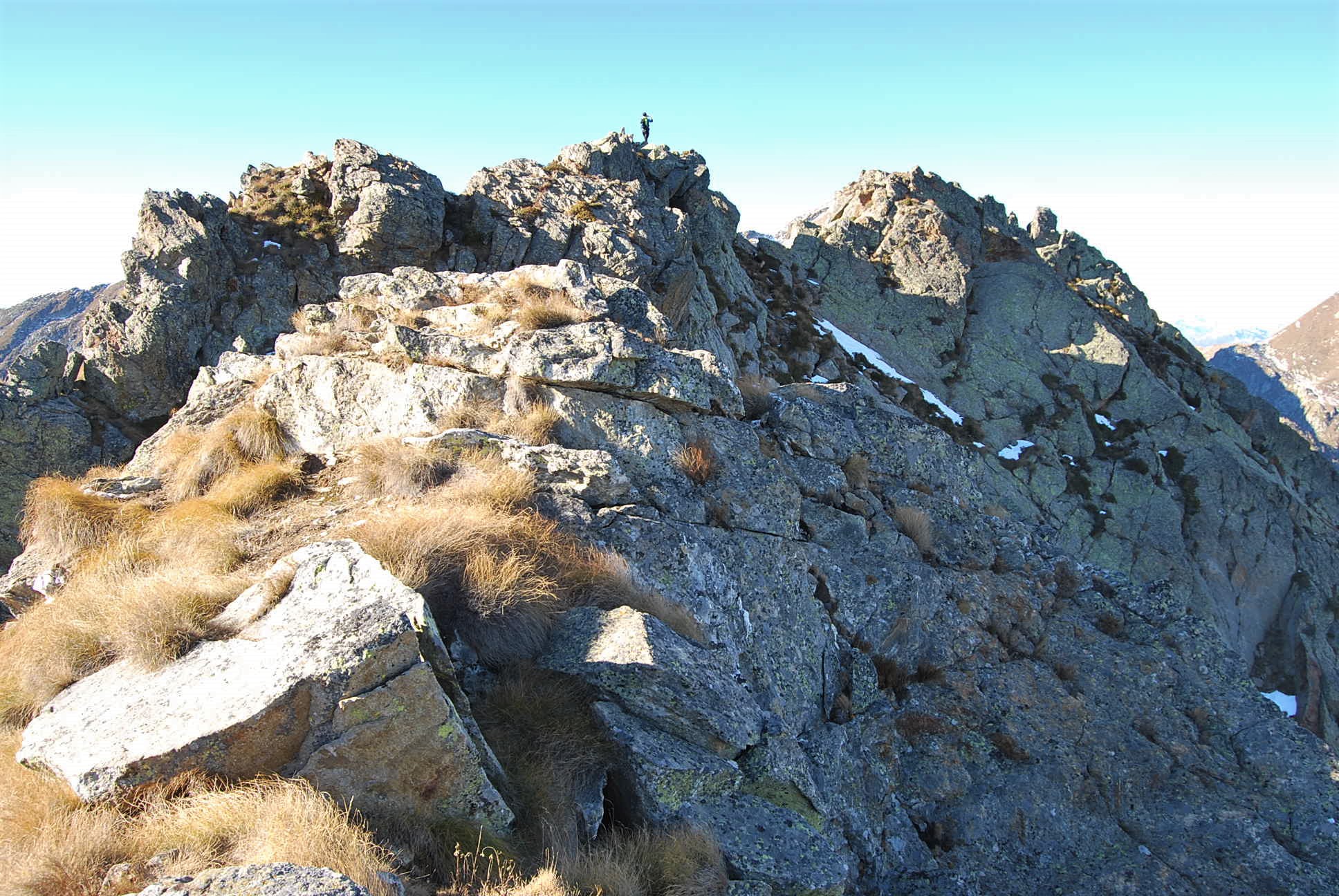 Sempre dal colle invece andando a sinistra si inizia a salire lungo il crestone che condurrà al Monte Lose Bianche. Inizialmente si resta sull’ampia dorsale, poi in vista di un cucuzzolo roccioso che è l’anticima, occorre individuare una traccia che si mantiene 30 m sotto il filo di cresta sul versante del vallone di salita, quindi si raggiunge una selletta tra anticima e cima, che si raggiunge salendo un tratto di massi accatastati.