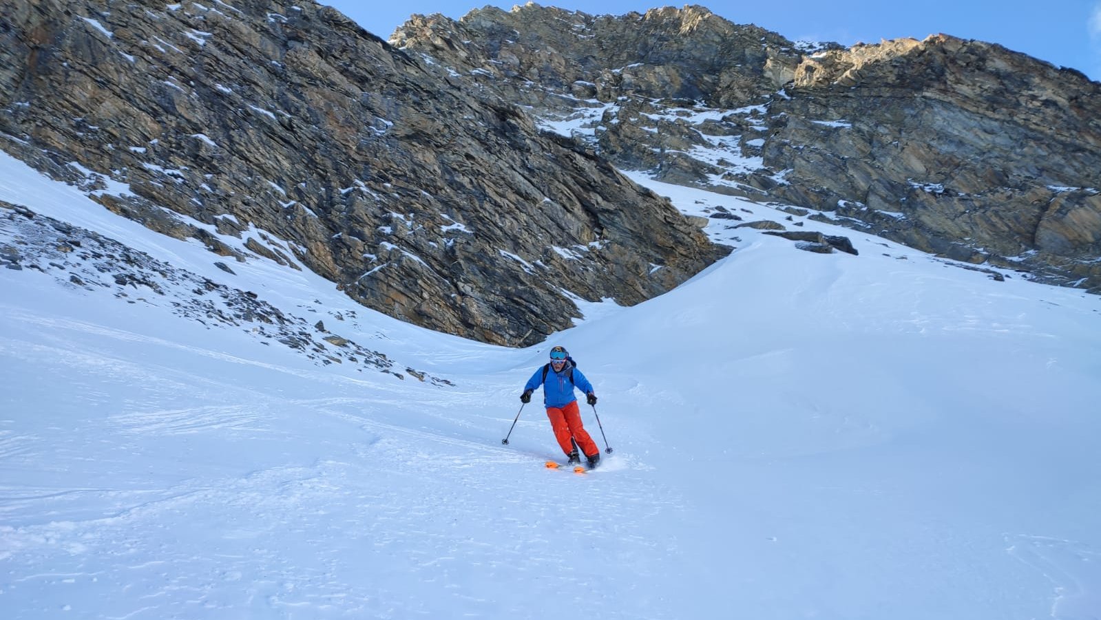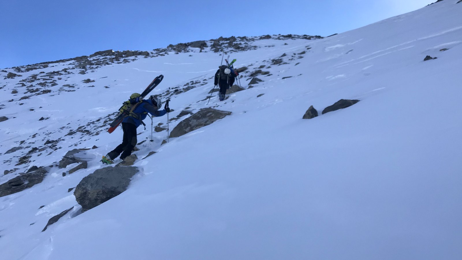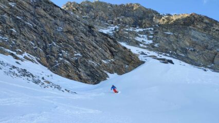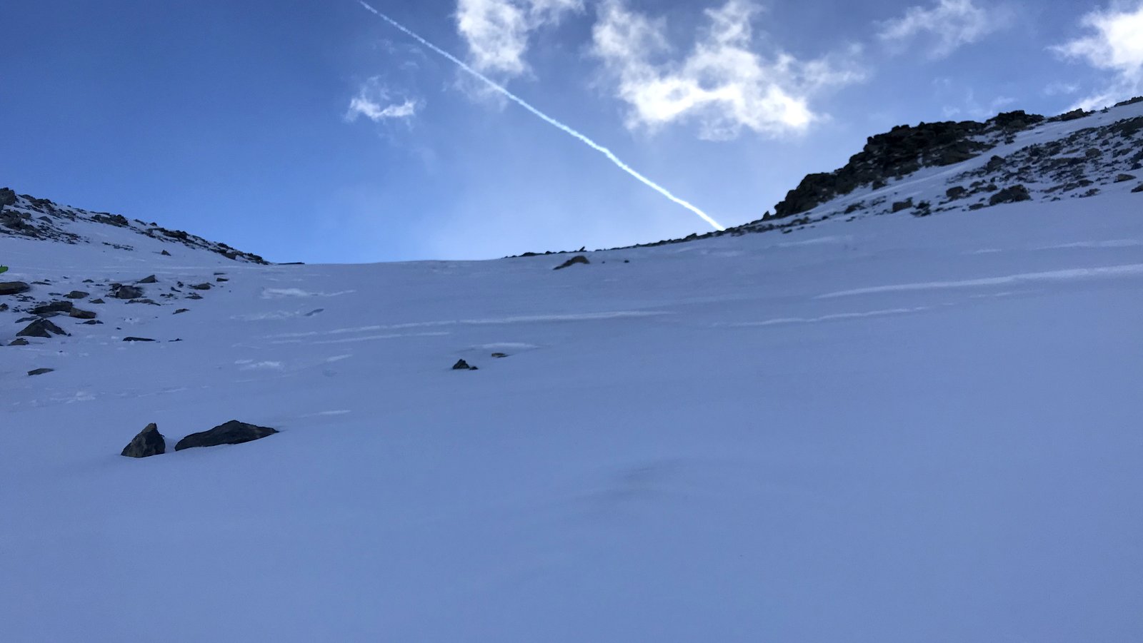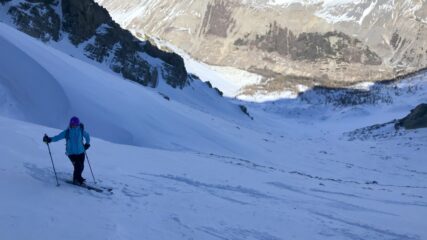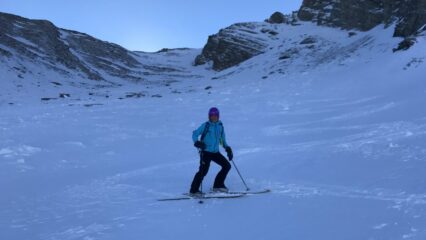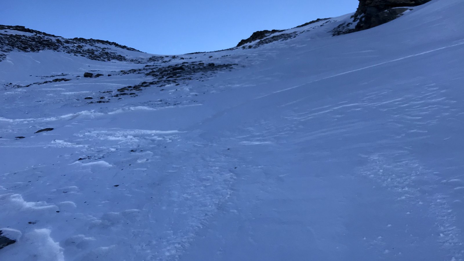 Dai 2700 in su era preferibile usare i ramponi invece dei coltelli . Discesa con neve difficile di tutti i tipi , anche un po di farina . Parte finale molto rovinata , ma comunque sciabile con molta attenzione .