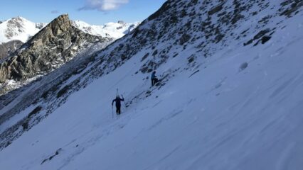 In basso la vecchia traccia era molto dura , si passava meglio nelle zone adiacenti . Da 200o mt in su un velo di neve recente e nelle zone in ombra ancora farina ( nevicata 8 dicembre) . Poi nel vallone neve variabile , con presenza di lastroni ed un leggero strato di fresca ventata .