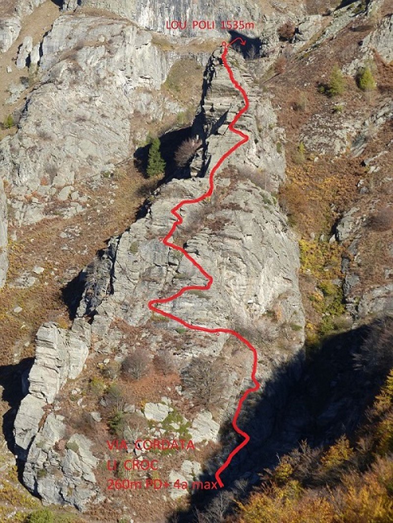 Del Rifugio proseguire fino al primo tornante della pista dove a sx si stacca una deviazione (indicazioni per vie di arrampicata). Si segue la strada che presto diventa sentiero e taglia in piano verso Ovest, aggira un costone ed entra in bosco di faggi. Attraversata una prima comba, si arriva ad una seconda più evidente, a dx (est) del caratteristico torrione roccioso denominato Lou Poli. La via inizia a sx della comba (ometti). Seguire i numerosi ancoraggi resinati a coda di porco.