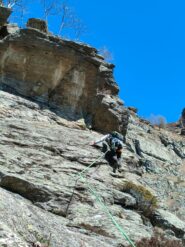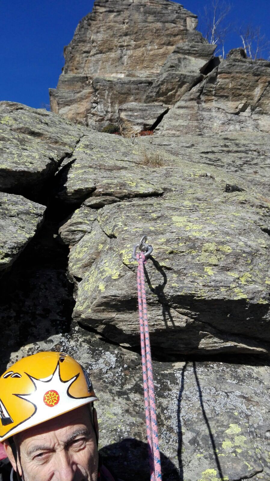 Discesa: sul versante nord con una prima doppia di 5 m (cordone con maillon, facoltativa) e una seconda doppia di 10 m (2 golfari), e poi per sentiero a sx (ovest del Poli) che torna alla base e al sentiero di accesso.