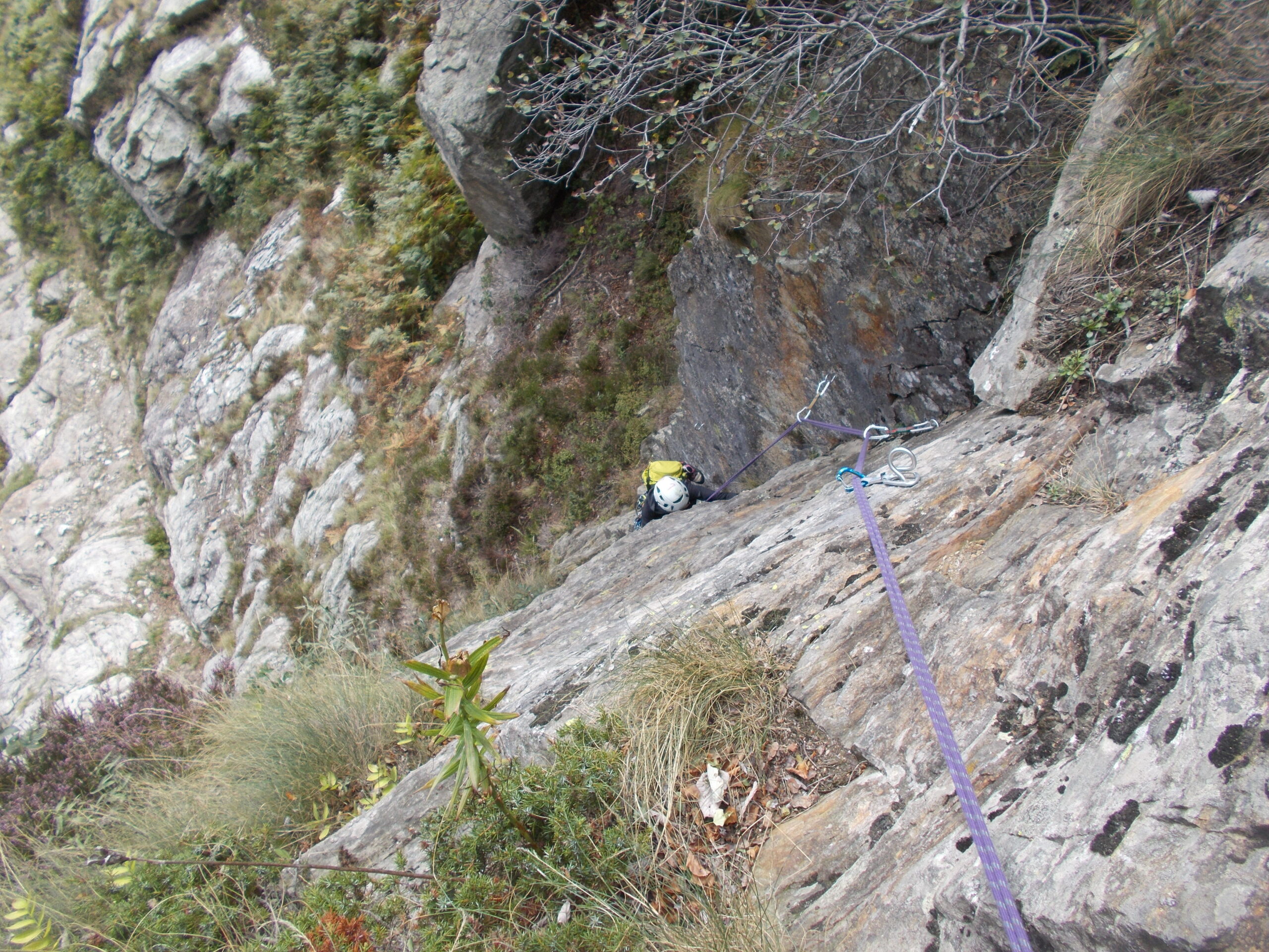 Con ancora tempo utile per salire un altra linea nei paraggi da lou nas ci spostiamo sul torrione a fianco, per vedere sta via cordata com’e’. Buona e’ stata l’impressione salendola, sufficiente e’ non perdere mai di vista le code di porco dove in ciascuna delle quali per evitare il ben che’ minimo attrito visto l’andamento a zig zag della via, abbiamo sempre introdotto un rinvio.