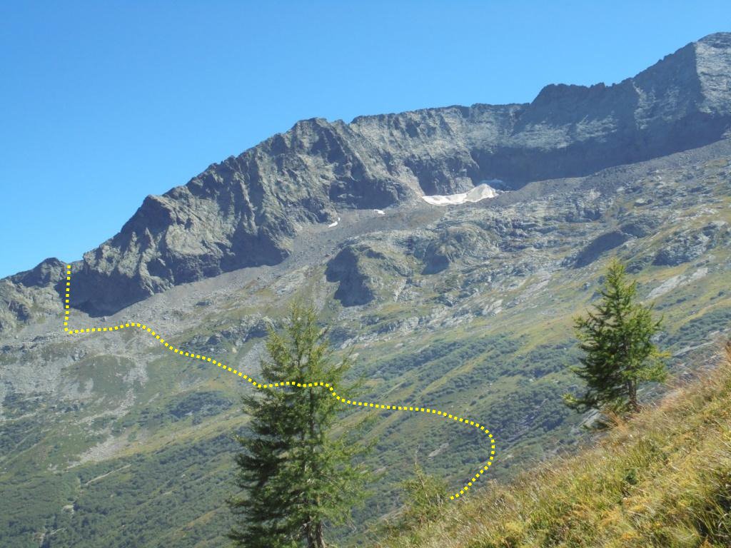 Dal lago salire direttamente attraversando un pendio di rododendri (tracce), puntare a una spalla erbosa che raggiunta dà accesso a una pietraia; si sale sempre in direzione del colle (radi ometti) con percorso non obbligato un po’ su pietraia e un po’ su pendii erbosi.