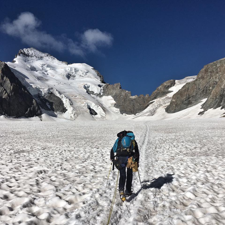 Dal pianoro sottostante il refuge des Ecrins individuare il ripido nevaietto che porta ai piedi un caratteristico couloir solitamente bagnato (picca e ramponi indispensabili).