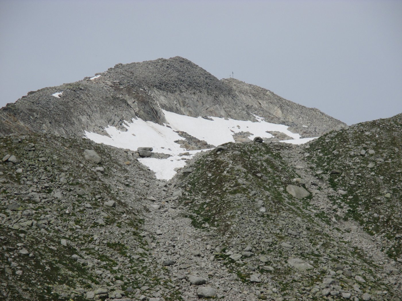 A questo punto seguire le segnalazioni biancoblu (scritta su masso) che mandano a sinistra. Seguire la traccia di sentiero che sale ripida tra sfasciumi. Tralasciare a sinistra la traccia per la Rotondohutte e continuare seguendo i numerosi ometti, tra massi e roccette fino a che gli stessi non invitano a spostarsi a sinistra.