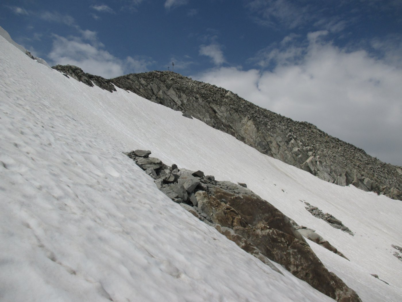 La traccia risale ora il ripido pendio roccioso detritico che, in breve, porta sulla cresta Est, su una specie di anticima.
