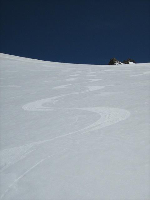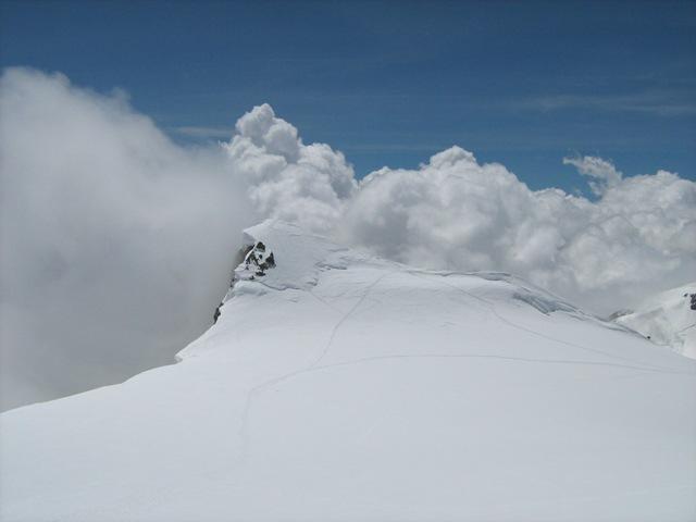 Ultima giornata sul Monte Rosa e altra splendida cavalcata sui 4.000. Partenza alle 6.15 dalla Gnifetti, alle 8.30 abbiamo raggiunto la Ludwigshohe salendo dal Colle del Lys. Si può arrivare sci ai piedi praticamente in vetta, ma nel pendio finale sono utili i coltelli, altrimenti basta togliere gli sci per 10 metri e superare il tratto più ripido. Brevissima discesa fino al Colle Zurbriggen, dove abbiamo lasciato gli sci per salire con picca e ramponi il Corno Nero. La traccia è perfetta si sale in pochissimi minuti senza problemi nonostante la pendenza. Tornati al colletto siamo scesi fino al ripiano sotto il Balmenhorn e in 2 minuti abbiamo raggiunto anche questa cima sfruttando il tratto attrezzato. Altra breve discesa fino al Colle Vincent dove abbiamo ripellato e siamo saliti alla Piramide Vincent (utili i coltelli), ultima fatica di giornata. Da qui solo più discesa fino al Gabiet!!! Discesa iniziata alle 11, il pendio finale della Vincent è bellissimo anche se la neve non aveva ancora mollato, poi firn da urlo fin sotto il Mantova. Da quota 3100-3200 si inizia a sfondare un po’ e il pendio è costellato di fastidiose rigole. Seguendo per errore alcune tracce abbiamo sbagliato via di discesa e ci siamo tenuti troppo a sinistra. Abbiamo così dovuto superare una piccola fascia rocciosa calandoci per sicurezza con la corda, poi siamo riusciti a rientrare sulla traccia corretta un po’ sopra il canale dell’Aquila che è ancora in buone condizioni, con neve compatta e sciabilissima. Poi si spinge un po’ per arrivare al lago e quindi si tolgono gli sci per circa 10-15 minuti risalendo fino a scollinare e passare nel vallone dove sale la cabinovia del Gabiet. Da qui noi, anziché scendere a piedi lungo la stradina, abbiamo attraversato il vallone raggiungendo la pista di discesa e così facendo siamo arrivati sci ai piedi a 5-10 minuti dalla cabinovia!!!
