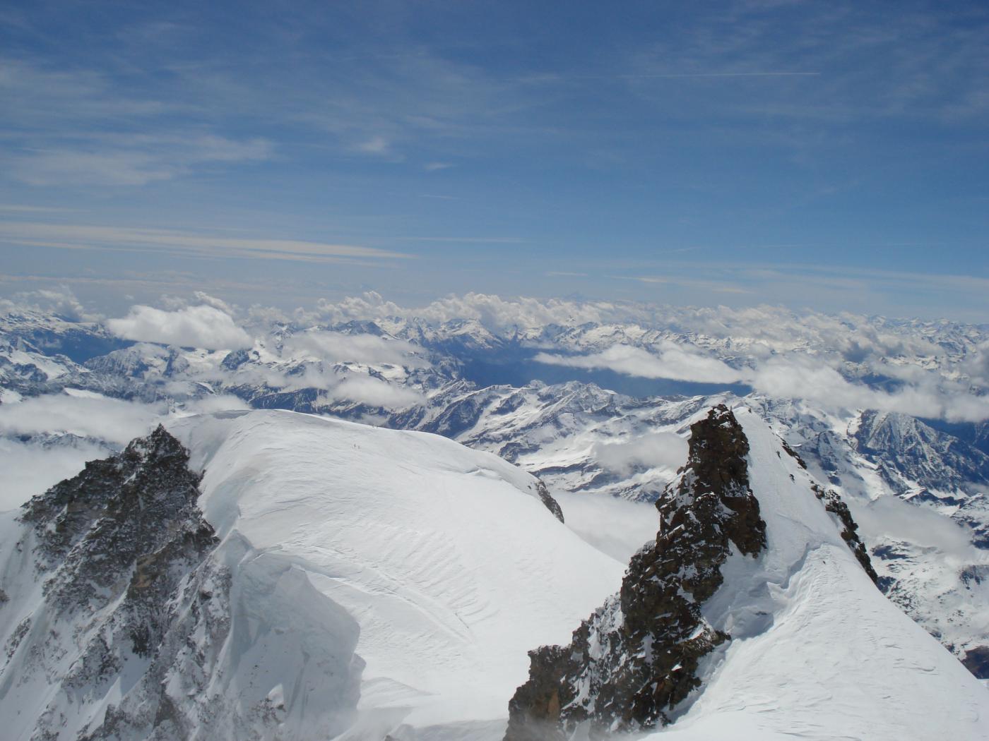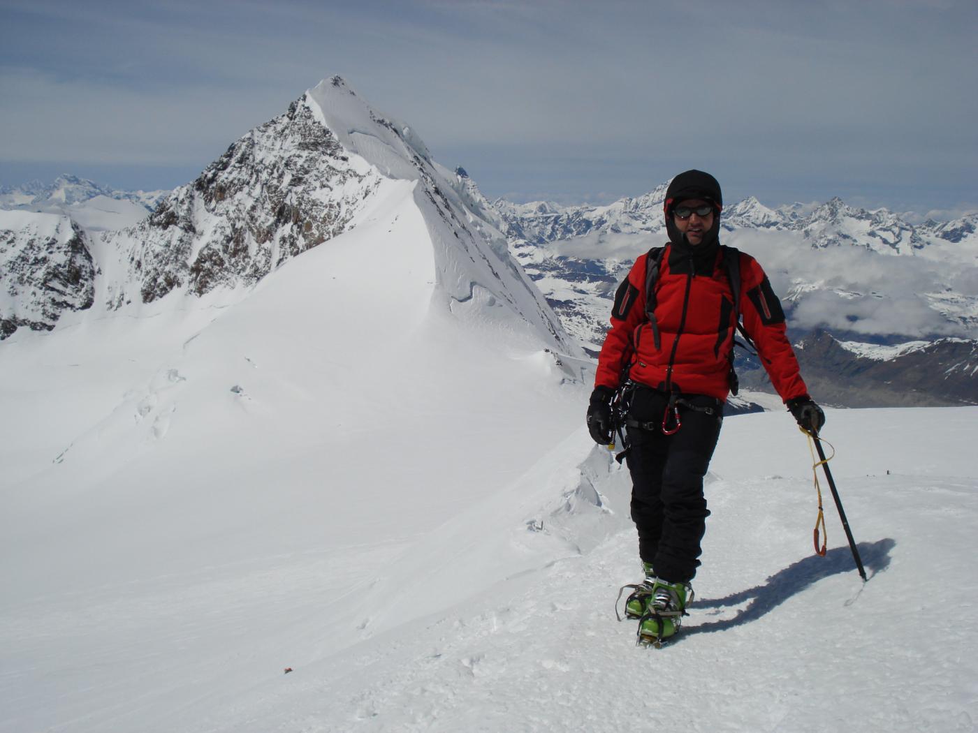 Salita di grande soddisfazione ai 4.342 metri di quota della Ludwigshohe. Approfittando dell’occasione offerta dal Trofeo Mezzalama con apertura degli impianti per punta Indren anticipata alla 4 e per di più gratuita, siamo saliti fino a quota 3.300. Freddo e raffiche di vento fortissime hanno fatto desistere molti e quest’anno le punte del gruppo del Rosa sono state sicuramente meno frequentate rispetto alle precedenti edizioni del Trofeo Mezzalama (complimenti agli atleti veramente eccezionali e velocissimi nella salita al rifugio Mantova dove era stato piazzato il primo “cancello”). Il canale che da punta Indren porta alle pendici della Piramide Vincent appariva molto carico e con una grossa cornice sovrastante. Nessuno aveva ancora “osato” tracciarlo e anche noi prudentemente abbiamo aggirato l’ostacolo seguendo il classico percorso che passa dai rifugi Mantova e Gnifetti per poi proseguire verso il ghiacciaio del Lys. Nel frattempo il vento è leggermente calato mentre il cielo si manteneva soleggiato. Per raggiungere la Ludwihshohe abbiamo aggirato il Balmenhorn battendo anche traccia da quota 4.100 quasi fino alla vetta. Superato qualche piccolo crepaccio parzialmente coperto nell’ultimo tratto. Tolti gli sci al riparo di una provvidenziale grossa cornice abbiamo raggiunto la vetta con ramponi e picca. Spettacolare il panorama ma il forte vento e il freddo ci hanno costretto a scappare via dopo le foto di rito, scattate a rischio di congelamento. La vicinissima Parrot si presentava con ampi lastroni di ghiaccio vivo e non abbiamo notato alcuna traccia di salita. Discesa spettacolare per la neve bellissima ma nei primi 200 metri occorre fare attenzione ai crepacci invisibili dall’alto. Siamo scesi nel ripido pendio tra il Corno Nero e il Balmenhorn saltando letteralmente sul piccolo crepaccio sommitale. Ancora farina fino al rifugio Mantova dove ci siamo riposati qualche minuto e poi la lunghissima discesa fino a Staffal su neve sempre più pesante ma comunque sciabilissima. Tempo in peggioramento con pioggia nel finale. Il canalino dell’Aquila è ancora perfettamente innevato. Si arriva al piazzale di Staffal praticamente sci ai piedi anche se negli ultimi tratti di pista bisogna portare gli sci per alcune centinaia di metri (lineari). Una giornata da ricordare con Luca, Danilo e Vincenzo. Complimenti ai campioni del “Trofeo Mezzalama” e un saluto a tutti gli amici incontrati in alta quota.