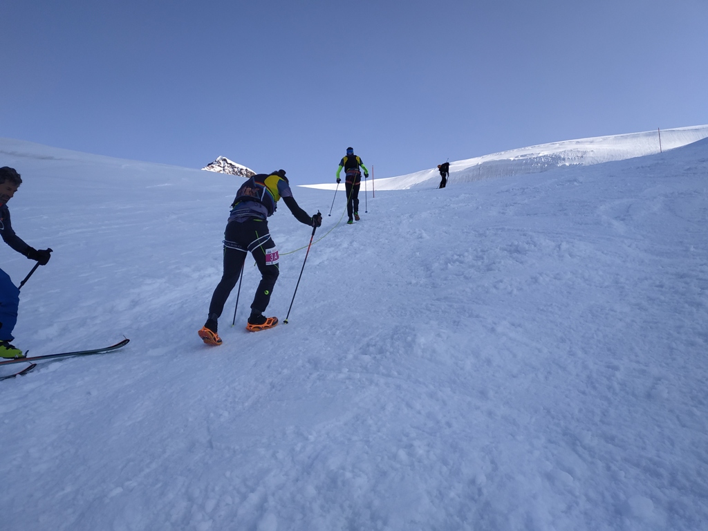 Ghiacciai in ottime condizioni. Oggi grazie alla monterosa sky marathon, con orario funivie anticipato e sconto 30%, tutte le cime sono state prese d’assalto, eccetto la Dufour. Anche i Liskamm ora sono tracciati, alcune cordate riferiscono che è stata percorsa la traversata in ambo i sensi. Dalla Indren, su per il ripido canalino di destra, ma dopo che sono volate giù alcune persone malamente attrezzate, gli addetti alla gara hanno deviato tutti gli spettatori verso il Mantova. Mentre risalivo il canale sono stato sfiorato da 2 persone venute giù come dei missili. Considerate le condizioni sicure dei ghiacciai non ci siamo legati.