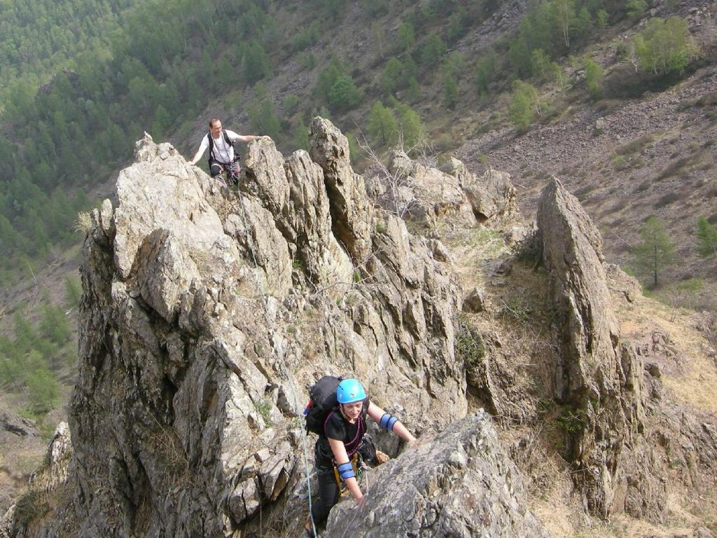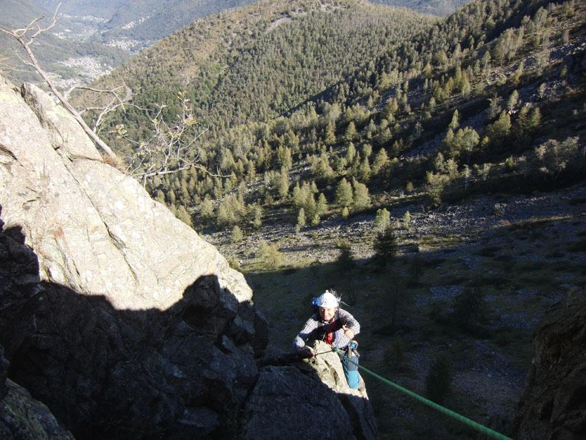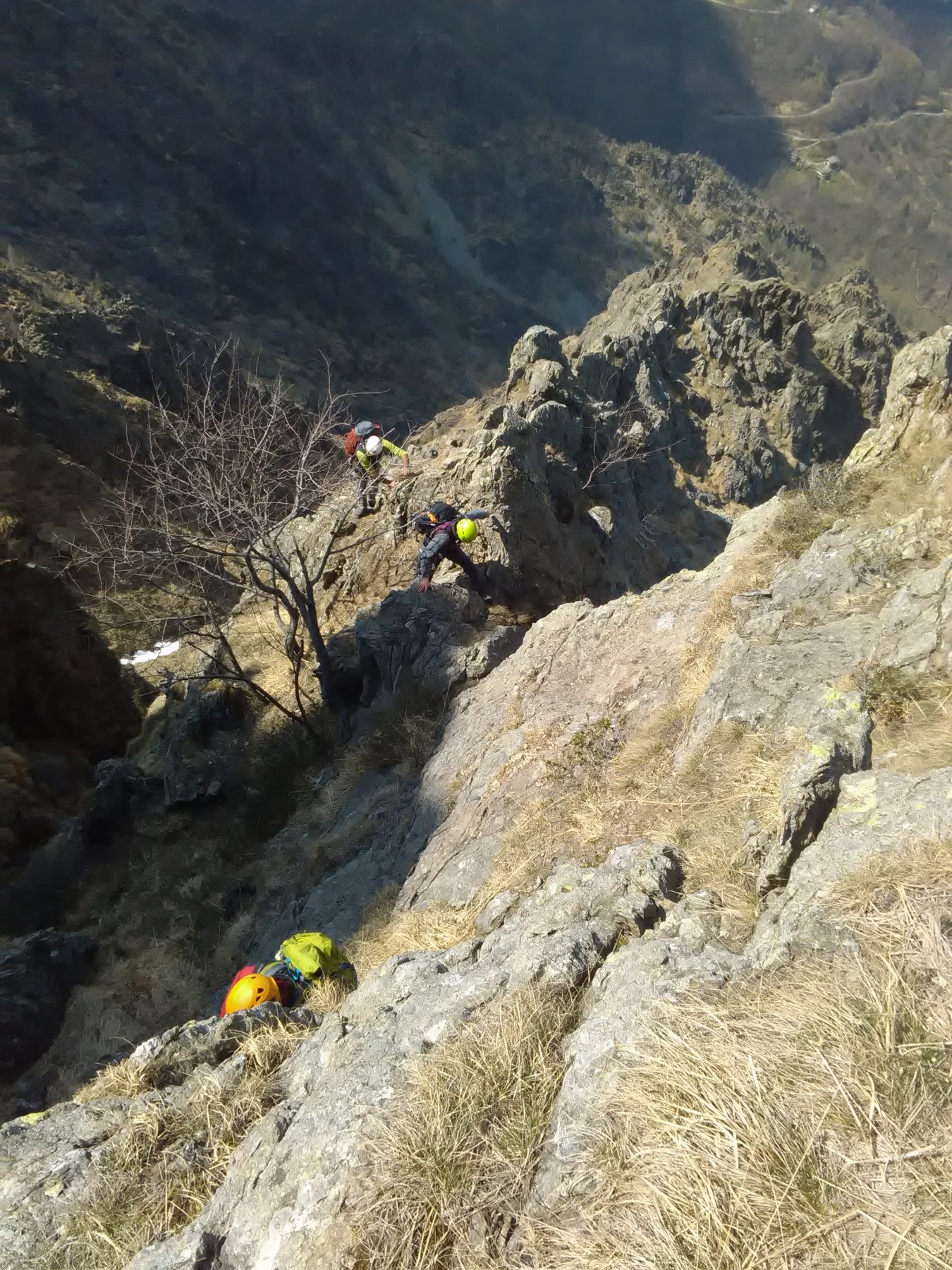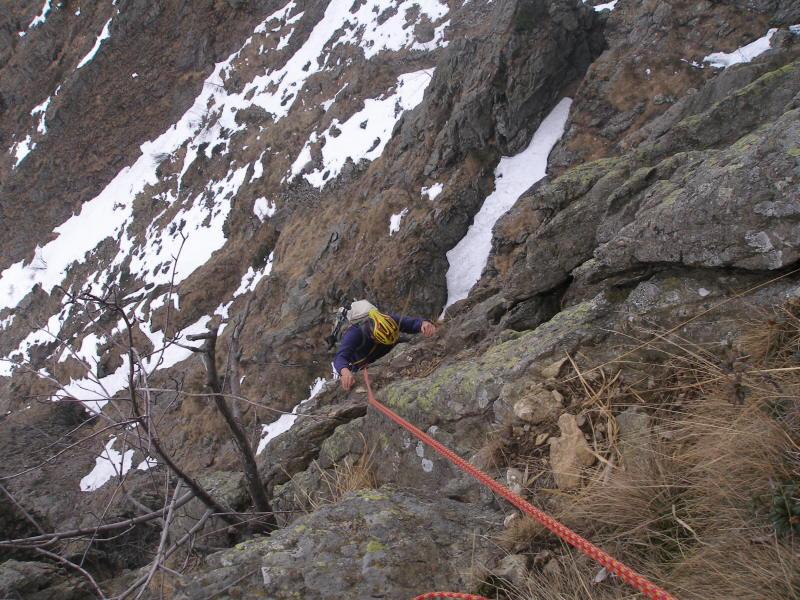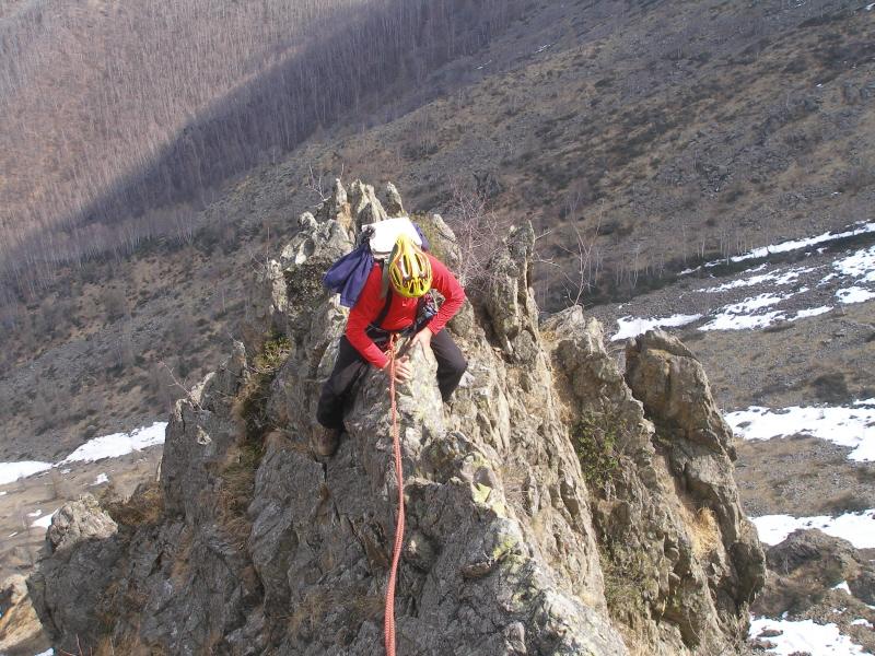 Si può scendere lungo una paretina verticale, leggermente strapiombante negli ultimi 2-3m (III), cui segue il facile scavalcamento di un cocuzzolo, e la successiva discesa al marcato intaglio a monte (II/II+); in alternativa si possono effettuare una/due doppie, di 10/12 m (soste chiodi o fix con catene).