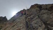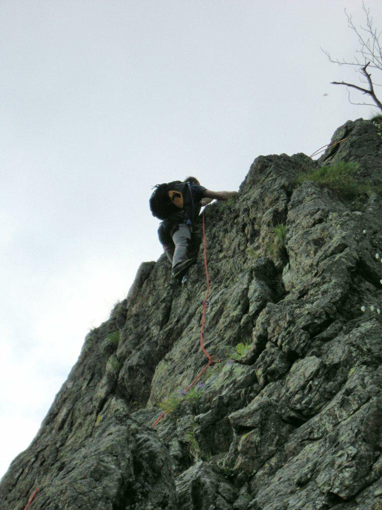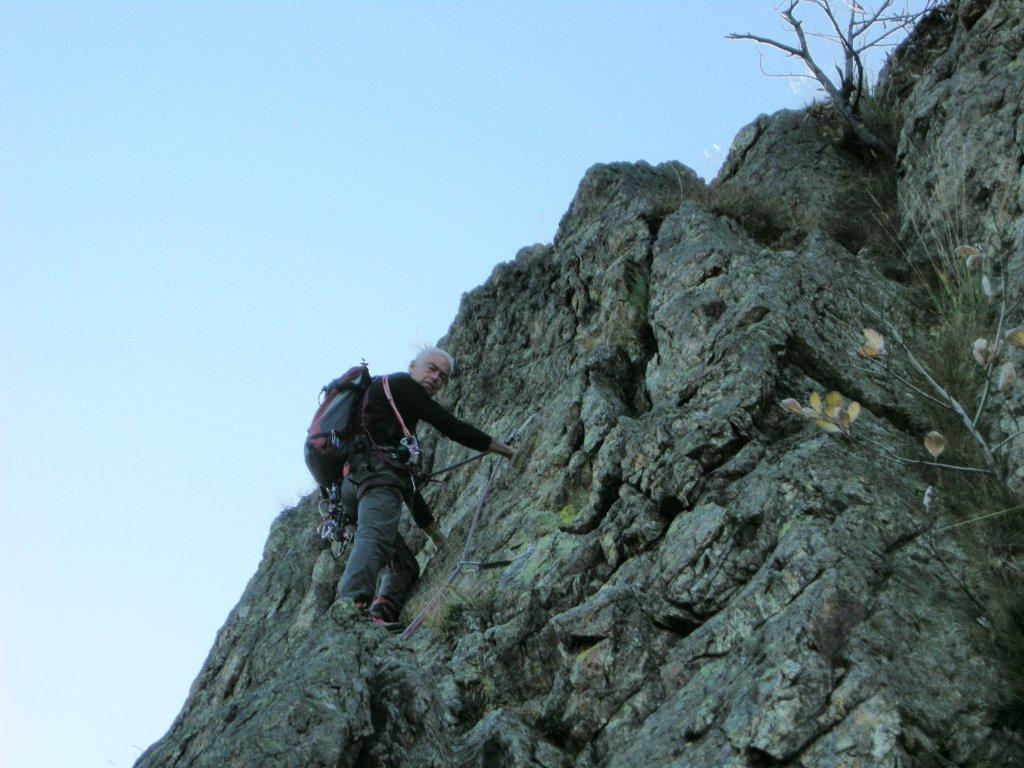 Segue un tratto più facile e quasi pianeggiante che porta ad un marcato colletto (cordone per una doppia sul versante NE, possibile via di fuga) e quindi al salto verticale finale sotto la spalla: la “Placca Santi”; questa si supera direttamente (20m, esposto, verticale ma appigliato, 1 fix, 4 chiodi, III/III+) con una salita leggermente obliqua verso sinistra (al termine sosta su 2 spit e catena).