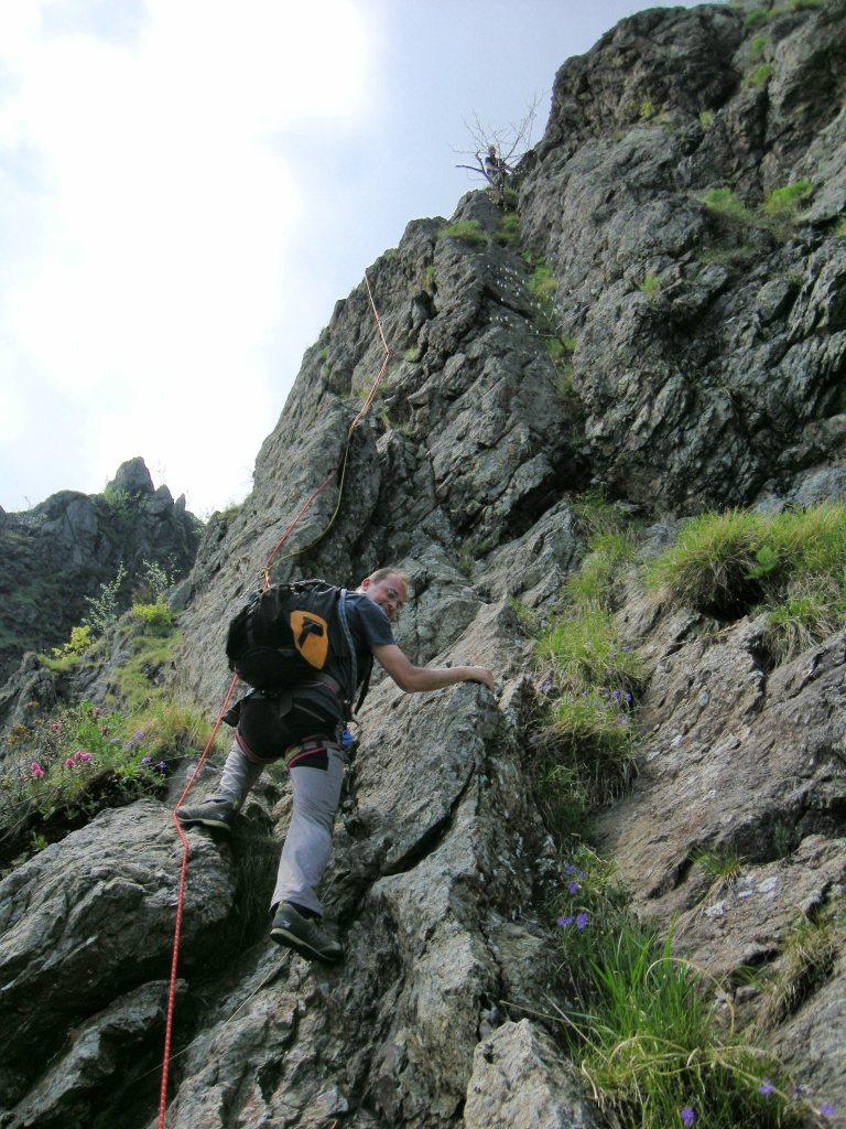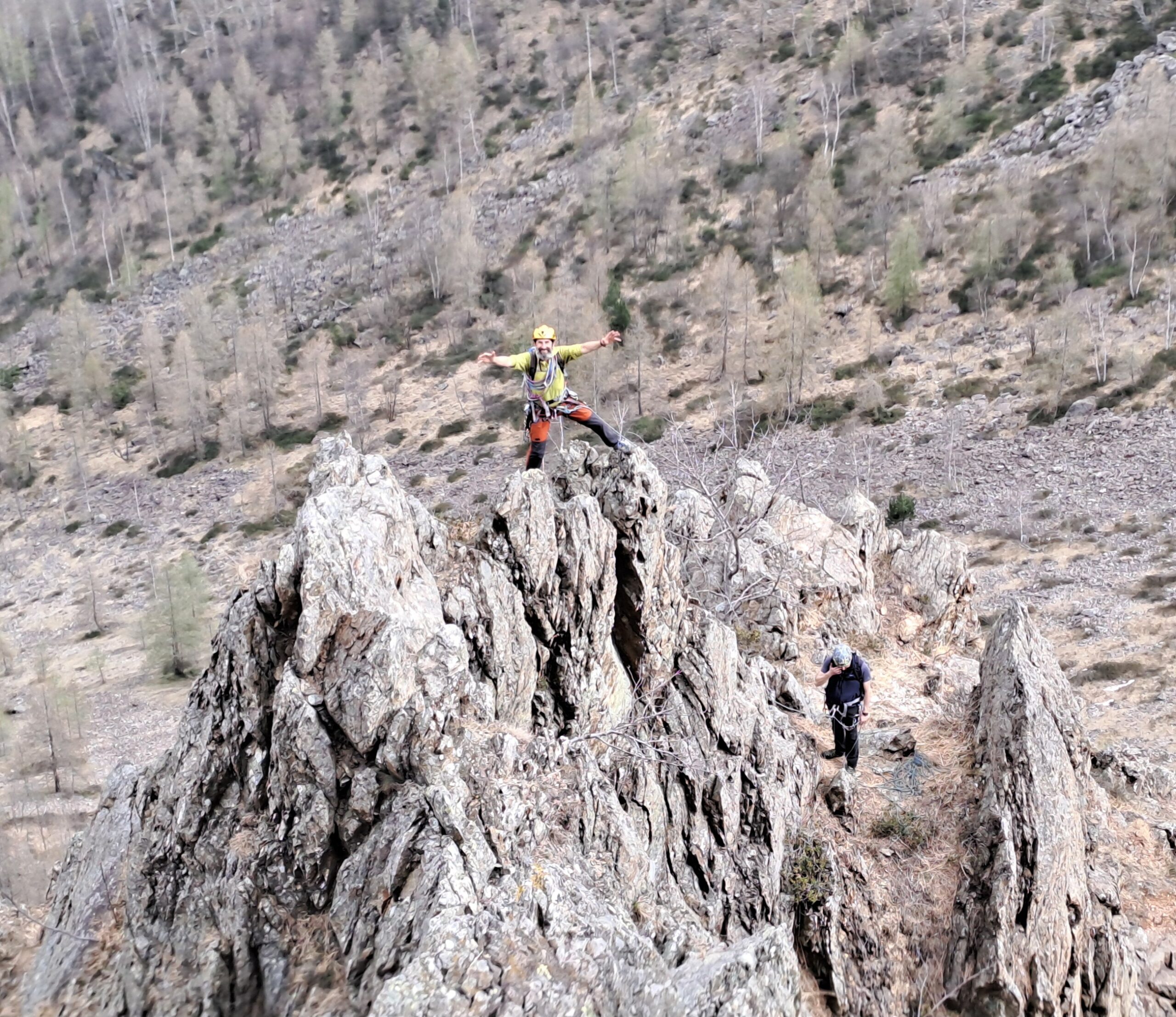 Si sale frontalmente il primo per brevi placche, un canaletto, e una spaccatura, fino alla sommità (30m, 2 chiodi, III) e per rocce ripide ed esposte, ma appigliate (III), si perviene all’intaglio tra i due dentini; come variante si possono evitare gli ultimissimi metri del dentino, piegando verso sinistra direttamente all’intaglio. Da quest’ultimo, dapprima per il filo di cresta (1 ch.) e poi con un breve aggiramento a sinistra, si raggiunge in breve il secondo dentino.