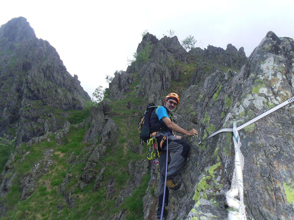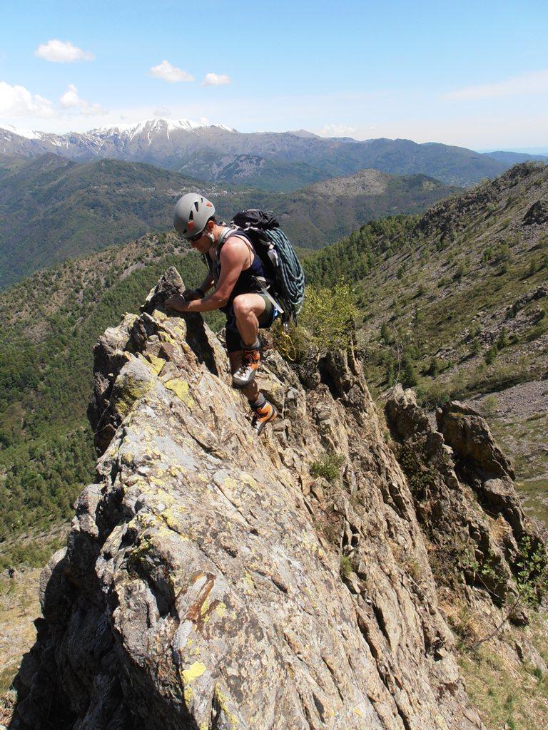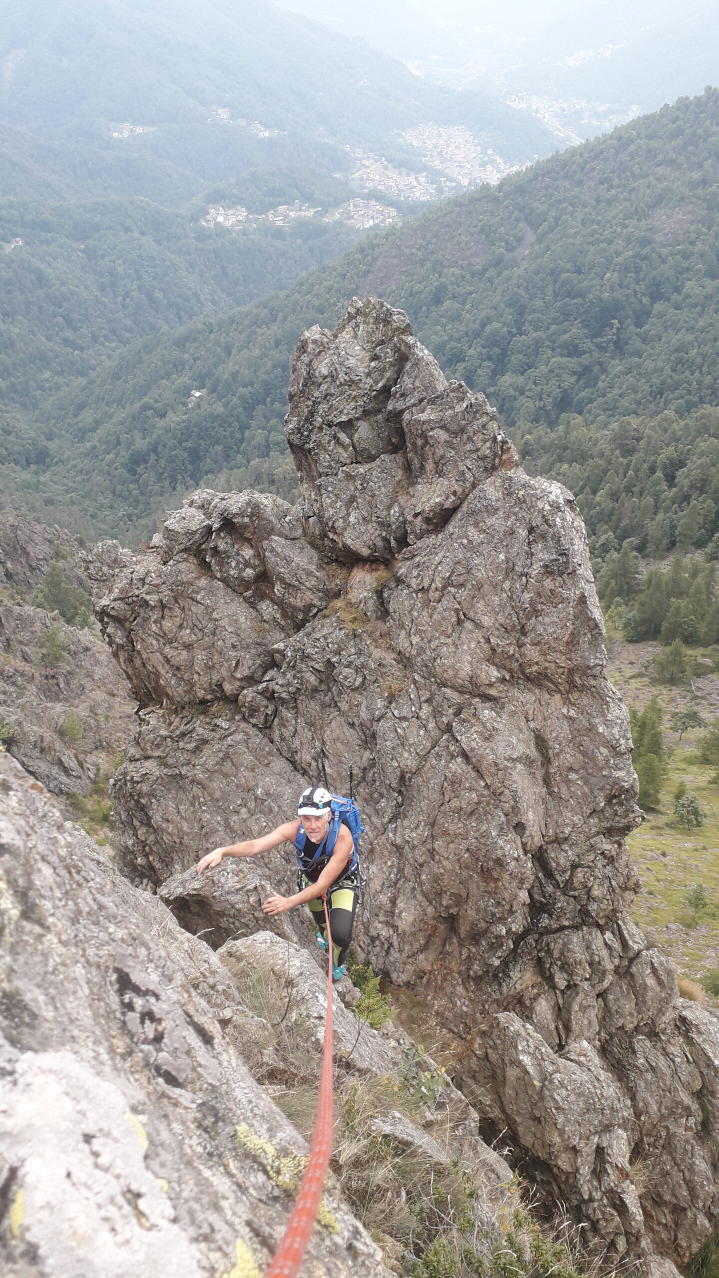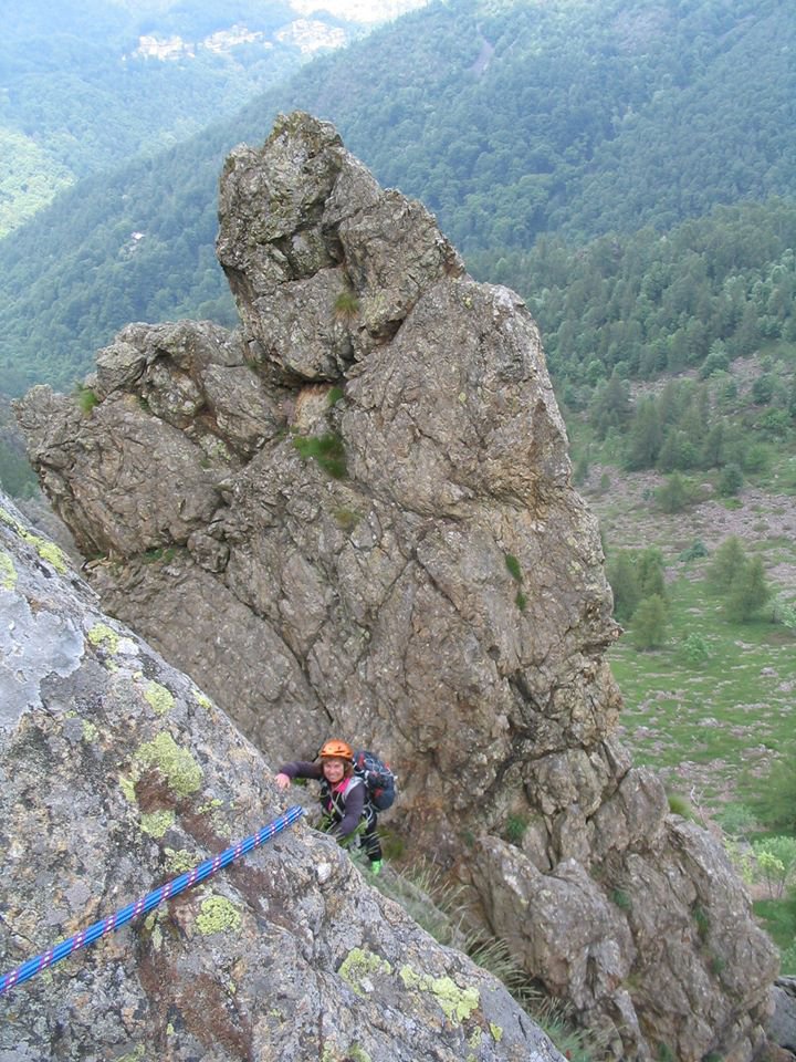 Il secondo lungo tratto della cresta è mediamente di facile percorso (qualche breve passo fino al II, percorribile “in conserva”), con un susseguirsi di rocce, erba, alcune brevi paretine, qualche divertente e breve crestina affilata. Si arriva così alla sommità di un marcato rilievo, ben oltre la metà della cresta; da questo si stacca (sul suo lato ovest) un lungo crestone che orograficamente è la vera cresta nord delle Lunelle.