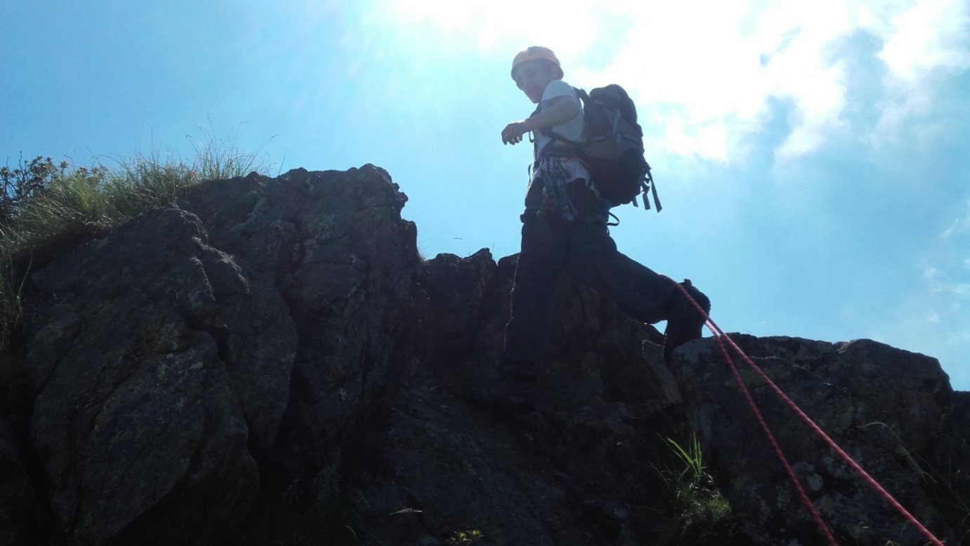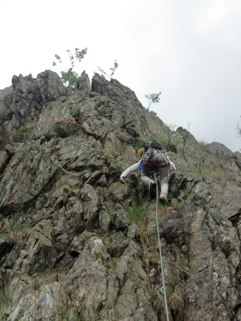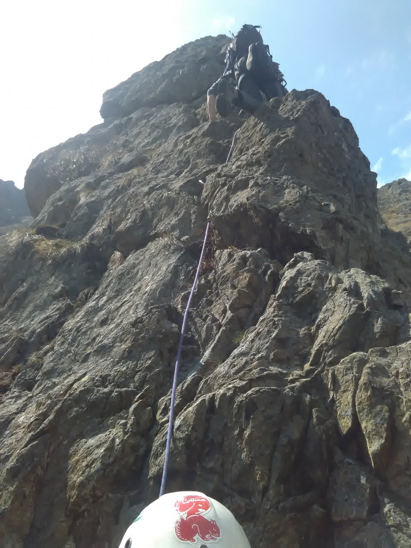Il secondo lungo tratto della cresta è mediamente di facile percorso (qualche breve passo fino al II, percorribile “in conserva”), con un susseguirsi di rocce, erba, alcune brevi paretine, qualche divertente e breve crestina affilata. Si arriva così alla sommità di un marcato rilievo, ben oltre la metà della cresta; da questo si stacca (sul suo lato ovest) un lungo crestone che orograficamente è la vera cresta nord delle Lunelle.