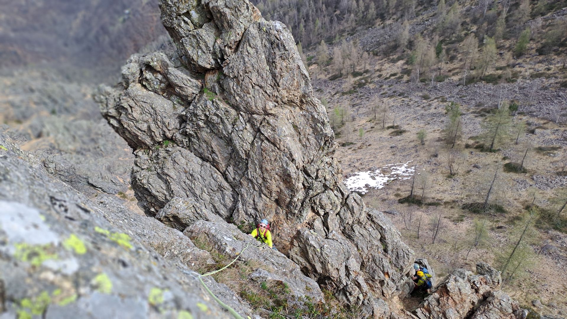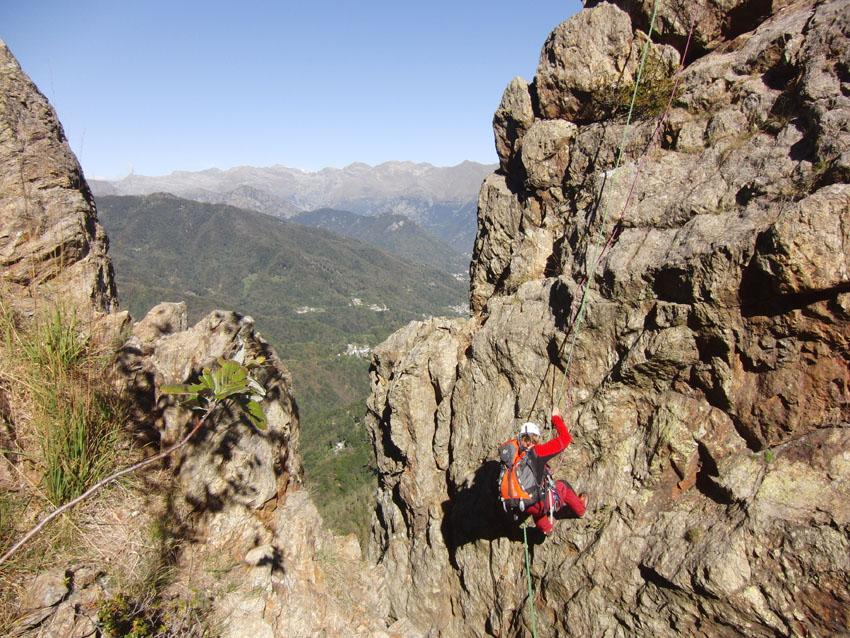 Si può scendere in doppia (10 m, sosta fix con catena) oppure lungo un corto diedro sulla sinistra, cui seguono una traversata a destra (3-4m) di una placca inclinata e una larga spaccata sul grosso masso incastrato sull’intaglio a monte del dentino (III delicato ed esposto).