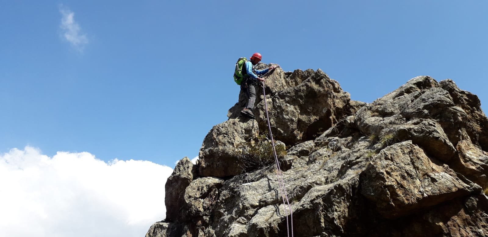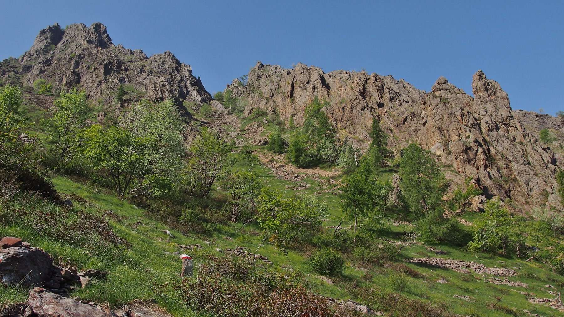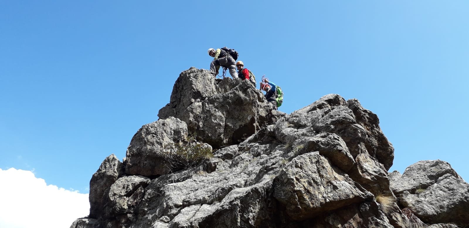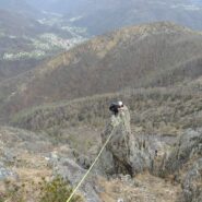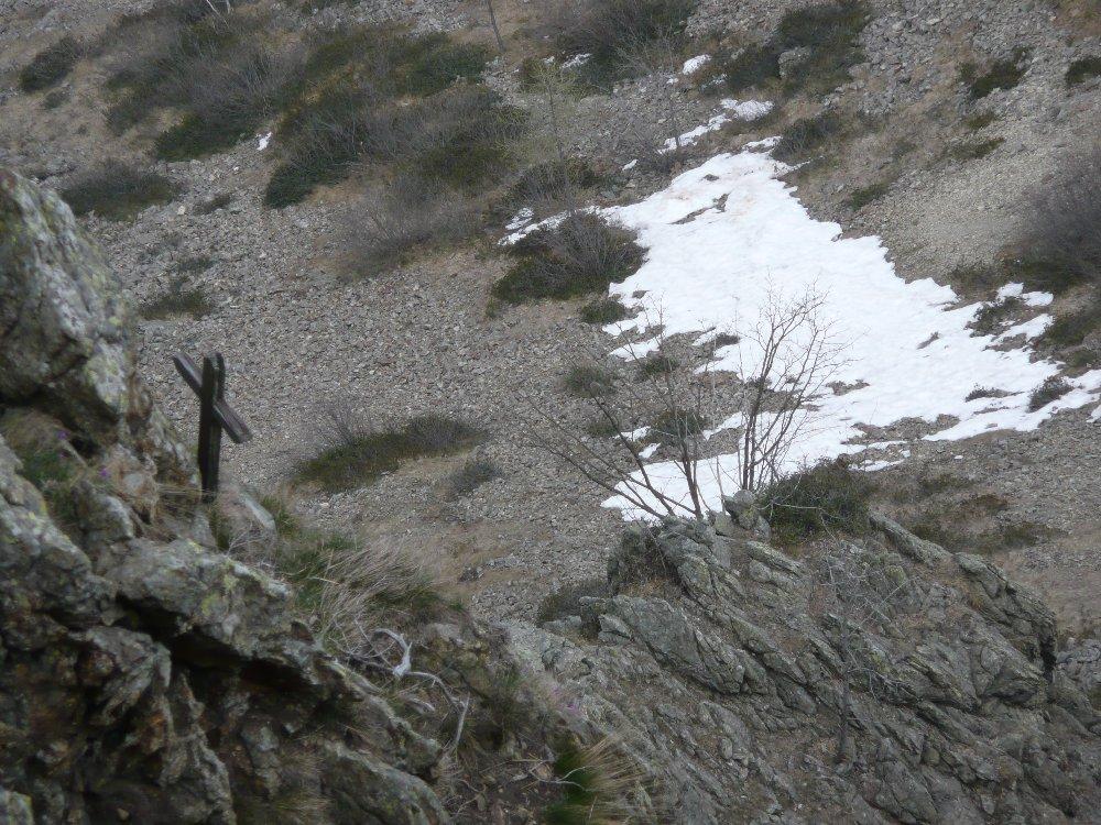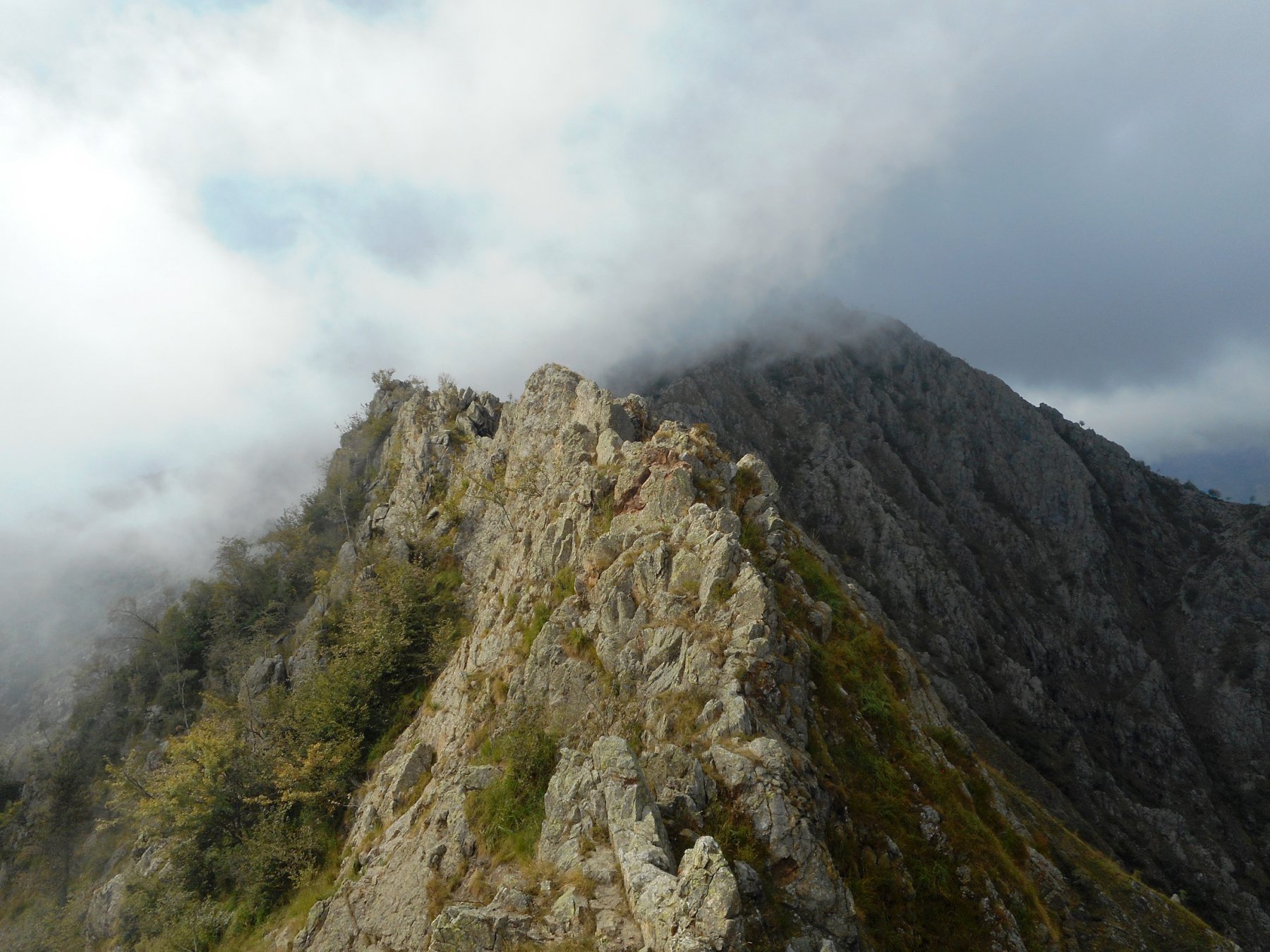 Discesa: da fare con attenzione (facili ravanamenti) per tracce di sentiero, roccette e erba scivolosa, che zigzagano sul ripidissimo versante sud (possibilità di calarsi con una doppia nel primo tratto). Raggiunto il colletto sottostante (cartello) scendere verso N per tracce di sentiero e pietraie fino ad incrociare la traccia percorsa durante l’avvicinamento.