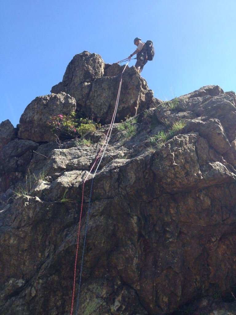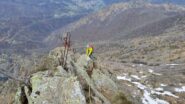 Su facile terreno verso destra si riprende il filo di cresta, si tocca la spalla (croce), e si raggiunge in breve la vetta.